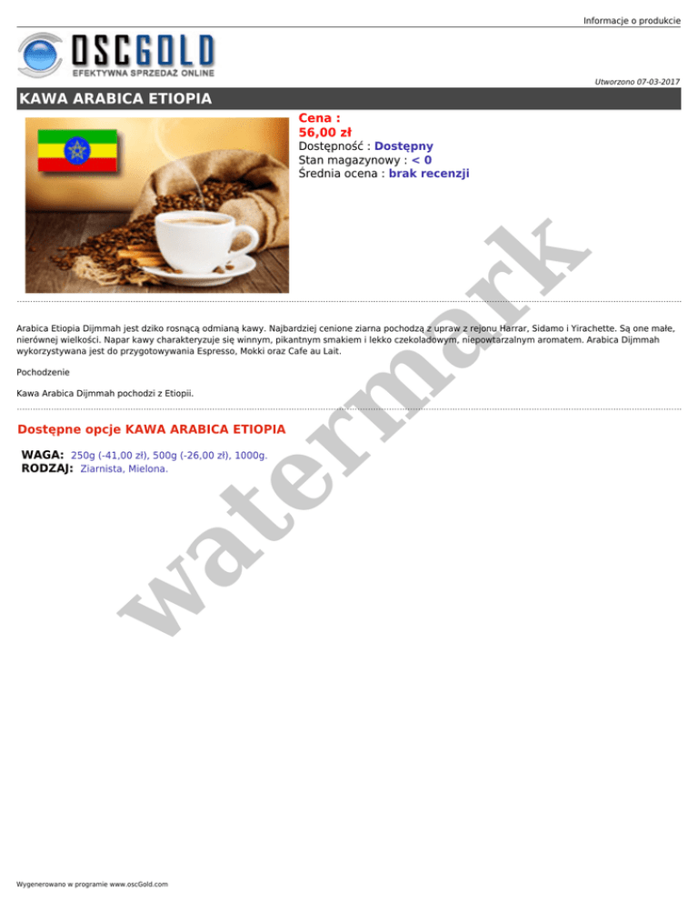 Informacje o produkcie Utworzono 07-03-2017 KAWA ARABICA ETIOPIA Cena : 56,00 zł er m ar k Dostępność : Dostępny Stan magazynowy : < 0 Średnia ocena : brak recenzji Arabica Etiopia Dijmmah jest dziko rosnącą odmianą kawy. Najbardziej cenione ziarna pochodzą z upraw z rejonu Harrar, Sidamo i Yirachette. Są one małe, nierównej wielkości. Napar kawy charakteryzuje się winnym, pikantnym smakiem i lekko czekoladowym, niepowtarzalnym aromatem. Arabica Dijmmah wykorzystywana jest do przygotowywania Espresso, Mokki oraz Cafe au Lait. Pochodzenie Kawa Arabica Dijmmah pochodzi z Etiopii. Dostępne opcje KAWA ARABICA ETIOPIA w at WAGA: 250g (-41,00 zł), 500g (-26,00 zł), 1000g. RODZAJ: Ziarnista, Mielona. Wygenerowano w programie www.oscGold.com