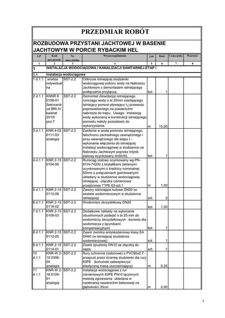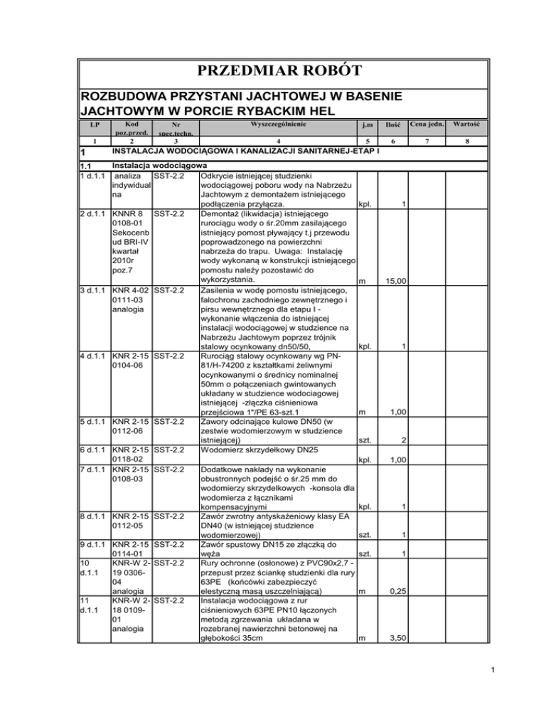 PRZEDMIAR ROBÓT ROZBUDOWA PRZYSTANI JACHTOWEJ W BASENIE JACHTOWYM W PORCIE RYBACKIM HEL LP 1 1 Kod poz.przed. 2 Nr spec.techn. 3 Wyszczególnienie j.m Ilość Cena jedn. Wartość 4 5 6 7 8 INSTALACJA WODOCIĄGOWA I KANALIZACJI SANITARNEJ-ETAP I Instalacja wodociągowa 1.1 1 d.1.1 analiza SST-2.2 Odkrycie istniejącej studzienki indywidual wodociągowej poboru wody na Nabrzeżu na Jachtowym z demontażem istniejącego podłączenia przyłącza. 2 d.1.1 KNNR 8 SST-2.2 Demontaż (likwidacja) istniejącego 0108-01 rurociągu wody o śr.20mm zasilającego Sekocenb istniejący pomost pływający t.j przewodu ud BRI-IV poprowadzonego na powierzchni kwartał nabrzeża do trapu. Uwaga: Instalację 2010r wody wykonaną w konstrukcji istniejącego poz.7 pomostu należy pozostawić do wykorzystania. 3 d.1.1 KNR 4-02 SST-2.2 Zasilenia w wodę pomostu istniejącego, 0111-03 falochronu zachodniego zewnętrznego i analogia pirsu wewnętrznego dla etapu I wykonanie włączenia do istniejącej instalacji wodociągowej w studzience na Nabrzeżu Jachtowym poprzez trójnik stalowy ocynkowany dn50/50, 4 d.1.1 KNR 2-15 SST-2.2 Rurociąg stalowy ocynkowany wg PN0104-06 81/H-74200 z kształtkami żeliwnymi ocynkowanymi o średnicy nominalnej 50mm o połączeniach gwintowanych układany w studzience wodociagowej istniejącej -złączka ciśnieniowa przejściowa 1"/PE 63-szt.1 5 d.1.1 KNR 2-15 SST-2.2 Zawory odcinające kulowe DN50 (w 0112-06 zestwie wodomierzowym w studzience istniejącej) 6 d.1.1 KNR 2-15 SST-2.2 Wodomierz skrzydełkowy DN25 0118-02 7 d.1.1 KNR 2-15 SST-2.2 Dodatkowe nakłady na wykonanie 0108-03 obustronnych podejść o śr.25 mm do wodomierzy skrzydelkowych -konsola dla wodomierza z łącznikami kompensacyjnymi 8 d.1.1 KNR 2-15 SST-2.2 Zawór zwrotny antyskażeniowy klasy EA 0112-05 DN40 (w istniejącej studzience wodomierzowej) 9 d.1.1 KNR 2-15 SST-2.2 Zawór spustowy DN15 ze złączką do 0114-01 węża 10 KNR-W 2- SST-2.2 Rury ochronne (osłonowe) z PVC90x2,7 d.1.1 19 0306przepust przez ściankę studzienki dla rury 04 63PE (końcówki zabezpieczyć analogia elestyczną masą uszczelniającą) 11 KNR-W 2- SST-2.2 Instalacja wodociągowa z rur d.1.1 18 0109ciśnieniowych 63PE PN10 łączonych 01 metodą zgrzewania układana w analogia rozebranej nawierzchni betonowej na głębokości 35cm kpl. m kpl. m 1 15,00 1 1,00 szt. 2 kpl. 1,00 kpl. 1 szt. 1 szt. 1 m 0,25 m 3,50 1 1 2 3 12 d.1.1 KNR 4-01 SST 0212-03 13 d.1.1 KNR 4-01 SST 0203-04 14 d.1.1 KNR-W 2- SST-2.2 15 011206 analogia 15 d.1.1 KNR-W 2- SST-2.2 15 013002 KNR-W 2- SST-2.2 15 011002 analogia 16 d.1.1 17 d.1.1 18 d.1.1 19 d.1.1 20 d.1.1 21 d.1.1 22 d.1.1 23 d.1.1 KNR-W 2- SST-2.2 15 013002 analogia KNR-W 2- SST-2.2 15 011205 analogia KNR-W 215 013002 KNR-W 215 011002 analogia KNR-W 215 013002 analogia KNR 2-19 0120-01 analogia SST-2.2 SST-2.2 SST-2.2 SST-2.2 KNR 4-02 SST-2.2 0111-01 analogia 4 5 6 7 8 Rozbiórka nwierzchni betonowej 0,6*0,35*3,5 Odtworzenie nawierzchni betonowej m3 0,74 0,6*0,35*3,5 Instalacja wodociągowa z rur ciśnieniowych 63PE PN10 łączonych metodą zgrzewania układanych wzdłuż Falochronu Zachodniego osłoniętych od góry żelbetowym prefabrykatem (w opracowaniu hydrotechnicznym) oraz pod istniejacym podestem -trójnik 63/25PE (zasilanie istniejącej instalacji wodociągowej na istniejącym pomoście) węzeł W2 Zawór odcinający kulowy DN20 (z mosiądzu) montowany od strony nabrzeża Rurociągi z węży elastycznych przeznaczonych do wody pitnej (PCV) DN20 PN10bar (np GAMRAT-Hydro) /Odcinek łączący instalację prowadzoną na nabrzeżu z istniejącym pomostem pływającym/ Szybkozłączka fi 20 (połączenie rury 25PE z przewodem elastycznym DN20) m3 0,74 m 13,80 szt. m kpl. Instalacja wodociągowa z rur ciśnieniowych 50PE PN10 łączonych metodą zgrzewania układanych wzdłuż Falochronu Zachodniego osłoniętych od góry żelbetowym prefabrykatem (w opracowaniu hydrotechnicznym) redukcja 63PE/50PE-szt.1 -trójnik 50/25PE (zasilanie instalacji wodociągowej na projektowanym pomoście)-węzeł W3 Zawór odcinający kulowy DN20 (z mosiądzu) montowany od strony nabrzeża Rurociągi z węży elastycznych przeznaczonych do wody pitnej (PCV) DN20 PN10bar (np GAMRAT-Hydro) /Odcinek łączący instalację prowadzoną Szybkozłączka fi 20 (połączenie rury 25PE z przewodem elastycznym DN20) m szt. m kpl. Przewód wody z rur ciśnieniowych 32PE PN10 prowadzony w przepuście instalacyjnym projektowanego pomostu m pływającego Podłączenie słupków z dwoma zaworami czerpalnymi będącymi elementami wyposażenia pomostu do przewodu ułożonego w pomoście Dodatkowo punkty poboru wyposażyć: -w węże do dystrybucji wody -oraz wieszaki do węży kpl. 1 6,50 2 58,60 1 6,50 2 76,00 4 2 1 24 d.1.1 25 d.1.1 26 d.1.1 27 d.1.1 28 d.1.1 2 3 KNR-W 2- SST-2.2 15 013002 KNR-W 2- SST-2.2 15 011204 analogia KNR-W 2- SST-2.2 15 013501 KNR-W 2- SST-2.2 18 010901 analogia 29 d.1.1 KNR-W 2- SST-2.2 19 030602 analogia KNR 4-01 SST-2.2 0212-03 30 d.1.1 KNR 4-01 SST-2.2 0203-04 31 d.1.1 KNR-W 2- SST-2.2 15 011203 analogia KNR-W 2- SST-2.2 15 011202 analogia KNR 2-15 SST-2.2 0613-01 analogia 32 d.1.1 33 d.1.1 34 d.1.1 35 d.1.1 KNR-W 2- SST-2.2 15 013002 KNNR 4 SST-2.2 1606-01 36 d.1.1 KNR 2-18 SST-2.2 9913b-01 4 5 6 7 8 Zawory antyskażeniowe typu HA DN20 /na wylocie zaworów czerpalnych/ szt. Instalacja wodociągowa z rur ciśnieniowych 40PE PN10 łączonych metodą zgrzewania układanych wzdłuż Falochronu Zachodniego osłoniętych od góry żelbetowym prefabrykatem (w opracowaniu hydrotechnicznym) redukcja 50PE/40PE-szt.1 -kolano 90st 40PE-szt.2 -kolano 30st 40PE-szt.3 trójnik 40/20PE (spust) -węzeł W4 Zawory spustowe ze złączką do węża DN15 (z mosiądzu) /węzeł W4/ m szt. Instalacja wodociągowa z rur ciśnieniowych 32PE PN10 łączonych metodą zgrzewania przechodząca przez pochylnię w rejonie nasady Pirsu Wewnętrznego w rozebranej nawierzchni m betonowej na głębokości 18cm Rury ochronne (osłonowe) z P