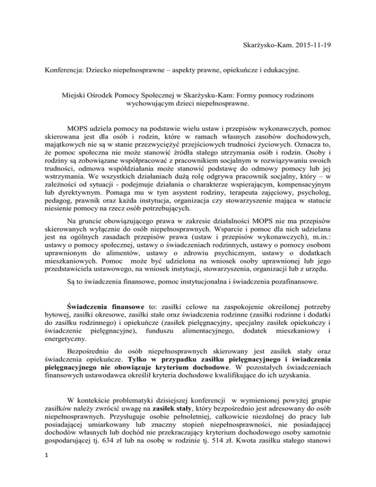 Skarżysko-Kam. 2015-11-19 Konferencja: Dziecko niepełnosprawne – aspekty prawne, opiekuńcze i edukacyjne. Miejski Ośrodek Pomocy Społecznej w Skarżysku-Kam: Formy pomocy rodzinom wychowującym dzieci niepełnosprawne. MOPS udziela pomocy na podstawie wielu ustaw i przepisów wykonawczych, pomoc skierowana jest dla osób i rodzin, które w ramach własnych zasobów dochodowych, majątkowych nie są w stanie przezwyciężyć przejściowych trudności życiowych. Oznacza to, że pomoc społeczna nie może stanowić źródła stałego utrzymania osób i rodzin. Osoby i rodziny są zobowiązane współpracować z pracownikiem socjalnym w rozwiązywaniu swoich trudności, odmowa współdziałania może stanowić podstawę do odmowy pomocy lub jej wstrzymania. We wszystkich działaniach dużą rolę odgrywa pracownik socjalny, który – w zależności od sytuacji - podejmuje działania o charakterze wspierającym, kompensacyjnym lub dyrektywnym. Pomaga mu w tym asystent rodziny, terapeuta zajęciowy, psycholog, pedagog, prawnik oraz każda instytucja, organizacja czy stowarzyszenie mająca w statucie niesienie pomocy na rzecz osób potrzebujących. Na gruncie obowiązującego prawa w zakresie działalności MOPS nie ma przepisów skierowanych wyłącznie do osób niepełnosprawnych. Wsparcie i pomoc dla nich udzielana jest na ogólnych zasadach przepisów prawa (ustaw i przepisów wykonawczych), m.in.: ustawy o pomocy społecznej, ustawy o świadczeniach rodzinnych, ustawy o pomocy osobom uprawnionym do alimentów, ustawy o zdrowiu psychicznym, ustawy o dodatkach mieszkaniowych. Pomoc może być udzielona na wniosek osoby uprawnionej lub jego przedstawiciela ustawowego, na wniosek instytucji, stowarzyszenia, organizacji lub z urzędu. Są to świadczenia finansowe, pomoc instytucjonalna i świadczenia pozafinansowe. Świadczenia finansowe to: zasiłki celowe na zaspokojenie określonej potrzeby bytowej, zasiłki okresowe, zasiłki stałe oraz świadczenia rodzinne (zasiłki rodzinne i dodatki do zasiłku rodzinnego) i opiekuńcze (zasiłek pielęgnacyjny, specjalny zasiłek opiekuńczy i świadczenie pielęgnacyjne), funduszu alimentacyjnego, dodatek mieszkaniowy i energetyczny. Bezpośrednio do osób niepełnosprawnych skierowany jest zasiłek stały oraz świadczenia opiekuńcze. Tylko w przypadku zasiłku pielęgnacyjnego i świadczenia pielęgnacyjnego nie obowiązuje kryterium dochodowe. W pozostałych świadczeniach finansowych ustawodawca określił kryteria dochodowe kwalifikujące do ich uzyskania. W kontekście problematyki dzisiejszej konferencji w wymienionej powyżej grupie zasiłków należy zwrócić uwagę na zasiłek stały, który bezpośrednio jest adresowany do osób niepełnosprawnych. Przysługuje osobie pełnoletniej, całkowicie niezdolnej do pracy lub posiadającej umiarkowany lub znaczny stopień niepełnosprawności, nie posiadającej dochodów własnych lub dochód nie przekraczający kryterium dochodowego osoby samotnie gospodarującej tj. 634 zł lub na osobę w rodzinie tj. 514 zł. Kwota zasiłku stałego stanowi 1 różnicę między kryterium dochodowymi a dochodem osoby samotnej lub na osobę w rodzinie. Kwota maksymalna zasiłku stałego przy założeniu braku dochodów własnych wynosi 604 zł miesięcznie dla osób samotnych i 514 zł miesięcznie w przypadku rodziny, minimalna kwota tego zasiłku wynosi 30 zł miesięcznie. Zasiłek stały nie przysługuje osobie mającej prawo do renty socjalnej i świadczenia pielęgnacyjnego. Innym świadczeniem skierowanym wyłącznie do osób niepełnosprawnych jest świadczenie pielęgnacyjne, wynosi 1200 zł miesięcznie na dziecko niepełnosprawne do 31XII 2015 i 1300 zł miesięcznie od 1 I 2016. Jest to świadczenie przysługujące matce, ojcu, opiekunowi faktycznemu dziecka, osobie będącej rodziną zastępczą spokrewnioną, jeżeli nie podejmują pracy lub z niej rezygnują w celu sprawowania opieki nad osobą legitymującą się orzeczeniem o niepełnosprawności (w przypadku dzieci do 16. r.ż.) lub nad osobą legitymującą się orzeczeniem o znacznym stopniu niepełnosprawności – w obu przypadkach łącznie ze wskazaniem konieczności sprawowania stałej lub długotrwałej opieki lub pomocy w związku z ograniczoną możliwością samodzielnej egzystencji oraz konieczności stałego współudziału na co dzień opiekuna dziecka w procesie jego leczenia, rehabilitacji. Świadczenie pielęgnacyjne przysługuje, jeżeli niepełnosprawność powstała przed 18.r.ż. lub w trakcie nauki, nie później niż do ukończenia 25.r.ż. Nie przysługuje m.in., jeśli osoba sprawująca opiekę ma ustalone prawo do świadczeń emerytalno-rentowych, renty socjalnej, zasiłku stałego, zasiłku lub świadczenia przedemerytalnego, specjalnego zasiłku opiekuńczego. W grupie świadczeń adresowanych osób niepełnosprawnych należy wymienić zasiłek pielęgnacyjny, kwota 153 zł miesięcznie (dla dzieci do 16. r.ż. zaliczonych do osób niepełnosprawnych i osób powyżej 16.r.ż. posiadających orzeczenie o znacznym stopniu niepełnosprawności albo umiarkowanym stopniu niepełnosprawności powstałym przed 18.r.ż.) Innym świadczeniem dla osób niepełnosprawnych jest specjalny zasiłek opiekuńczy (SZO) dla osób (małżonkowie i zstępni) nie podejmujących zatrudnienia lub rezygnujących z zatrudnienia w celu sprawowania opieki nad niepełnoprawnym członkiem rodziny posiadających znaczny stopień niepełnosprawności. Kwota SZO wynosi 520 zł miesięcznie. Kryterium: 764 zł. W grupie świadczeń finansowych należy wymienić także zasiłek rodzinny (miesięczna wysokość w zależności od wieku dziecka: 89 zł do 5.r.ż., 118 zł powyżej 5.r.ż, 129 zł powyżej 18.r.ż.) i dodatki do tego zasiłku: z tytułu kształcenia i rehabilitacji - jeśli dziecko legitymuje się orzeczeniem o niepełnosprawności (80 zł do 5.r.ż., 100 zł powyżej 5.r.ż), z tytułu dojazdu do szkoły ponadgimnazjalnej po