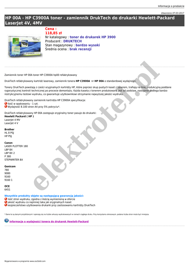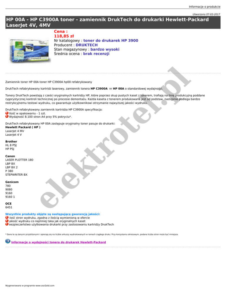 Informacje o produkcie Utworzono 07-03-2017 HP 00A - HP C3900A toner - zamiennik DrukTech do drukarki Hewlett-Packard LaserJet 4V, 4MV Cena : 118,85 zł Zamiennik toner HP 00A toner HP C3900A hp00 refabrykowany l.p l Nr katalogowy : toner do drukarek HP 3900 Producent : DRUKTECH Stan magazynowy : bardzo wysoki Średnia ocena : brak recenzji DrukTech refabrykowany kartridż laserowy, zamiennik tonera HP C3900A nr HP 00A o standardowej wydajności. Tonery DrukTech powstają z cześci oryginalnych kartridży HP, które poprzez skup pustych kaset z tonerem, trafiają na linię produkcyjną poddane rygorystycznej kontroli technicznej po procesie demontażu. Każda kaseta z tonerem produkowana jest od podstaw, następnie podlega bardzo restrykcyjnemu testowi wydruku, co gwarantuje użytkownikowi otrzymanie najwyższej jakości wydruku. te DrukTech refabrykowany zamiennik kartridża HP C3900A specyfikacja: Ilość w opakowaniu - 1 szt. Wydajność 8.100 stron A4 przy 5% pokryciu*. tr o DrukTech refabrykowany HP 00A zastępuje oryginalny toner pasuje do drukarki: Hewlett Packard ( HP ) LaserJet 4 MV LaserJet 4 V Canon LASER PLOTTER 180 LBP BX LBP BX 2 P 380 STEPWRITER BX OCE 6451 el Genicom 780 9080 9160 9160 1 ek Brother HL 8 PSJ HP PSJ Wszystkie produkty objęte są następującą gwarancją jakości: Ilość stron wydruku, zgodna z ilością wymienioną w ofercie Jakość wydruku co najmniej taka jak oryginalnych kaset Bezpieczeństwo użytkowania drukarki przy zastosowaniu kartridży DrukTech * Dane te są danymi przybliżonymi i opierają się na liczbie arkuszy wydrukowanych w ramach ciągłego druku. Przy korzystaniu okresowym, podana liczba stron może być mniejsza. Informacje o wydajności tonera do drukarek Hewlett-Packard Wygenerowano w programie www.oscGold.com