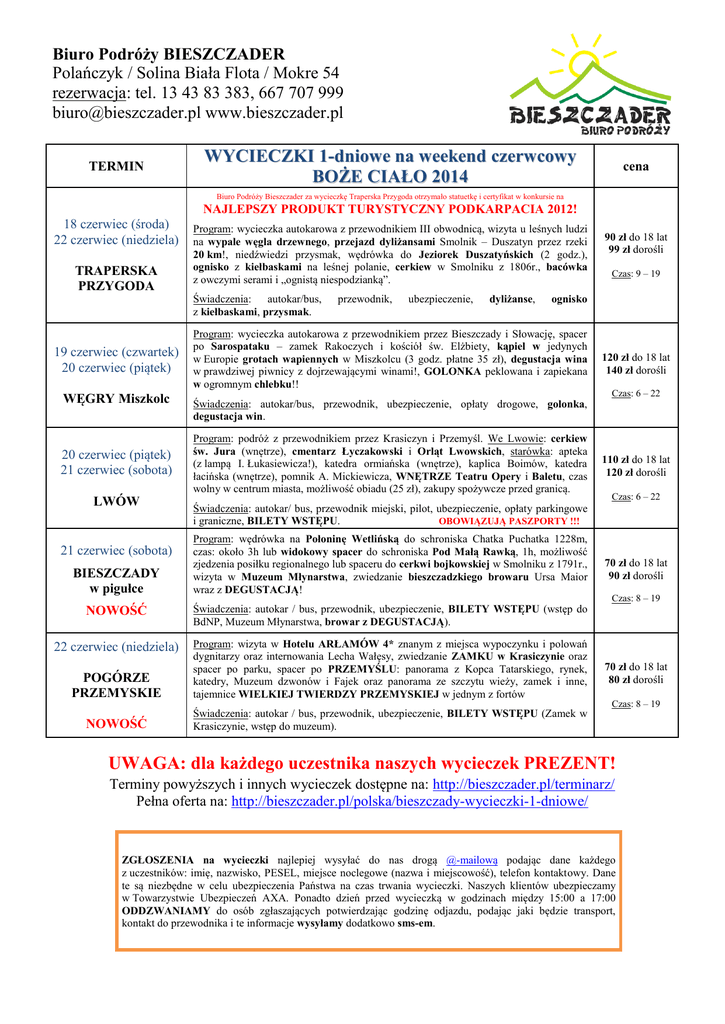 Biuro Podróży BIESZCZADER Polańczyk / Solina Biała Flota / Mokre 54 rezerwacja: tel. 13 43 83 383, 667 707 999 [email protected] www.bieszczader.pl TERMIN WYCIECZKI 1-dniowe na weekend czerwcowy BOŻE CIAŁO 2014 cena Biuro Podróży Bieszczader za wycieczkę Traperska Przygoda otrzymało statuetkę i certyfikat w konkursie na NAJLEPSZY PRODUKT TURYSTYCZNY PODKARPACIA 2012! 18 czerwiec (środa) 22 czerwiec (niedziela) TRAPERSKA PRZYGODA 19 czerwiec (czwartek) 20 czerwiec (piątek) WĘGRY Miszkolc 20 czerwiec (piątek) 21 czerwiec (sobota) LWÓW 21 czerwiec (sobota) BIESZCZADY w pigułce Program: wycieczka autokarowa z przewodnikiem III obwodnicą, wizyta u leśnych ludzi na wypale węgla drzewnego, przejazd dyliżansami Smolnik – Duszatyn przez rzeki 20 km!, niedźwiedzi przysmak, wędrówka do Jeziorek Duszatyńskich (2 godz.), ognisko z kiełbaskami na leśnej polanie, cerkiew w Smolniku z 1806r., bacówka z owczymi serami i „ognistą niespodzianką”. Świadczenia: autokar/bus, z kiełbaskami, przysmak. przewodnik, ubezpieczenie, dyliżanse, 90 zł do 18 lat 99 zł dorośli Czas: 9 – 19 ognisko Program: wycieczka autokarowa z przewodnikiem przez Bieszczady i Słowację, spacer po Sarospataku – zamek Rakoczych i kościół św. Elżbiety, kąpiel w jedynych w Europie grotach wapiennych w Miszkolcu (3 godz. płatne 35 zł), degustacja wina w prawdziwej piwnicy z dojrzewającymi winami!, GOLONKA peklowana i zapiekana w ogromnym chlebku!! Świadczenia: autokar/bus, przewodnik, ubezpieczenie, opłaty drogowe, golonka, degustacja win. Program: podróż z przewodnikiem przez Krasiczyn i Przemyśl. We Lwowie: cerkiew św. Jura (wnętrze), cmentarz Łyczakowski i Orląt Lwowskich, starówka: apteka (z lampą I. Łukasiewicza!), katedra ormiańska (wnętrze), kaplica Boimów, katedra łacińska (wnętrze), pomnik A. Mickiewicza, WNĘTRZE Teatru Opery i Baletu, czas wolny w centrum miasta, możliwość obiadu (25 zł), zakupy spożywcze przed granicą. 120 zł do 18 lat 140 zł dorośli Czas: 6 – 22 110 zł do 18 lat 120 zł dorośli Czas: 6 – 22 Świadczenia: autokar/ bus, przewodnik miejski, pilot, ubezpieczenie, opłaty parkingowe i graniczne, BILETY WSTĘPU. OBOWIĄZUJĄ PASZPORTY !!! Program: wędrówka na Połoninę Wetlińską do schroniska Chatka Puchatka 1228m, czas: około 3h lub widokowy spacer do schroniska Pod Małą Rawką, 1h, możliwość zjedzenia posiłku regionalnego lub spaceru do cerkwi bojkowskiej w Smolniku z 1791r., wizyta w Muzeum Młynarstwa, zwiedzanie bieszczadzkiego browaru Ursa Maior wraz z DEGUSTACJĄ! NOWOŚĆ Świadczenia: autokar / bus, przewodnik, ubezpieczenie, BILETY WSTĘPU (wstęp do BdNP, Muzeum Młynarstwa, browar z DEGUSTACJĄ). 22 czerwiec (niedziela) POGÓRZE PRZEMYSKIE Program: wizyta w Hotelu ARŁAMÓW 4* znanym z miejsca wypoczynku i polowań dygnitarzy oraz internowania Lecha Wałęsy, zwiedzanie ZAMKU w Krasiczynie oraz spacer po parku, spacer po PRZEMYŚLU: panorama z Kopca Tatarskiego, rynek, katedry, Muzeum dzwonów i Fajek oraz panorama ze szczytu wieży, zamek i inne, tajemnice WIELKIEJ TWIERDZY PRZEMYSKIEJ w jednym z fortów NOWOŚĆ Świadczenia: autokar / bus, przewodnik, ubezpieczenie, BILETY WSTĘPU (Zamek w Krasiczynie, wstęp do muzeum). 70 zł do 18 lat 90 zł dorośli Czas: 8 – 19 70 zł do 18 lat 80 zł dorośli Czas: 8 – 19 UWAGA: dla każdego uczestnika naszych wycieczek PREZENT! Terminy powyższych i innych wycieczek dostępne na: http://bieszczader.pl/terminarz/ Pełna oferta na: http://bieszczader.pl/polska/bieszczady-wycieczki-1-dniowe/ ZGŁOSZENIA na wycieczki najlepiej wysyłać do nas drogą @-mailową podając dane każdego z uczestników: imię, nazwisko, PESEL, miejsce noclegowe (nazwa i miejscowość), telefon kontaktowy. Dane te są niezbędne w celu ubezpieczenia Państwa na czas trwania wycieczki. Naszych klientów ubezpieczamy w Towarzystwie Ubezpieczeń AXA. Ponadto dzień przed wycieczką w godzinach między 15:00 a 17:00 ODDZWANIAMY do osób zgłaszających potwierdzając godzinę odjazdu, podając jaki będzie transport, kontakt do przewodnika i te informacje wysyłamy dodatkowo sms-em.