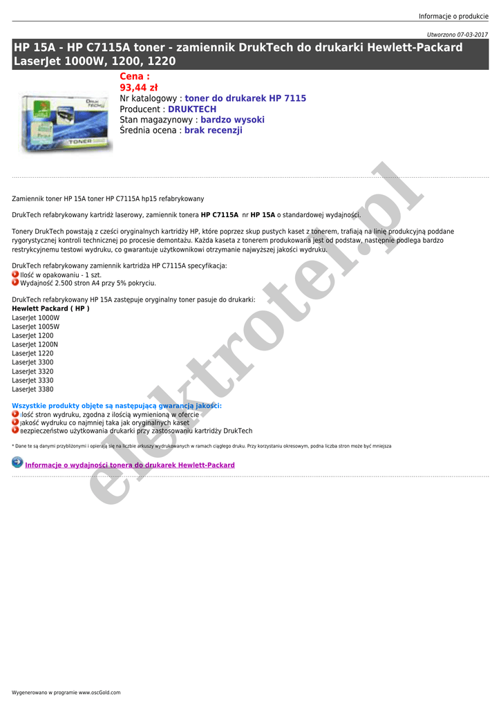Informacje o produkcie Utworzono 07-03-2017 HP 15A - HP C7115A toner - zamiennik DrukTech do drukarki Hewlett-Packard LaserJet 1000W, 1200, 1220 Cena : 93,44 zł Zamiennik toner HP 15A toner HP C7115A hp15 refabrykowany l.p l Nr katalogowy : toner do drukarek HP 7115 Producent : DRUKTECH Stan magazynowy : bardzo wysoki Średnia ocena : brak recenzji DrukTech refabrykowany kartridż laserowy, zamiennik tonera HP C7115A nr HP 15A o standardowej wydajności. Tonery DrukTech powstają z cześci oryginalnych kartridży HP, które poprzez skup pustych kaset z tonerem, trafiają na linię produkcyjną poddane rygorystycznej kontroli technicznej po procesie demontażu. Każda kaseta z tonerem produkowana jest od podstaw, następnie podlega bardzo restrykcyjnemu testowi wydruku, co gwarantuje użytkownikowi otrzymanie najwyższej jakości wydruku. te DrukTech refabrykowany zamiennik kartridża HP C7115A specyfikacja: Ilość w opakowaniu - 1 szt. Wydajność 2.500 stron A4 przy 5% pokryciu. tr o DrukTech refabrykowany HP 15A zastępuje oryginalny toner pasuje do drukarki: Hewlett Packard ( HP ) LaserJet 1000W LaserJet 1005W LaserJet 1200 LaserJet 1200N LaserJet 1220 LaserJet 3300 LaserJet 3320 LaserJet 3330 LaserJet 3380 ek Wszystkie produkty objęte są następującą gwarancją jakości: Ilość stron wydruku, zgodna z ilością wymienioną w ofercie Jakość wydruku co najmniej taka jak oryginalnych kaset Bezpieczeństwo użytkowania drukarki przy zastosowaniu kartridży DrukTech * Dane te są danymi przybliżonymi i opierają się na liczbie arkuszy wydrukowanych w ramach ciągłego druku. Przy korzystaniu okresowym, podna liczba stron może być mniejsza el Informacje o wydajności tonera do drukarek Hewlett-Packard Wygenerowano w programie www.oscGold.com
