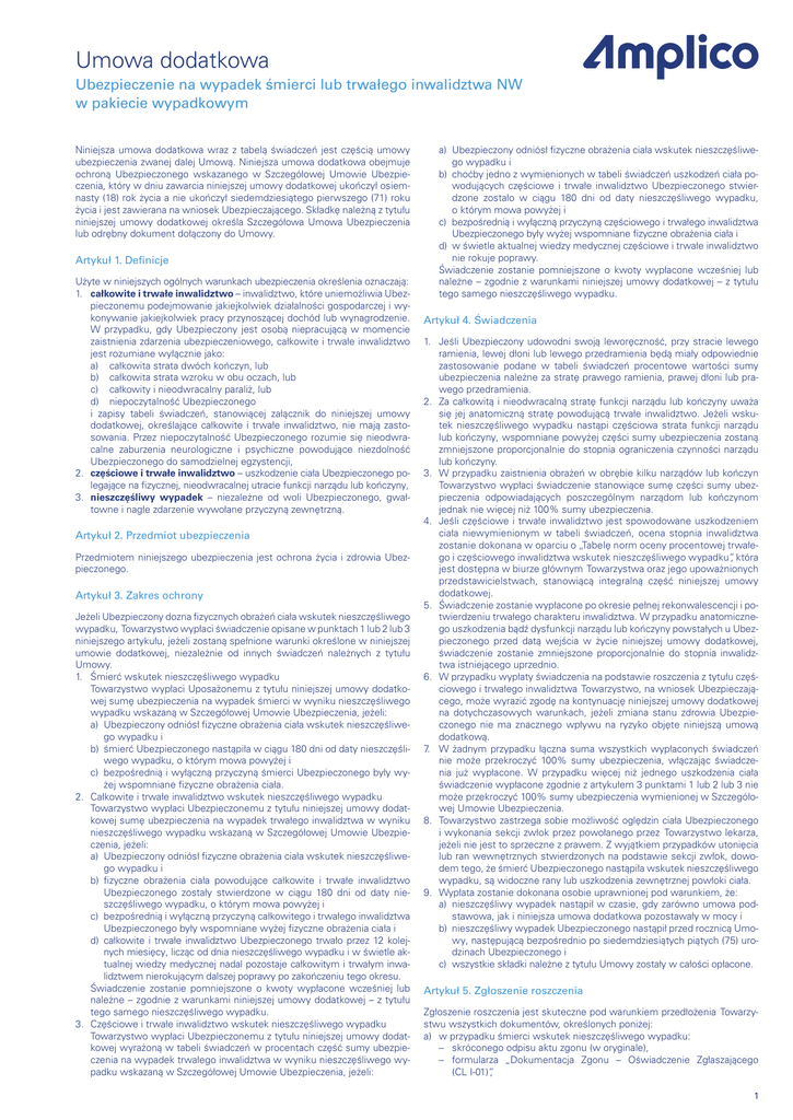 Umowa dodatkowa Ubezpieczenie na wypadek śmierci lub trwałego inwalidztwa nw w pakiecie wypadkowym Niniejsza umowa dodatkowa wraz z tabelą świadczeń jest częścią umowy ubezpieczenia zwanej dalej Umową. Niniejsza umowa dodatkowa obejmuje ochroną Ubezpieczonego wskazanego w Szczegółowej Umowie Ubezpieczenia, który w dniu zawarcia niniejszej umowy dodatkowej ukończył osiemnasty (18) rok życia a nie ukończył siedemdziesiątego pierwszego (71) roku życia i jest zawierana na wniosek Ubezpieczającego. Składkę należną z tytułu niniejszej umowy dodatkowej określa Szczegółowa Umowa Ubezpieczenia lub odrębny dokument dołączony do Umowy. Artykuł 1. Definicje Użyte w niniejszych ogólnych warunkach ubezpieczenia określenia oznaczają: 1. całkowite i trwałe inwalidztwo – inwalidztwo, które uniemożliwia Ubezpieczonemu podejmowanie jakiejkolwiek działalności gospodarczej i wykonywanie jakiejkolwiek pracy przynoszącej dochód lub wynagrodzenie. W przypadku, gdy Ubezpieczony jest osobą niepracującą w momencie zaistnienia zdarzenia ubezpieczeniowego, całkowite i trwałe inwalidztwo jest rozumiane wyłącznie jako: a) całkowita strata dwóch kończyn, lub b) całkowita strata wzroku w obu oczach, lub c) całkowity i nieodwracalny paraliż, lub d) niepoczytalność Ubezpieczonego i zapisy tabeli świadczeń, stanowiącej załącznik do niniejszej umowy dodatkowej, określające całkowite i trwałe inwalidztwo, nie mają zastosowania. Przez niepoczytalność Ubezpieczonego rozumie się nieodwracalne zaburzenia neurologiczne i psychiczne powodujące niezdolność Ubezpieczonego do samodzielnej egzystencji, 2. częściowe i trwałe inwalidztwo – uszkodzenie ciała Ubezpieczonego polegające na fizycznej, nieodwracalnej utracie funkcji narządu lub kończyny, 3. nieszczęśliwy wypadek – niezależne od woli Ubezpieczonego, gwałtowne i nagłe zdarzenie wywołane przyczyną zewnętrzną. Artykuł 2. Przedmiot ubezpieczenia Przedmiotem niniejszego ubezpieczenia jest ochrona życia i zdrowia Ubezpieczonego. Artykuł 3. Zakres ochrony Jeżeli Ubezpieczony dozna fizycznych obrażeń ciała wskutek nieszczęśliwego wypadku, Towarzystwo wypłaci świadczenie opisane w punktach 1 lub 2 lub 3 niniejszego artykułu, jeżeli zostaną spełnione warunki określone w niniejszej umowie dodatkowej, niezależnie od innych świadczeń należnych z tytułu Umowy. 1. Śmierć wskutek nieszczęśliwego wypadku Towarzystwo wypłaci Uposażonemu z tytułu niniejszej umowy dodatkowej sumę ubezpieczenia na wypadek śmierci w wyniku nieszczęśliwego wypadku wskazaną w Szczegółowej Umowie Ubezpieczenia, jeżeli: a) Ubezpieczony odniósł fizyczne obrażenia ciała wskutek nieszczęśliwego wypadku i b) śmierć Ubezpieczonego nastąpiła w ciągu 180 dni od daty nieszczęśliwego wypadku, o którym mowa powyżej i c) bezpośrednią i wyłączną przyczyną śmierci Ubezpieczonego były wyżej wspomniane fizyczne obrażenia ciała. 2. Całkowite i trwałe inwalidztwo wskutek nieszczęśliwego wypadku Towarzystwo wypłaci Ubezpieczonemu z tytułu niniejszej umowy dodatkowej sumę ubezpieczenia na wypadek trwałego inwalidztwa w wyniku nieszczęśliwego wypadku wskazaną w Szczegółowej Umowie Ubezpieczenia, jeżeli: a) Ubezpieczony odniósł fizyczne obrażenia ciała wskutek nieszczęśliwego wypadku i b) fizyczne obrażenia ciała powodujące całkowite i trwałe inwalidztwo Ubezpieczonego zostały stwierdzone w ciągu 180 dni od daty nieszczęśliwego wypadku, o którym mowa powyżej i c) bezpośrednią i wyłączną przyczyną całkowitego i trwałego inwalidztwa Ubezpieczonego były wspomniane wyżej fizyczne obrażenia ciała i d) całkowite i trwałe inwalidztwo Ubezpieczonego trwało przez 12 kolejnych miesięcy, licząc od dnia nieszczęśliwego wypadku i w świetle aktualnej wiedzy medycznej nadal pozostaje całkowitym i trwałym inwalidztwem nierokującym dalszej poprawy po zakończeniu tego okresu. Świadczenie zostanie pomniejszone o kwoty wypłacone wcześniej lub należne – zgodnie z warunkami niniejszej umowy dodatkowej – z tytułu tego samego nieszczęśliwego wypadku. 3. Częściowe i trwałe inwalidztwo wskutek nieszczęśliwego wypadku Towarzystwo wypłaci Ubezpieczonemu z tytułu niniejszej umowy dodatkowej wyrażoną w tabeli świadczeń w procentach część sumy ubezpieczenia na wypadek trwałego inwalidztwa w wyniku nieszczęśliwego wypadku wskazaną w Szczegółowej Umowie Ubezpieczenia, jeżeli: a) Ubezpieczony odniósł fizyczne obrażenia ciała wskutek nieszczęśliwego wypadku i b) choćby jedno z wymienionych w tabeli świadczeń uszkodzeń ciała powodujących częściowe i trwałe inwalidztwo Ubezpieczonego stwierdzone zostało w ciągu 180 dni od daty nieszczęśliwego wypadku, o którym mowa powyżej i c) bezpośrednią i wyłączną przyczyną częściowego i trwałego inwalidztwa Ubezpieczonego były wyżej wspomniane fizyczne obrażenia ciała i d) w świetle aktualnej wiedzy medycznej częściowe i trwałe inwalidztwo nie rokuje poprawy. Świadczenie zostanie pomniejszone o kwoty wypłacone wcześniej lub należne – zgodnie z warunkami niniejszej umowy dodatkowej – z tytułu tego samego nieszczęśliwego wypadku. Artykuł 4. Świadczenia 1. Jeśli Ubezpieczony udowodni swoją leworęczność, przy stracie lewego ramienia, lewej dłoni lub lewego przedramienia będą miały odpowiednie zastosowanie podane w tabeli świadczeń procentowe wartości sumy ubezpieczenia należne za stratę prawego ramienia, prawej dłoni lub prawego przedramienia. 2. Za całkowitą i nieodwracalną stratę funkcji narządu lub kończyny uważa się jej anatomiczną stratę powodującą trwałe inwalidztwo. Jeżeli wskutek nieszczęśliwego wypadku nastąpi częściowa strata funkcji narządu lub kończyny, wspomniane powyżej części sumy ubezpieczenia zostaną zmniejszone proporcjonalnie do stopnia ograniczenia czynności narządu lub kończyny. 3. W pr