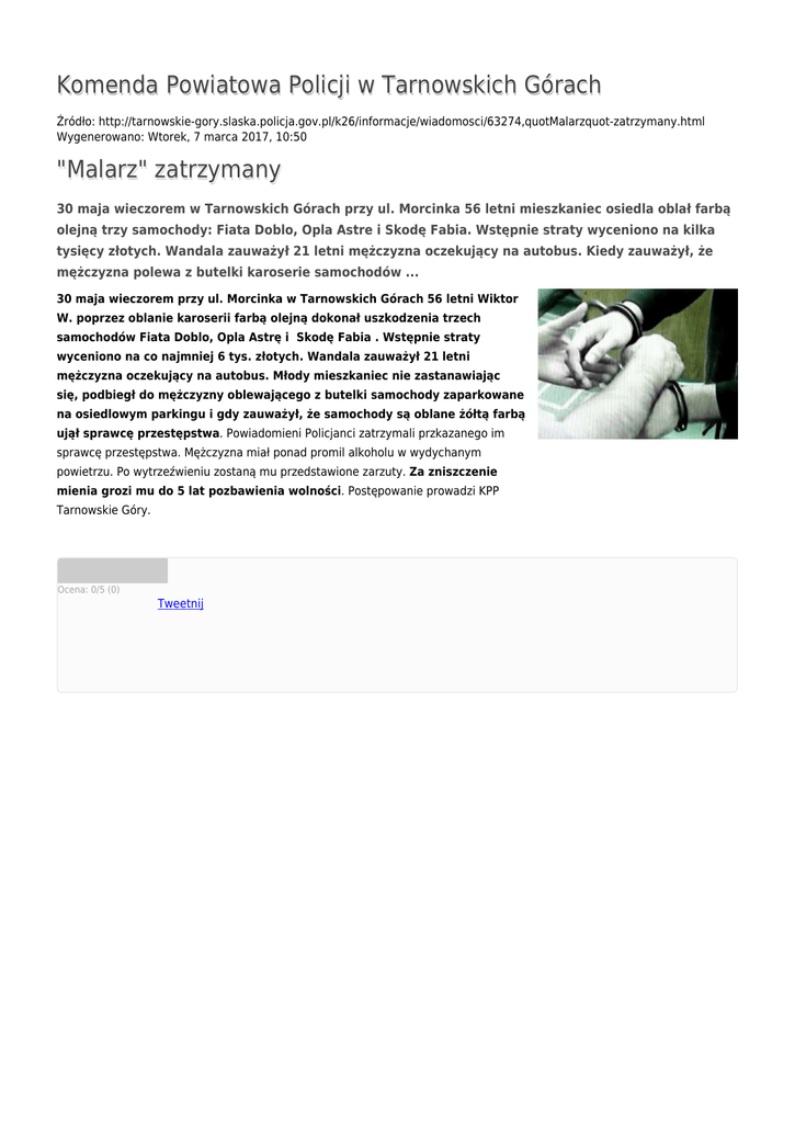 Komenda Powiatowa Policji w Tarnowskich Górach Źródło: http://tarnowskie-gory.slaska.policja.gov.pl/k26/informacje/wiadomosci/63274,quotMalarzquot-zatrzymany.html Wygenerowano: Wtorek, 7 marca 2017, 10:50 "Malarz" zatrzymany 30 maja wieczorem w Tarnowskich Górach przy ul. Morcinka 56 letni mieszkaniec osiedla oblał farbą olejną trzy samochody: Fiata Doblo, Opla Astre i Skodę Fabia. Wstępnie straty wyceniono na kilka tysięcy złotych. Wandala zauważył 21 letni mężczyzna oczekujący na autobus. Kiedy zauważył, że mężczyzna polewa z butelki karoserie samochodów ... 30 maja wieczorem przy ul. Morcinka w Tarnowskich Górach 56 letni Wiktor W. poprzez oblanie karoserii farbą olejną dokonał uszkodzenia trzech samochodów Fiata Doblo, Opla Astrę i Skodę Fabia . Wstępnie straty wyceniono na co najmniej 6 tys. złotych. Wandala zauważył 21 letni mężczyzna oczekujący na autobus. Młody mieszkaniec nie zastanawiając się, podbiegł do mężczyzny oblewającego z butelki samochody zaparkowane na osiedlowym parkingu i gdy zauważył, że samochody są oblane żółtą farbą ujął sprawcę przestępstwa. Powiadomieni Policjanci zatrzymali przkazanego im sprawcę przestępstwa. Mężczyzna miał ponad promil alkoholu w wydychanym powietrzu. Po wytrzeźwieniu zostaną mu przedstawione zarzuty. Za zniszczenie mienia grozi mu do 5 lat pozbawienia wolności. Postępowanie prowadzi KPP Tarnowskie Góry. Ocena: 0/5 (0) Tweetnij