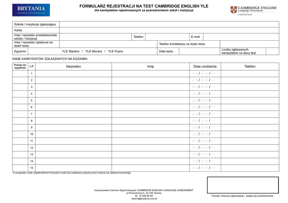 FORMULARZ REJESTRACJI NA TEST CAMBRIDGE ENGLISH YLE dla kandydatów rejestrowanych za pośrednictwem szkół i instytucji Szkoła / instytucja zgłaszająca Adres Imię i nazwisko przedstawiciela szkoły / instytucji Imię i nazwisko opiekuna na dzień testu Egzamin Telefon E-mail Telefon kontaktowy na dzień testu YLE Starters / YLE Movers / YLE Flyers Liczba zgłaszanych kandydatów na dany test Data testu DANE KANDYDATÓW ZGŁASZANYCH NA EGZAMIN: Proszę nie wypełniać L.P. Nazwisko Imię Data urodzenia 1 dd/mm/rr 2 dd/mm/rr 3 dd/mm/rr 4 dd/mm/rr 5 dd/mm/rr 6 dd/mm/rr 7 dd/mm/rr 8 dd/mm/rr 9 dd/mm/rr 10 dd/mm/rr 11 dd/mm/rr 12 dd/mm/rr 13 dd/mm/rr 14 dd/mm/rr 15 dd/mm/rr Telefon *w przypadku osób niepełnoletnich formularz może być podpisany jedynie przez rodzica lub opiekuna prawnego Autoryzowane Centrum Egzaminacyjne CAMBRIDGE ENGLISH LANGUAGE ASSESSMENT ul.Powroźnicza 5, 33-100 Tarnów tel. 14 628 68 00 [email protected] Pieczęć instytucji zgłaszającej i podpis jej przedstawiciela