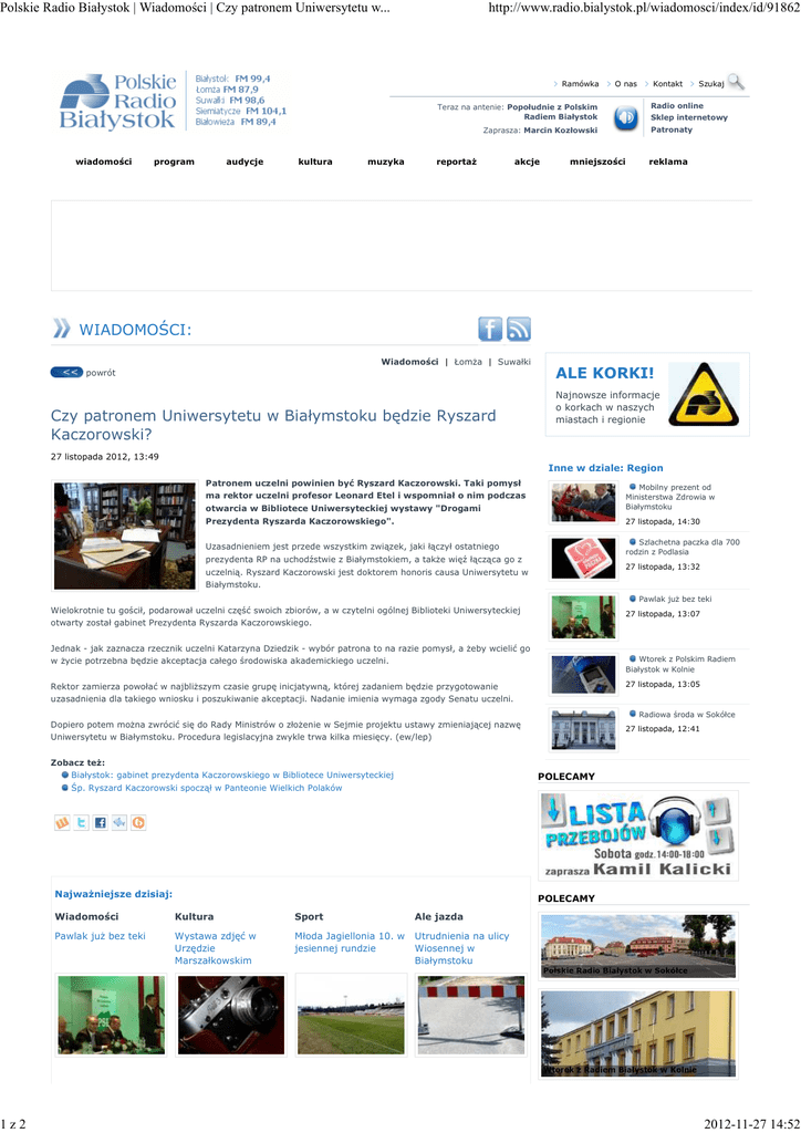 27.11.2012 - Radio.bialystok.pl Czy patronem Uniwersytetu w