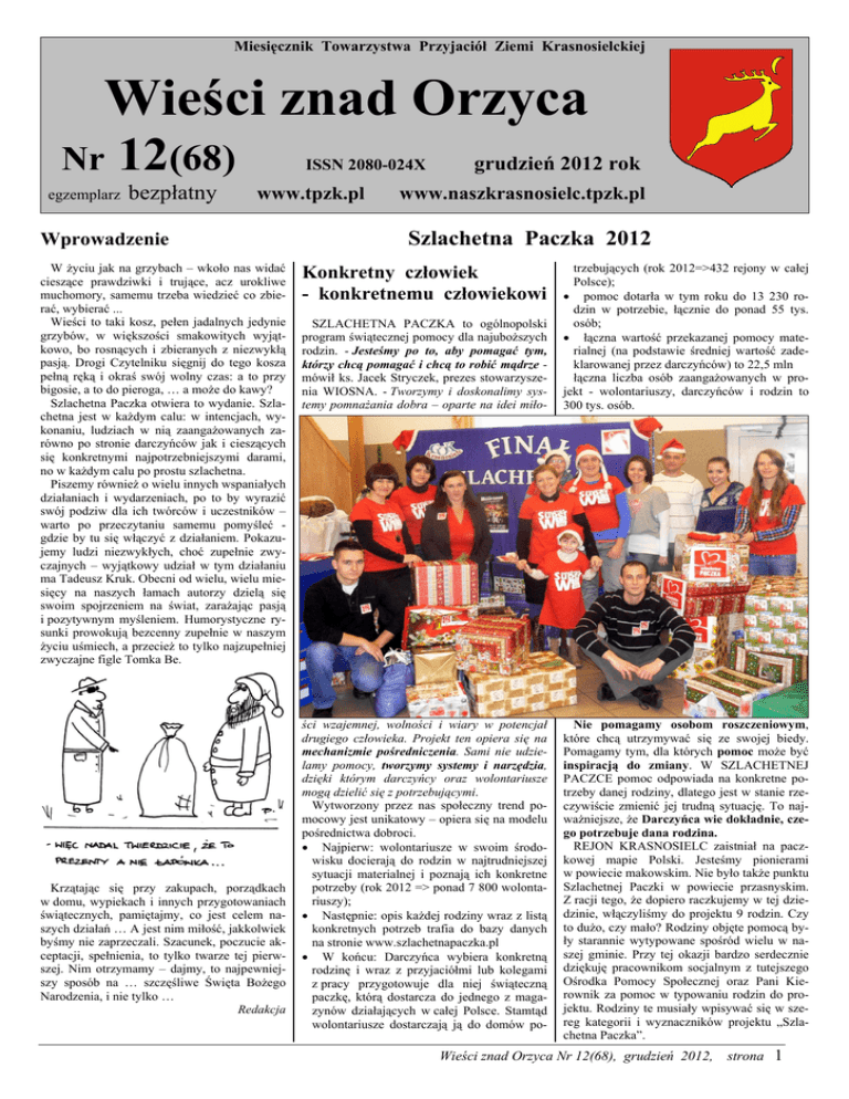 Miesięcznik Towarzystwa Przyjaciół Ziemi Krasnosielckiej Wieści znad Orzyca Nr 12(68) egzemplarz bezpłatny ISSN 2080-024X www.tpzk.pl Wprowadzenie W życiu jak na grzybach – wkoło nas widać cieszące prawdziwki i trujące, acz urokliwe muchomory, samemu trzeba wiedzieć co zbierać, wybierać ... Wieści to taki kosz, pełen jadalnych jedynie grzybów, w większości smakowitych wyjątkowo, bo rosnących i zbieranych z niezwykłą pasją. Drogi Czytelniku sięgnij do tego kosza pełną ręką i okraś swój wolny czas: a to przy bigosie, a to do pieroga, … a może do kawy? Szlachetna Paczka otwiera to wydanie. Szlachetna jest w każdym calu: w intencjach, wykonaniu, ludziach w nią zaangażowanych zarówno po stronie darczyńców jak i cieszących się konkretnymi najpotrzebniejszymi darami, no w każdym calu po prostu szlachetna. Piszemy również o wielu innych wspaniałych działaniach i wydarzeniach, po to by wyrazić swój podziw dla ich twórców i uczestników – warto po przeczytaniu samemu pomyśleć gdzie by tu się włączyć z działaniem. Pokazujemy ludzi niezwykłych, choć zupełnie zwyczajnych – wyjątkowy udział w tym działaniu ma Tadeusz Kruk. Obecni od wielu, wielu miesięcy na naszych łamach autorzy dzielą się swoim spojrzeniem na świat, zarażając pasją i pozytywnym myśleniem. Humorystyczne rysunki prowokują bezcenny zupełnie w naszym życiu uśmiech, a przecież to tylko najzupełniej zwyczajne figle Tomka Be. Krzątając się przy zakupach, porządkach w domu, wypiekach i innych przygotowaniach świątecznych, pamiętajmy, co jest celem naszych działań … A jest nim miłość, jakkolwiek byśmy nie zaprzeczali. Szacunek, poczucie akceptacji, spełnienia, to tylko twarze tej pierwszej. Nim otrzymamy – dajmy, to najpewniejszy sposób na … szczęśliwe Święta Bożego Narodzenia, i nie tylko … Redakcja grudzień 2012 rok www.naszkrasnosielc.tpzk.pl Szlachetna Paczka 2012 Konkretny człowiek - konkretnemu człowiekowi SZLACHETNA PACZKA to ogólnopolski program świątecznej pomocy dla najuboższych rodzin. - Jesteśmy po to, aby pomagać tym, którzy chcą pomagać i chcą to robić mądrze mówił ks. Jacek Stryczek, prezes stowarzyszenia WIOSNA. - Tworzymy i doskonalimy systemy pomnażania dobra – oparte na idei miło- ści wzajemnej, wolności i wiary w potencjał drugiego człowieka. Projekt ten opiera się na mechanizmie pośredniczenia. Sami nie udzielamy pomocy, tworzymy systemy i narzędzia, dzięki którym darczyńcy oraz wolontariusze mogą dzielić się z potrzebującymi. Wytworzony przez nas społeczny trend pomocowy jest unikatowy – opiera się na modelu pośrednictwa dobroci. • Najpierw: wolontariusze w swoim środowisku docierają do rodzin w najtrudniejszej sytuacji materialnej i poznają ich konkretne potrzeby (rok 2012 => ponad 7 800 wolontariuszy); • Następnie: opis każdej rodziny wraz z listą konkretnych potrzeb trafia do bazy danych na stronie www.szlachetnapaczka.pl • W końcu: Darczyńca wybiera konkretną rodzinę i wraz z przyjaciółmi lub kolegami z pracy przygotowuje dla niej świąteczną paczkę, którą dostarcza do jednego z magazynów działających w całej Polsce. Stamtąd wolontariusze dostarczają ją do domów po- trzebujących (rok 2012=>432 rejony w całej Polsce); • pomoc dotarła w tym roku do 13 230 rodzin w potrzebie, łącznie do ponad 55 tys. osób; • łączna wartość przekazanej pomocy materialnej (na podstawie średniej wartość zadeklarowanej przez darczyńców) to 22,5 mln łączna liczba osób zaangażowanych w projekt - wolontariuszy, darczyńców i rodzin to 300 tys. osób. Nie pomagamy osobom roszczeniowym, które chcą utrzymywać się ze swojej biedy. Pomagamy tym, dla których pomoc może być inspiracją do zmiany. W SZLACHETNEJ PACZCE pomoc odpowiada na konkretne potrzeby danej rodziny, dlatego jest w stanie rzeczywiście zmienić jej trudną sytuację. To najważniejsze, że Darczyńca wie dokładnie, czego potrzebuje dana rodzina. REJON KRASNOSIELC zaistniał na paczkowej mapie Polski. Jesteśmy pionierami w powiecie makowskim. Nie było także punktu Szlachetnej Paczki w powiecie przasnyskim. Z racji tego, że dopiero raczkujemy w tej dziedzinie, włączyliśmy do projektu 9 rodzin. Czy to dużo, czy mało? Rodziny objęte pomocą były starannie wytypowane spośród wielu w naszej gminie. Przy tej okazji bardzo serdecznie dziękuję pracownikom socjalnym z tutejszego Ośrodka Pomocy Społecznej oraz Pani Kierownik za pomoc w typowaniu rodzin do projektu. Rodziny te musiały wpisywać się w szereg kategorii i wyznaczników projektu „Szlachetna Paczka”. Wieści znad Orzyca Nr 12(68), grudzień 2012, strona 1 Wolontariusze z naszego rejonu byli tymi, którzy w sposób bezpośredni dbali o poprawność przeprowadzenia „paczki” w zgodzie z ideami paczkowymi. Byli pośrednikami między darczyńcą a rodziną potrzebującą. 12 osób zaangażowanych i otwartych na drugiego człowieka włączyło się całym sobą, za co bardzo serdecznie im dziękuję jako lider rejonu Krasnosielc. Nie byli to ludzie z przypadku. Przeszli proces rekrutacji, szkolenia, zdawali testy z wiedzy o paczce. Ci fantastyczni wolontariusze to: Magdalena Jurczewska, Karolina Zadrożna, Lidia Napiórkowska, Dorota Bonisławska, Lidia Woźniak, Emilia Daliga, Natalia Szymańska, Aleksandra Parzuchowska, Kazimierz Mackiewicz i Patryk Rolka. Dzięki SuperW ! Zwieńczeniem wspólnych działań był finał ogólnopolski. 8 i 9 grudnia 2012 r. były czynne paczkowe magazyny w całej Polsce. W naszym rejonie finał odbył się 8 grudnia w GOK-u w Krasnosielcu. W samo południe pojawili się drewna opałowego. Szereg osób indywidualnych chciało pozostać anonimowymi. Wójt Gminy udostępnił nam na potrzeby finału samochód, którym rozwoziliśmy świąteczne podarunki do rodzin. Kierowca zaś, Michał Klicki, w ramach świątecznego wolontariatu spędził sobotni dzień za kierownic