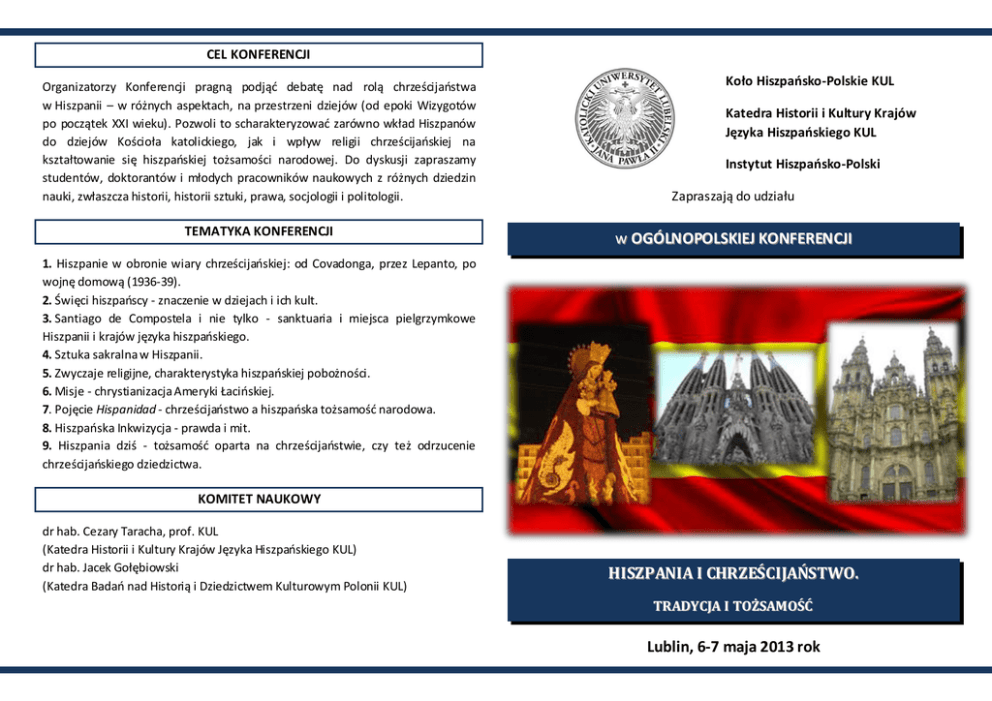 CEL KONFERENCJI Organizatorzy Konferencji pragną podjąć debatę nad rolą chrześcijaństwa w Hiszpanii – w różnych aspektach, na przestrzeni dziejów (od epoki Wizygotów po początek XXI wieku). Pozwoli to scharakteryzować zarówno wkład Hiszpanów do dziejów Kościoła katolickiego, jak i wpływ religii chrześcijańskiej na kształtowanie się hiszpańskiej tożsamości narodowej. Do dyskusji zapraszamy studentów, doktorantów i młodych pracowników naukowych z różnych dziedzin nauki, zwłaszcza historii, historii sztuki, prawa, socjologii i politologii. TEMATYKA KONFERENCJI Koło Hiszpańsko-Polskie KUL Katedra Historii i Kultury Krajów Języka Hiszpańskiego KUL Instytut Hiszpańsko-Polski Zapraszają do udziału w OGÓLNOPOLSKIEJ KONFERENCJI 1. Hiszpanie w obronie wiary chrześcijańskiej: od Covadonga, przez Lepanto, po wojnę domową (1936-39). 2. Święci hiszpańscy - znaczenie w dziejach i ich kult. 3. Santiago de Compostela i nie tylko - sanktuaria i miejsca pielgrzymkowe Hiszpanii i krajów języka hiszpańskiego. 4. Sztuka sakralna w Hiszpanii. 5. Zwyczaje religijne, charakterystyka hiszpańskiej pobożności. 6. Misje - chrystianizacja Ameryki Łacińskiej. 7. Pojęcie Hispanidad - chrześcijaństwo a hiszpańska tożsamość narodowa. 8. Hiszpańska Inkwizycja - prawda i mit. 9. Hiszpania dziś - tożsamość oparta na chrześcijaństwie, czy też odrzucenie chrześcijańskiego dziedzictwa. KOMITET NAUKOWY dr hab. Cezary Taracha, prof. KUL (Katedra Historii i Kultury Krajów Języka Hiszpańskiego KUL) dr hab. Jacek Gołębiowski (Katedra Badań nad Historią i Dziedzictwem Kulturowym Polonii KUL) HISZPANIA I CHRZEŚCIJAŃSTWO. TRADYCJA I TOŻSAMOŚĆ Lublin, 6-7 maja 2013 rok INFORMACJE ORGANIZACYJNE ORGANIZATOR 1. Konferencja odbędzie się w dniach 6-7 maja 2013 roku, w sali 208 Collegium Norwidianum Katolickiego Uniwersytetu Lubelskiego Jana Pawła II (Al. Racławickie 14, 20-950 Lublin). 2. Obrady będą prowadzone w formie referatów na sesjach plenarnych, w sekcjach problemowych. Organizatorzy przeznaczają do 15 minut na każde wystąpienie. 3. Warunkiem czynnego uczestnictwa w Konferencji jest zgłoszenie udziału poprzez przesłanie formularza z tytułem referatu i abstraktem (1000-2000 znaków) oraz wniesienie opłaty konferencyjnej. Koło Hiszpańsko-Polskie KUL – interdyscyplinarna organizacja studencka, skupiająca pasjonatów języka, kultury i historii Hiszpanii i krajów Ameryki Łacińskiej; jego misją jest rozwijanie i promowanie wiedzy w tym zakresie. Katedra Historii i Kultury Krajów Języka Hiszpańskiego funkcjonująca w ramach Instytutu Historii na Wydziale Nauk Humanistycznych KUL. Instytut Hiszpańsko-Polski w Lublinie – instytucja edukacyjno-naukowa, specjalizująca się w nauczaniu języka hiszpańskiego na wszystkich poziomach nauczania, oraz w organizowaniu konferencji, sympozjów naukowych i imprez kulturalnych. OPŁATY KONTAKT Koszt czynnego udziału w Konferencji wynosi 30 zł. Opłatę konferencyjną należy wnieść na konto: Katolicki Uniwersytet Lubelski Jana Pawła II Bank PeKaO SA III O/Lublin 59124023821111000039262147 z dopiskiem: Hiszpania a chrześcijaństwo, imię i nazwisko uczestnika konferencji W ramach opłaty organizatorzy zapewniają udział w obradach, materiały konferencyjne, serwis kawowy i obiad. Zainteresowanych pomocą w rezerwacji noclegów prosimy o kontakt z organizatorami. Zgłoszenia udziału w Konferencji, a także wszelkie zapytania prosimy kierować za pośrednictwem poczty elektronicznej, na adres: [email protected]. Możliwy jest też kontakt telefoniczny z członkiem Komitetu Organizacyjnego: Krzysztof Osewski (Koło Hiszpańsko-Polskie KUL), tel. 885-682-042. TERMINY 12 kwietnia – ostatni dzień nadsyłania zgłoszeń uczestnictwa w Konferencji 15 kwietnia – termin poinformowania o przyjęciu zgłoszonych referatów 22 kwietnia – termin uregulowania opłaty konferencyjnej przez Osoby zakwalifikowane do udziału w Konferencji; wysłanie planu Konferencji 6 maja – rozpoczęcie Konferencji SERDECZNIE ZAPRASZAMY!