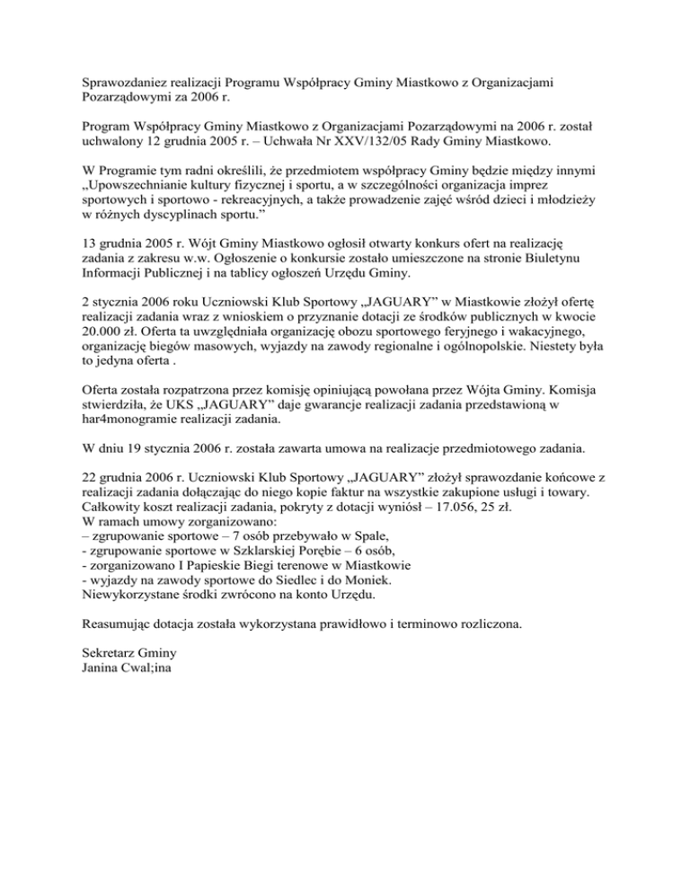 Sprawozdaniez realizacji Programu Współpracy Gminy Miastkowo z Organizacjami Pozarządowymi za 2006 r. Program Współpracy Gminy Miastkowo z Organizacjami Pozarządowymi na 2006 r. został uchwalony 12 grudnia 2005 r. – Uchwała Nr XXV/132/05 Rady Gminy Miastkowo. W Programie tym radni określili, Ŝe przedmiotem współpracy Gminy będzie między innymi „Upowszechnianie kultury fizycznej i sportu, a w szczególności organizacja imprez sportowych i sportowo - rekreacyjnych, a takŜe prowadzenie zajęć wśród dzieci i młodzieŜy w róŜnych dyscyplinach sportu.” 13 grudnia 2005 r. Wójt Gminy Miastkowo ogłosił otwarty konkurs ofert na realizację zadania z zakresu w.w. Ogłoszenie o konkursie zostało umieszczone na stronie Biuletynu Informacji Publicznej i na tablicy ogłoszeń Urzędu Gminy. 2 stycznia 2006 roku Uczniowski Klub Sportowy „JAGUARY” w Miastkowie złoŜył ofertę realizacji zadania wraz z wnioskiem o przyznanie dotacji ze środków publicznych w kwocie 20.000 zł. Oferta ta uwzględniała organizację obozu sportowego feryjnego i wakacyjnego, organizację biegów masowych, wyjazdy na zawody regionalne i ogólnopolskie. Niestety była to jedyna oferta . Oferta została rozpatrzona przez komisję opiniującą powołana przez Wójta Gminy. Komisja stwierdziła, Ŝe UKS „JAGUARY” daje gwarancje realizacji zadania przedstawioną w har4monogramie realizacji zadania. W dniu 19 stycznia 2006 r. została zawarta umowa na realizacje przedmiotowego zadania. 22 grudnia 2006 r. Uczniowski Klub Sportowy „JAGUARY” złoŜył sprawozdanie końcowe z realizacji zadania dołączając do niego kopie faktur na wszystkie zakupione usługi i towary. Całkowity koszt realizacji zadania, pokryty z dotacji wyniósł – 17.056, 25 zł. W ramach umowy zorganizowano: – zgrupowanie sportowe – 7 osób przebywało w Spale, - zgrupowanie sportowe w Szklarskiej Porębie – 6 osób, - zorganizowano I Papieskie Biegi terenowe w Miastkowie - wyjazdy na zawody sportowe do Siedlec i do Moniek. Niewykorzystane środki zwrócono na konto Urzędu. Reasumując dotacja została wykorzystana prawidłowo i terminowo rozliczona. Sekretarz Gminy Janina Cwal;ina