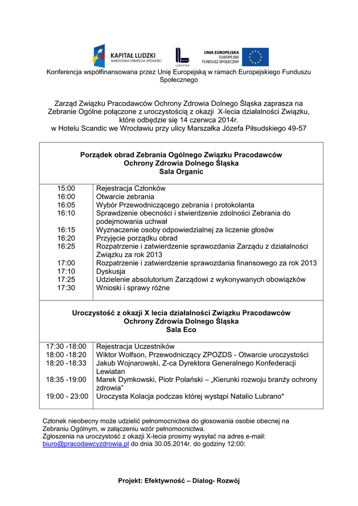 Konferencja współfinansowana przez Unię Europejską w ramach Europejskiego Funduszu Społecznego Zarząd Związku Pracodawców Ochrony Zdrowia Dolnego Śląska zaprasza na Zebranie Ogólne połączone z uroczystością z okazji X-lecia działalności Związku, które odbędzie się 14 czerwca 2014r. w Hotelu Scandic we Wrocławiu przy ulicy Marszałka Józefa Piłsudskiego 49-57 Porządek obrad Zebrania Ogólnego Związku Pracodawców Ochrony Zdrowia Dolnego Śląska Sala Organic 15:00 16:00 16:05 16:10 16:15 16:20 16:25 17:00 17:10 17:25 17:30 Rejestracja Członków Otwarcie zebrania Wybór Przewodniczącego zebrania i protokolanta Sprawdzenie obecności i stwierdzenie zdolności Zebrania do podejmowania uchwał Wyznaczenie osoby odpowiedzialnej za liczenie głosów Przyjęcie porządku obrad Rozpatrzenie i zatwierdzenie sprawozdania Zarządu z działalności Związku za rok 2013 Rozpatrzenie i zatwierdzenie sprawozdania finansowego za rok 2013 Dyskusja Udzielenie absolutorium Zarządowi z wykonywanych obowiązków Wnioski i sprawy różne Uroczystość z okazji X lecia działalności Związku Pracodawców Ochrony Zdrowia Dolnego Śląska Sala Eco 17:30 -18:00 18:00 -18:20 18:20 -18:33 18:35 -19:00 19:00 - 23:00 Rejestracja Uczestników Wiktor Wolfson, Przewodniczący ZPOZDS - Otwarcie uroczystości Jakub Wojnarowski, Z-ca Dyrektora Generalnego Konfederacji Lewiatan Marek Dymkowski, Piotr Polański – „Kierunki rozwoju branży ochrony zdrowia” Uroczysta Kolacja podczas której wystąpi Natalio Lubrano* Członek nieobecny może udzielić pełnomocnictwa do głosowania osobie obecnej na Zebraniu Ogólnym, w załączeniu wzór pełnomocnictwa. Zgłoszenia na uroczystość z okazji X-lecia prosimy wysyłać na adres e-mail: [email protected] do dnia 30.05.2014r. do godziny 12:00: Projekt: Efektywność – Dialog- Rozwój PEŁNOMOCNICTWO DO UDZIAŁU W ZEBRANIU OGÓLNYM CZŁONKÓW ZPOZDŚ Ja, niżej podpisany dnia .................................................................... udzielam pełnomocnictwa Panu (i).............................................................................................................zamieszkałem u w ......................................................................................legitymującego się dowodem osobistym seria............nr.......................... wydanym przez .......................................................................... pełnomocnictwa do udziału w moim imieniu w Nadzwyczajnym Zebraniu Ogólnym Członków ZPOZ dniu 14.06,2014r. oraz do wykonywania prawa głosu w moim imieniu. ................................................. podpis Projekt: Efektywność – Dialog- Rozwój Natalia Lubrano Urodzona we Wrocławiu, polska wokalistka, kompozytorka i autorka tekstów, związana z wrocławską sceną muzyczną do dziś. Natalia Lubrano ukończyła Państwową Szkołę Muzyczną I st. im. Grażyny Bacewicz we Wrocławiu oraz prywatną szkołę jazzu „Jazz a Tours” we Francji. Zdobywała szlify na wielu warsztatach jazzowo–bluesowych w Polsce i za granicą. Wywodzi się z rodziny muzykującej. Na polskiej scenie muzycznej znana jest z wieloletniej współpracy ze środowiskiem wrocławskich hip–hopowców oraz ze współpracy zespołem „Miloopa”, z którym wydała trzy albumy: „Nutrition Facts” (2005), „Unicode” (2008) i „Optica” (2011). Wraz z Miloopą pojawiła się na kilku składankach, wydanych m.in. w Wielkiej Brytanii (Knowledge Magazine mix cd) Z Miloopą także zagrała także kilkadziesiąt koncertów przede wszystkim za granicą, m.in. na Sziget Festiwal, United Islands, Be2gether Festival, Fete De La Musique Luxembourg, United Islands of Prague, Creamfields, JDM Festival, Open’er, Summer of Music, Szene Festival, Green Valley, dodatkowo odbyła wspólne trasy koncertowe z Jojo Mayer's Nerve (USA), Beanfield (DE), Micatone (DE), Dj First Rate (UK), Forss vs Borg (Sonar Kollektiv). Występowała również z Andrzejem Smolikiem, Renatą Przemyk, a także w projekcie „FoxBox” u boku Noviki, Marii Peszek, Pauliny Przybysz i innych reprezentatywnych artystów swego pokolenia. Udzieliła swojego głosu na około dwudziestu albumach innych muzyków. W 2012 roku wystąpiła m.in. na 49 Krajowym Festiwalu Polskiej Piosenki w Opolu w koncercie poświęconym pamięci Anny Jantar i Jarosława Kukulskiego pt „Życia mała garść”, gdzie wykonała utwór „Nic nie może wiecznie trwać” w aranżacji swojego zespołu. W marcu 2012 roku ukazała się autorska płyta wokalistki i jej zespołu pt „R.E.S.P.E.C.T.” wydana przez wydawnictwo Kayax. Laureatka 35 Przeglądu Piosenki Aktorskiej we Wrocławiu, gdzie zdobyła nagrodę publiczności oraz nagrodę jury za walory wokalne. Obecnie wokalistka pracuje nad swoim drugim albumem. Projekt: Efektywność – Dialog- Rozwój