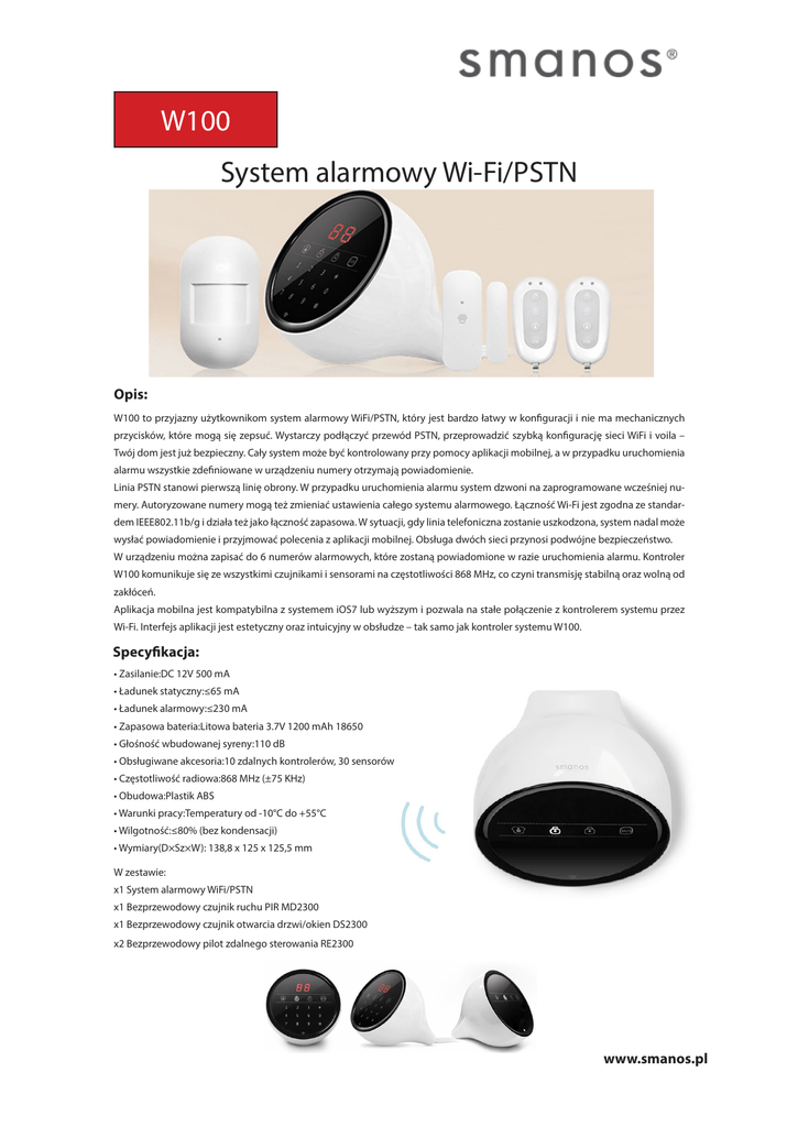 W100 System alarmowy Wi-Fi/PSTN Opis: W100 to przyjazny użytkownikom system alarmowy WiFi/PSTN, który jest bardzo łatwy w konfiguracji i nie ma mechanicznych przycisków, które mogą się zepsuć. Wystarczy podłączyć przewód PSTN, przeprowadzić szybką konfigurację sieci WiFi i voila – Twój dom jest już bezpieczny. Cały system może być kontrolowany przy pomocy aplikacji mobilnej, a w przypadku uruchomienia alarmu wszystkie zdefiniowane w urządzeniu numery otrzymają powiadomienie. Linia PSTN stanowi pierwszą linię obrony. W przypadku uruchomienia alarmu system dzwoni na zaprogramowane wcześniej numery. Autoryzowane numery mogą też zmieniać ustawienia całego systemu alarmowego. Łączność Wi-Fi jest zgodna ze standardem IEEE802.11b/g i działa też jako łączność zapasowa. W sytuacji, gdy linia telefoniczna zostanie uszkodzona, system nadal może wysłać powiadomienie i przyjmować polecenia z aplikacji mobilnej. Obsługa dwóch sieci przynosi podwójne bezpieczeństwo. W urządzeniu można zapisać do 6 numerów alarmowych, które zostaną powiadomione w razie uruchomienia alarmu. Kontroler W100 komunikuje się ze wszystkimi czujnikami i sensorami na częstotliwości 868 MHz, co czyni transmisję stabilną oraz wolną od zakłóceń. Aplikacja mobilna jest kompatybilna z systemem iOS7 lub wyższym i pozwala na stałe połączenie z kontrolerem systemu przez Wi-Fi. Interfejs aplikacji jest estetyczny oraz intuicyjny w obsłudze – tak samo jak kontroler systemu W100. Specyfikacja: • Zasilanie:DC 12V 500 mA • Ładunek statyczny:≤65 mA • Ładunek alarmowy:≤230 mA • Zapasowa bateria:Litowa bateria 3.7V 1200 mAh 18650 • Głośność wbudowanej syreny:110 dB • Obsługiwane akcesoria:10 zdalnych kontrolerów, 30 sensorów • Częstotliwość radiowa:868 MHz (±75 KHz) • Obudowa:Plastik ABS • Warunki pracy:Temperatury od -10°C do +55°C • Wilgotność:≤80% (bez kondensacji) • Wymiary(D×Sz×W): 138,8 x 125 x 125,5 mm W zestawie: x1 System alarmowy WiFi/PSTN x1 Bezprzewodowy czujnik ruchu PIR MD2300 x1 Bezprzewodowy czujnik otwarcia drzwi/okien DS2300 x2 Bezprzewodowy pilot zdalnego sterowania RE2300 www.smanos.pl