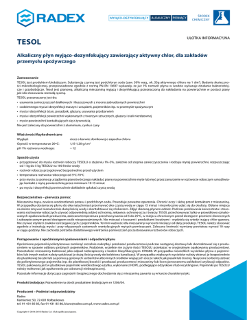 MYJĄCO-DEZYNFEKUJĄCY ALKALICZNY PIENIĄCY ŚRODEK CHEMICZNY ULOTKA INFORMACYJNA TESOL Alkaliczny płyn myjąco-dezynfekujący zawierający aktywny chlor, dla zakładów przemysłu spożywczego Zastosowanie TESOL jest produktem biobójczym. Substancją czynną jest podchloryn sodu (zaw. 30% wag., ok. 53g aktywnego chloru na 1 dm3). Badania skuteczności mikrobiologicznej, przeprowadzone zgodnie z normą PN-EN 13697 wykazały, że już 1% roztwór płynu w wodzie wykazuje działanie bakteriobójcze i grzybobójcze. Tesol jest pianową, alkaliczną mieszaniną myjącą i dezynfekującą przeznaczoną do nakładania na powierzchnie w postaci piany jak i do stosowania metodą ręczną. TESOL przeznaczony jest do: • usuwania zanieczyszczeń białkowych i tłuszczowych z mocno zabrudzonych powierzchni • codziennego mycia i dezynfekcji maszyn i urządzeń, pojemników itp. w przemyśle spożywczym • mycia i dezynfekcji ścian, posadzek, glazury, usuwania przebarwień •mycia i dezynfekcji powierzchni wykonanych z tworzyw sztucznych, glazury i stali nierdzewnej • mycie powierzchni kontaktujących się z żywnością Nie jest zalecany do powierzchni z aluminium, cynku i cyny Właściwości fizykochemiczne Wygląd: ciecz o barwie słomkowej o zapachu chloru Gęstość w temperaturze 20ºC: 1,15-1,20 g/cm3 pH 1% roztworu wodnego: ~ 12 Sposób użycia •przygotować do mycia roztwór roboczy TESOLU o stężeniu 1%-5%, zależnie od stopnia zanieczyszczenia i rodzaju mytej powierzchni, rozpuszczając od 1 kg do 5 kg TESOLU na 100 litrów wody • roztwór roboczy przygotować bezpośrednio przed użyciem • temperatura roztworu roboczego od 5ºC-70ºC •przy myciu za pomocą urządzenia pianotwórczego nakładać pianę na powierzchnie myte lub myć przez zanurzenie w roztworze roboczym umożliwiając kontakt z mytą powierzchnią przez minimum 10-15 minut • po myciu i dezynfekcji powierzchnie dokładnie spłukać czystą wodą Bezpieczeństwo – pierwsza pomoc Mieszanina żrąca, zawiera wodorotlenek potasu i podchloryn sodu. Powoduje poważne oparzenia. Chronić oczy i skórę przed kontaktem z mieszaniną. W przypadku dostania się płynu do oka natychmiast przemywać oko czystą wodą w ciągu 15 minut i niezwłocznie udać się do okulisty. Oblane miejsca na skórze zmywać niezwłocznie dużą ilością wody i skontaktować się z lekarzem. Zdjąć skażoną płynem odzież. Podczas przelewania koncentratu i stosowania roztworów roboczych używać odpowiednią odzież ochronną, rękawice, ochronę oczu i twarzy. TESOL przechowywać tylko w prawidłowo oznakowanych opakowaniach producenta, zalecana temperatura przechowywania od 5 do 25ºC, w miejscu chronionym przed dostępem promieni słonecznych i zabezpieczonym przed dostępem osób nieupoważnionych. Nie mieszać z kwasami i produktami kwaśnymi - wydziela się wtedy trujący chlor gazowy. Nie zrywać etykiet i znaków ostrzegawczych z pojemników. Termin ważności dla mieszaniny wynosi 6 miesięcy od daty produkcji. TESOL należy stosować zgodnie z instrukcją mycia i przy włączonych systemach wentylacyjnych mytych pomieszczeń. Zalecana krotność wymiany powietrza wynosi 10 razy w ciągu godziny. Nie zachodzi potrzeba dodatkowego wietrzenia pomieszczeń po zastosowaniu roztworów roboczych. Postępowanie z opróżnionymi opakowaniami i odpadami płynu Opróżnione pojemniki polietylenowe zamknąć szczelnie nakrętką i przekazać producentowi podczas następnej dostawy lub skontaktować się z producentem w sprawie odbioru próżnych pojemników. Podobnie, wszelkie nie zużyte ilości TESOLU przekazać w oryginalnym opakowaniu producentowi. Pozostałości mieszaniny traktować jako odpad niebezpieczny z kodem klasyfikacyjnym: 070608. W przypadku niewielkich wycieków płynu z pojemników lub innych rozlań należy spłukiwać je dużą ilością wody do kolektora kanalizacji. W przypadku większych wycieków należy zbierać je bezpośrednio do plastikowej beczki lub za pomocą gotowych sorbentów albo innych środków wiążących ciecze takich jak piasek lub trociny. Nasycone sorbenty zebrać Kontakt do polietylenowego pojemnika (np. do plastikowej beczki) i przekazać producentowi mieszaniny lub licencjonowanemu zakładowi utylizacji odpadów. TESOL pakowany jest w plastikowe pojemniki wielokrotnego użytku, wykonane z HDPE, odzyskowi i/lub recyklingowi. Pojemniki po TESOLU Radexpodlegające S.A. należy traktować jak opakowania po substancji niebezpiecznej. Kamieniec 50 72-001zawarte Kołbaskowo Pozostałe informacje dotyczące zagrożeń i bezpiecznego obchodzenia się z mieszaniną są w karcie charakterystyki. tel. 91 431 8585 [email protected] Produkt biobójczy: Pozwolenie na obrót produktem biobójczym nr 1206/04. www.radex.com.pl Producent – Podmiot odpowiedzialny Radex Kamieniec 50, 72-001 Kołbaskowo tel. 91 431 85 85, fax 91 431 85 86, [email protected], www.radex.com.pl Copyright © 2014-2015 Radex S.A. i/lub spółki powiązane.