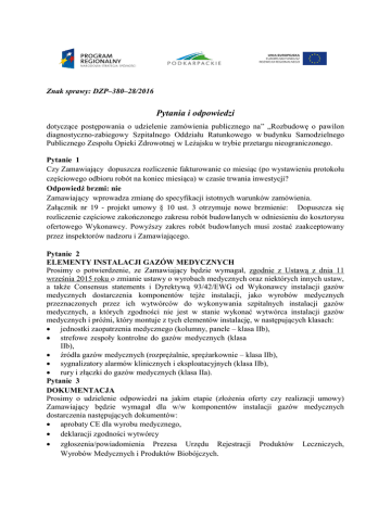 Znak sprawy: DZP–380–28/2016 Pytania i odpowiedzi dotyczące postępowania o udzielenie zamówienia publicznego na” „Rozbudowę o pawilon diagnostyczno-zabiegowy Szpitalnego Oddziału Ratunkowego w budynku Samodzielnego Publicznego Zespołu Opieki Zdrowotnej w Leżajsku w trybie przetargu nieograniczonego. Pytanie 1 Czy Zamawiający dopuszcza rozliczenie fakturowanie co miesiąc (po wystawieniu protokołu częściowego odbioru robót na koniec miesiąca) w czasie trwania inwestycji? Odpowiedź brzmi: nie Zamawiający wprowadza zmianę do specyfikacji istotnych warunków zamówienia. Załącznik nr 19 - projekt umowy § 10 ust. 3 otrzymuje nowe brzmienie: Dopuszcza się rozliczenie częściowe zakończonego zakresu robót budowlanych w odniesieniu do kosztorysu ofertowego Wykonawcy. Powyższy zakres robót budowlanych musi zostać zaakceptowany przez inspektorów nadzoru i Zamawiającego. Pytanie 2 ELEMENTY INSTALACJI GAZÓW MEDYCZNYCH Prosimy o potwierdzenie, ze Zamawiający będzie wymagał, zgodnie z Ustawą z dnia 11 września 2015 roku o zmianie ustawy o wyrobach medycznych oraz niektórych innych ustaw, a także Consensus statements i Dyrektywą 93/42/EWG od Wykonawcy instalacji gazów medycznych dostarczenia komponentów tejże instalacji, jako wyrobów medycznych przeznaczonych przez ich wytwórców do wykonywania szpitalnych instalacji gazów medycznych, a których zgodności nie jest w stanie wykonać wytwórca instalacji gazów medycznych i próżni, który montuje z tych elementów instalację, w następujących klasach: jednostki zaopatrzenia medycznego (kolumny, panele – klasa IIb), strefowe zespoły kontrolne do gazów medycznych (klasa IIb), źródła gazów medycznych (rozprężalnie, sprężarkownie – klasa IIb), sygnalizatory alarmów klinicznych i eksploatacyjnych (klasa IIb), rury i złączki do gazów medycznych (klasa IIa). Pytanie 3 DOKUMENTACJA Prosimy o udzielenie odpowiedzi na jakim etapie (złożenia oferty czy realizacji umowy) Zamawiający będzie wymagał dla w/w komponentów instalacji gazów medycznych dostarczenia następujących dokumentów: aprobaty CE dla wyrobu medycznego, deklaracji zgodności wytwórcy zgłoszenia/powiadomienia Prezesa Urzędu Rejestracji Produktów Leczniczych, Wyrobów Medycznych i Produktów Biobójczych. Pytanie 4 Prosimy o potwierdzenie, że Zamawiający, ze względu na to, że miedź przeciwdrobnoustrojowa zmniejsza ryzyko zakażeń, będzie wymagał dostarczenia popychaczy punktów poboru znajdujących się w takich urządzeniach jak: tablice poboru, tablice, kolumny wykonanych z miedzi przeciwdrobnoustrojowej. Odpowiedź na pytanie 2, 3, 4 brzmi: Instalacja gazów medycznych i jej elementy nie są przedmiotem realizacji w ramach ww. zamówienia. Leżajsk, 14 września 2016 r.