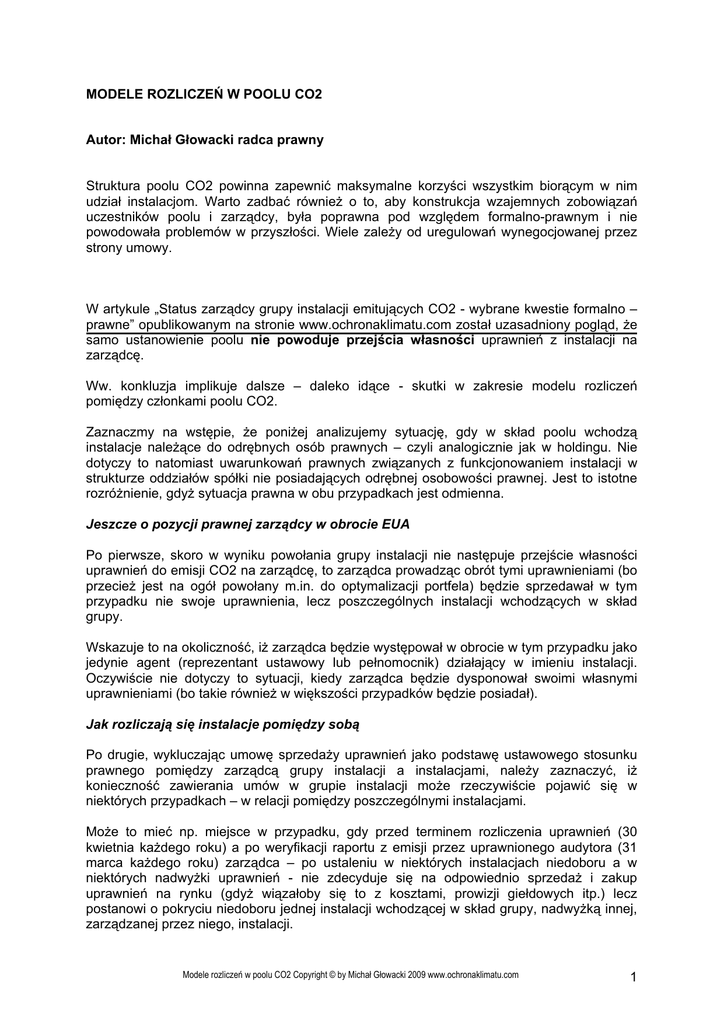 MODELE ROZLICZEŃ W POOLU CO2 Autor: Michał Głowacki radca prawny Struktura poolu CO2 powinna zapewnić maksymalne korzyści wszystkim biorącym w nim udział instalacjom. Warto zadbać również o to, aby konstrukcja wzajemnych zobowiązań uczestników poolu i zarządcy, była poprawna pod względem formalno-prawnym i nie powodowała problemów w przyszłości. Wiele zależy od uregulowań wynegocjowanej przez strony umowy. W artykule „Status zarządcy grupy instalacji emitujących CO2 - wybrane kwestie formalno – prawne” opublikowanym na stronie www.ochronaklimatu.com został uzasadniony pogląd, że samo ustanowienie poolu nie powoduje przejścia własności uprawnień z instalacji na zarządcę. Ww. konkluzja implikuje dalsze – daleko idące - skutki w zakresie modelu rozliczeń pomiędzy członkami poolu CO2. Zaznaczmy na wstępie, że poniżej analizujemy sytuację, gdy w skład poolu wchodzą instalacje należące do odrębnych osób prawnych – czyli analogicznie jak w holdingu. Nie dotyczy to natomiast uwarunkowań prawnych związanych z funkcjonowaniem instalacji w strukturze oddziałów spółki nie posiadających odrębnej osobowości prawnej. Jest to istotne rozróżnienie, gdyż sytuacja prawna w obu przypadkach jest odmienna. Jeszcze o pozycji prawnej zarządcy w obrocie EUA Po pierwsze, skoro w wyniku powołania grupy instalacji nie następuje przejście własności uprawnień do emisji CO2 na zarządcę, to zarządca prowadząc obrót tymi uprawnieniami (bo przecież jest na ogół powołany m.in. do optymalizacji portfela) będzie sprzedawał w tym przypadku nie swoje uprawnienia, lecz poszczególnych instalacji wchodzących w skład grupy. Wskazuje to na okoliczność, iż zarządca będzie występował w obrocie w tym przypadku jako jedynie agent (reprezentant ustawowy lub pełnomocnik) działający w imieniu instalacji. Oczywiście nie dotyczy to sytuacji, kiedy zarządca będzie dysponował swoimi własnymi uprawnieniami (bo takie również w większości przypadków będzie posiadał). Jak rozliczają się instalacje pomiędzy sobą Po drugie, wykluczając umowę sprzedaży uprawnień jako podstawę ustawowego stosunku prawnego pomiędzy zarządcą grupy instalacji a instalacjami, należy zaznaczyć, iż konieczność zawierania umów w grupie instalacji może rzeczywiście pojawić się w niektórych przypadkach – w relacji pomiędzy poszczególnymi instalacjami. Może to mieć np. miejsce w przypadku, gdy przed terminem rozliczenia uprawnień (30 kwietnia każdego roku) a po weryfikacji raportu z emisji przez uprawnionego audytora (31 marca każdego roku) zarządca – po ustaleniu w niektórych instalacjach niedoboru a w niektórych nadwyżki uprawnień - nie zdecyduje się na odpowiednio sprzedaż i zakup uprawnień na rynku (gdyż wiązałoby się to z kosztami, prowizji giełdowych itp.) lecz postanowi o pokryciu niedoboru jednej instalacji wchodzącej w skład grupy, nadwyżką innej, zarządzanej przez niego, instalacji. Modele rozliczeń w poolu CO2 Copyright © by Michał Głowacki 2009 www.ochronaklimatu.com 1 Stosunek prawny łączący zarządcę instalacji z Krajowym Administratorem ma charakter administracyjny i dotyczy publiczno-prawnego obowiązku rozliczenia emisji instalacji wchodzących w skład grupy. Ta administracyjno-prawna relacja łącząca zarządcę z KASHUE nie zmienia wniosku, iż w sferze cywilno-prawnej wykorzystanie przez zarządcę uprawnień jednej instalacji wchodzącej w skład grupy, do rozliczenia innej instalacji wchodzącej w skład tej samej grupy, musi wiązać się z zastosowaniem czynności rozporządzających, w tym umów, znanych prawu cywilnemu. W takiej sytuacji, aby rozliczyć pomiędzy instalacjami przeniesienie uprawnień, musi dojść do zbycia uprawnień przez jedną instalację wchodzącą w skład grupy na rzecz innej. Zastosowanie znajdzie tu na ogół umowa sprzedaży (ale nie są wykluczone inne formy zbycia, przykładowo zamiana z CER itp.), natomiast w ograniczonym stopniu będą mogły być wykorzystane umowy nieodpłatne (przykładowo darowizna), ze względu na związane z tym kwestie podatkowe. Powyższa kwestia nie jest jednoznacznie przesądzona (wszak brak jest w ogóle dostępnej literatury na temat optymalnej struktury poolu), jednak analizując dalej ten temat wiele za nią przemawia. W Krajowym Planie Rozdziału Uprawnień na lata 2005 – 2007 Szwecji stwierdzono, iż Szwecja nie zamierza zezwalać na grupowanie instalacji. Powodem takiego stanowiska jest, iż „dotychczas nie wykazano, aby udział w poolu zmniejszał ciężary administracyjne, którymi obciążone są zainteresowane przedsiębiorstwa.” Jakie ciężary administracyjne mógł mieć na myśli szwedzki ustawodawca? Wszak pool oznacza możliwość wspólnego rozliczania uprawnień – jeżeli jeden operator ma niedobór a drugi nadmiar uprawnień, ilości te można je zbilansować – w wyniku czego operator mający pierwotnie niedobór nie będzie musiał płacić kar. Teoretycznie zatem ciężary administracyjne powinny ulec zmniejszeniu. Rozważając jednak ewentualne ciężary administracyjne, którymi mogą być obarczone organizacje biorące udział w poolu należy rozważyć, jakie powinny być przepływy pomiędzy instalacjami – wszak to wspólne gospodarowanie trzeba jakoś rozliczyć. Pierwszym wartym rozważenia problemem jest sytuacja, gdy zarządca przekaże uprawnienia przyznane przykładowo instalacji A na potrzeby rozliczenia instalacji B – czy powinna być zawierana umowa sprzedaży pomiędzy instalacjami – chyba tak, ponieważ rozliczenie przez zarządcę jest czysto techniczne – uprawnienia przyznane są instalacjom a jedynie wydane na rachunek zarządcy (który jest odpowiedzialny: administracyjnie wobec KASHUE a cywilnoprawnie – wobec członków poolu) za ich rozliczenie. Tak więc ustanowienie zarządcy ma przede wszystkim charakter administracyjny i dotyczy obowiązków publiczno-pra