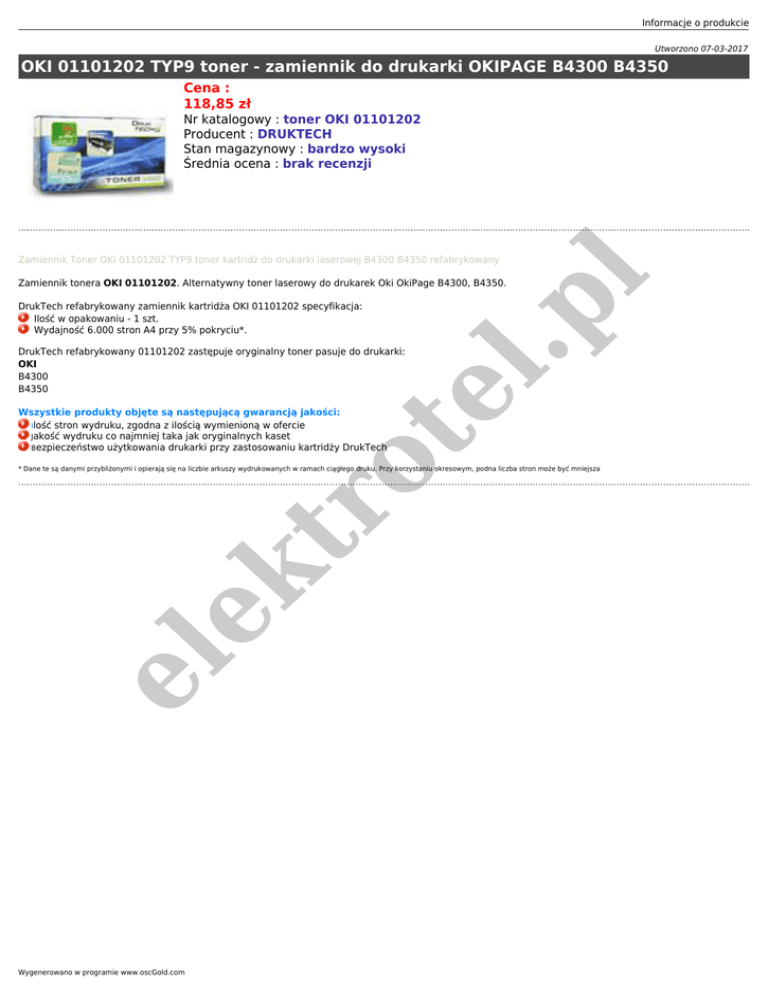 Informacje o produkcie Utworzono 07-03-2017 OKI 01101202 TYP9 toner - zamiennik do drukarki OKIPAGE B4300 B4350 Cena : 118,85 zł Nr katalogowy : toner OKI 01101202 Producent : DRUKTECH Stan magazynowy : bardzo wysoki Średnia ocena : brak recenzji l.p l Zamiennik Toner OKI 01101202 TYP9 toner kartridż do drukarki laserowej B4300 B4350 refabrykowany Zamiennik tonera OKI 01101202. Alternatywny toner laserowy do drukarek Oki OkiPage B4300, B4350. DrukTech refabrykowany zamiennik kartridża OKI 01101202 specyfikacja: Ilość w opakowaniu - 1 szt. Wydajność 6.000 stron A4 przy 5% pokryciu*. te DrukTech refabrykowany 01101202 zastępuje oryginalny toner pasuje do drukarki: OKI B4300 B4350 tr o Wszystkie produkty objęte są następującą gwarancją jakości: Ilość stron wydruku, zgodna z ilością wymienioną w ofercie Jakość wydruku co najmniej taka jak oryginalnych kaset Bezpieczeństwo użytkowania drukarki przy zastosowaniu kartridży DrukTech el ek * Dane te są danymi przybliżonymi i opierają się na liczbie arkuszy wydrukowanych w ramach ciągłego druku. Przy korzystaniu okresowym, podna liczba stron może być mniejsza Wygenerowano w programie www.oscGold.com