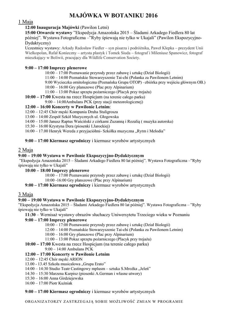 MAJÓWKA W BOTANIKU 2016 1 Maja 12:00 Inauguracja Majówki (Pawilon Letni) 15:00 Otwarcie wystawy ”Ekspedycja Amazońska 2015 – Śladami Arkadego Fiedlera 80 lat później”. Wystawa Fotograficzna –”Ryby śpiewają nie tylko w Ukajali” (Pawilon EkspozycyjnoDydaktyczny) Uczestnicy wystawy: Arkady Radosław Fiedler – syn pisarza i podróżnika, Paweł Klepka – prezydent Unii Wielkopolan, Rafał Konieczny – artysta plastyk i Tomek Siuda – fotograf i Mileniusz Spanowicz, fotograf mieszkający w Boliwii, pracujący dla Wildlife Conservation Society. 9:00 – 17:00 Imprezy plenerowe 10:00 – 17:00 Poznawanie przyrody przez zabawę i sztukę (Dział Biologii) 11:00 – 14:00 Poznańskie Stowarzyszenie Tai-chi (Polanka za Pawilonem Letnim) 9:00 Wycieczka ornitologiczna (Poznańska Grupa OTOP) –zbiórka przy wejściu głównym OB.) 10:00 – 16:00 Gry planszowe (Plac przy Alpinarium) 11:00 – 13:00 Pokaz sprzętu pożarniczego (Placyk przy trejażu) 10:00 – 17:00 Kwesta na rzecz Hospicjum (na terenie całego parku) 9:00 – 14:00Ambulans PCK (przy stacji meteorologicznej) 12:00 – 16:00 Koncerty w Pawilonie Letnim: 12:00 – 12:45 Chór męski Kompania Druha Stuligrosza 13:00 – 14:00 Zespół Szkół Muzycznych ul. Głogowska 14:00 – 15:00 Janusz Raptus Waściński z córkami Zuzanną i Rozalią ( muzyka autorska) 15:30 – 16:00 Krystyna Dera (piosenki I.Jarockiej) 16:00 – 17.00 Henryk Wereda z przyjaciółmi- Szkółka muzyczna „Rytm i Melodia” 9:00 – 17:00 Kiermasz ogrodniczy i kiermasz wyrobów artystycznych 2 Maja 9:00 – 19:00 Wystawa w Pawilonie Ekspozycyjno-Dydaktycznym ”Ekspedycja Amazońska 2015 – Śladami Arkadego Fiedlera 80 lat później”. Wystawa Fotograficzna –”Ryby śpiewają nie tylko w Ukajali” 10:00 – 18:00 Imprezy plenerowe 10:00 – 17:00 Poznawanie przyrody przez zabawę i sztukę (Dział Biologii) 10:00 -16:00 Gry planszowe (Plac przy Alpinarium) 9:00 – 17:00 Kiermasz ogrodniczy i kiermasz wyrobów artystycznych 3 Maja 9:00 – 19:00 Wystawa w Pawilonie Ekspozycyjno-Dydaktycznym ”Ekspedycja Amazońska 2015 – Śladami Arkadego Fiedlera 80 lat później”. Wystawa Fotograficzna – ”Ryby śpiewają nie tylko w Ukajali” 11:30 – Wernisaż wystawy obrazów słuchaczy Uniwersytetu Trzeciego wieku w Poznaniu 9:00 – 17:00 Imprezy plenerowe 10:00 – 17:00 Poznawanie przyrody przez zabawę i sztukę (Dział Biologii) 12:00 – 14:00 Poznańskie Stowarzyszenie Tai-chi (Polanka za Pawilonem Letnim) 10:00 – 16:00 Gry planszowe (Plac przy Alpinarium) 11:00 – 13:00 Pokaz sprzętu pożarniczego (Placyk przy trejażu) 10:00 – 17:00 Kwesta na rzecz Hospicjum (na terenie całego parku) 9:00 – 14:00 Ambulans PCK 12:00 – 17:00 Koncerty w Pawilonie Letnim 12:00 – 12:45 Chór męski ARION 13.00 - 13.45 Szkoła musicalowa „Grupa Erato” 14:00 – 14:30 Studio Teatr Castingowy mplusm – sztuka S.Mrożka „Jeleń” 14:30 – 15:30 Marzena Kurpisz (piosenki A.German i własne utwory) 15:30 – 16:00 Anna Girdziejewska 16:00 – 17:00 Piotr Kuźniak 9:00 – 17:00 Kiermasz ogrodniczy i kiermasz wyrobów artystycznych OR G ANI ZAT O R ZY ZA ST R ZE G AJ Ą SOB IE M O ŻLIW OŚ Ć ZMI AN W P RO G R AMIE