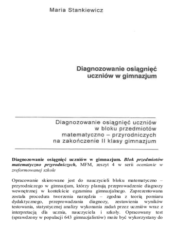 Diagnozowanie osiągnięć uczniów w gimnazjum. Blok przedmiotów matematyczno przyrodniczych, MFM, zeszyt 4 w serii ocenianie w zreformowanej szkole Opracowanie skierowane jest do nauczycieli bloku matematyczno – przyrodniczego w gimnazjum, którzy planują przeprowadzenie diagnozy wewnętrznej w kontekście egzaminu gimnazjalnego. Zaprezentowana została procedura tworzenia narzędzia – zgodna z teorią pomiaru dydaktycznego, przeprowadzania diagnozy, zestawienia wyników testowania, statystycznej analizy wykonania zadań przez uczniów wraz z interpretacją dla ucznia, nauczyciela i szkoły. Opracowany test (sprawdzony w populacji 643 gimnazjalistów) moŜe być wykorzystany do przeprowadzenia diagnozy w klasie drugiej gimnazjum, a uzyskane wyniki moŜna porównać z publikowanymi wynikami badanej populacji uczniów.