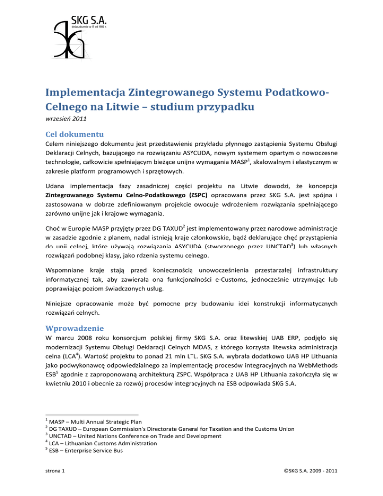 Implementacja Zintegrowanego Systemu PodatkowoCelnego na Litwie – studium przypadku wrzesień 2011 Cel dokumentu Celem niniejszego dokumentu jest przedstawienie przykładu płynnego zastąpienia Systemu Obsługi Deklaracji Celnych, bazującego na rozwiązaniu ASYCUDA, nowym systemem opartym o nowoczesne technologie, całkowicie spełniającym bieżące unijne wymagania MASP1, skalowalnym i elastycznym w zakresie platform programowych i sprzętowych. Udana implementacja fazy zasadniczej części projektu na Litwie dowodzi, że koncepcja Zintegrowanego Systemu Celno-Podatkowego (ZSPC) opracowana przez SKG S.A. jest spójna i zastosowana w dobrze zdefiniowanym projekcie owocuje wdrożeniem rozwiązania spełniającego zarówno unijne jak i krajowe wymagania. Choć w Europie MASP przyjęty przez DG TAXUD2 jest implementowany przez narodowe administracje w zasadzie zgodnie z planem, nadal istnieją kraje członkowskie, bądź deklarujące chęć przystąpienia do unii celnej, które używają rozwiązania ASYCUDA (stworzonego przez UNCTAD3) lub własnych rozwiązań podobnej klasy, jako rdzenia systemu celnego. Wspomniane kraje stają przed koniecznością unowocześnienia przestarzałej infrastruktury informatycznej tak, aby zawierała ona funkcjonalności e-Customs, jednocześnie utrzymując lub poprawiając poziom świadczonych usług. Niniejsze opracowanie może być pomocne przy budowaniu idei konstrukcji informatycznych rozwiązań celnych. Wprowadzenie W marcu 2008 roku konsorcjum polskiej firmy SKG S.A. oraz litewskiej UAB ERP, podjęło się modernizacji Systemu Obsługi Deklaracji Celnych MDAS, z którego korzysta litewska administracja celna (LCA4). Wartość projektu to ponad 21 mln LTL. SKG S.A. wybrała dodatkowo UAB HP Lithuania jako podwykonawcę odpowiedzialnego za implementację procesów integracyjnych na WebMethods ESB5 zgodnie z zaproponowaną architekturą ZSPC. Współpraca z UAB HP Lithuania zakończyła się w kwietniu 2010 i obecnie za rozwój procesów integracyjnych na ESB odpowiada SKG S.A. 1 MASP – Multi Annual Strategic Plan DG TAXUD – European Commission's Directorate General for Taxation and the Customs Union 3 UNCTAD – United Nations Conference on Trade and Development 4 LCA – Lithuanian Customs Administration 5 ESB – Enterprise Service Bus 2 strona 1 ©SKG S.A. 2009 - 2011 Za cel projektu postawiono sobie przebudowę architektury systemu MDAS w taki sposób, by był on zgodny z wymogami postawionymi przez Unię Europejską w ramach MASP oraz uczynienie go bardziej elastycznym wobec przyszłych zmian administracyjnych i biznesowych. Poprzedni system obsługi deklaracji celnych zaprojektowany był w oparciu o rozwiązanie ASYCUDA, co utrudniało jego adaptację do zmieniających się wymagań unijnych, zmierzających do harmonizacji systemów celnych. Jednym z głównych założeń było możliwie najszersze wykorzystanie istniejących już rozwiązań oraz umożliwienie współdziałania powstającego systemu MDAS z innymi działającymi już oraz przyszłymi podsystemami informatycznymi LCA. Jako podstawę modernizacji systemu MDAS SKG S.A. zaproponowała rozwiązanie SOA6 oparte na architekturze modelu ZSPC. Projekt MDAS jest w toku, przy czym jego pierwsza faza – zastąpienie ASYCUDA i ECN+ dla procedur importowych i eksportowych nowym systemem jak również wdrożenie architektury SOA - została zakończona 1-go lipca 2009 faktycznym uruchomieniem systemu. W grudniu 2009 zakończono również testy zgodności (conformance tests) dla podsystemu ICS7. ICS oraz Wywozowa Deklaracja Skrócona zostały uruchomione produkcyjnie 30-go kwietnia 2010. Szerszy zakres funkcjonalny Jednym z najważniejszych argumentów przemawiającym za zastąpieniem systemu ASYCUDA nowym systemem były ograniczenia, co do rozszerzania istniejących już funkcji systemu. Potrzeba rozszerzania funkcji wynika z rozwijającej się w Unii Europejskiej idei elektronicznego („bezpapierowego”) cła i handlu. W chwili obecnej funkcjonalność systemu MDAS obejmuje: • • • Procedurę eksportową w postaci zdefiniowanej w ramach drugiej fazy projektu ECS8, tj. nie tylko elektroniczny eksportowy SAD, jak było w przypadku systemu ASYCUDA, ale również obsługę deklaracji eksportowej w urzędzie wyprowadzenia i zakończenie procesu w urzędzie eksportu (co umożliwiło usunięcie aplikacji ECN+). Ponadto nowa funkcjonalność obejmuje również obsługę manifestu eksportowego, w przypadku składowania towaru przed wyprowadzeniem. Wyprowadzenie towarów bez procedury celnej oparte na Wywozowej Deklaracji Skróconej (system ASYCUDA nie posiadał takiej funkcjonalności, a jest ona wymagana w ramach fazy drugiej projektu ECS) włącznie z funkcjonalnością Urzędu Złożenia9. Wyprzedzające zgłoszenie celne w ramach Wspólnej Polityki Rolnej. Funkcjonalność ta została częściowo zaimplementowana w systemie ASYCUDA, ale w sposób sztuczny przez wykorzystanie eksportowego dokumentu SAD. Z punktu widzenia funkcjonalności systemu MDAS jest to osobna deklaracja celna dla towarów rolnych, składana jeszcze przed rozpoczęciem procedury eksportowej. 6 SOA – Service Oriented Architecture ICS – Import Control System 8 ECS – Export Control System 9 Urząd Złożenia – Office of Lodgement 7 strona 2 ©SKG S.A. 2009 - 2011 • • • • • • • Procedurę importową obsługiwaną w sposób zbliżony do tego przyjętego w systemie ASYCUDA z tą różnicą, że zakres danych deklaracji importowej został powiększony o dane wymagane przez administrację litewską, a które do tej pory nie mogły być dostarczane ze względu na niemożność rozszerzenia zakresu danych w ASYCUDA. Obsługę wejścia towarów w ramach pierwszej fazy projektu ICS. Integrację z systemem obsługi przemieszczeń akcyzowych (EMCS). Obsługę rejestracji zmian deklaracji na skutek decyzji administracyjnych10. Obsługę czasowego składowania poprzez odbiór od podmiotów i odpowiednie prz