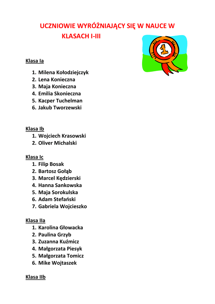 UCZNIOWIE WYRÓŻNIAJĄCY SIĘ W NAUCE W KLASACH I-III Klasa Ia 1. 2. 3. 4. 5. 6. Milena Kołodziejczyk Lena Konieczna Maja Konieczna Emilia Skonieczna Kacper Tuchelman Jakub Tworzewski Klasa Ib 1. Wojciech Krasowski 2. Oliver Michalski Klasa Ic 1. Filip Bosak 2. Bartosz Gołąb 3. Marcel Kędzierski 4. Hanna Sankowska 5. Maja Sorokulska 6. Adam Stefański 7. Gabriela Wojcieszko Klasa IIa 1. Karolina Głowacka 2. Paulina Grzyb 3. Zuzanna Kuźmicz 4. Małgorzata Piesyk 5. Małgorzata Tomicz 6. Mike Wojtaszek Klasa IIb 1. 2. 3. 4. Oliwier Bańkowski Julia Czarnecka Antoni Gołębiewski Hanna Olejarnik Klasa IIc 1. 2. 3. 4. 5. 6. 7. Oliwier Czerwiński Julia Emilianowicz Zofia Gryczewska Nadia Kozina Mateusz Kozłowski Wiktoria Pawlak Zuzanna Wyroślak Odznakę „Wzorowy uczeń” w klasach III otrzymali: Klasa IIIa 1. Wiktoria Baranowska 2. Julia Błaszczyk 3. Aleksandra Cybulska 4. Oliwia Iwach 5. Amelia Jankowska 6. Maciej Manikowski 7. Jakub Pater 8. Roksana Pietrzak 9. Joanna Różańska 10. Michalina Skonieczna 11. Filip Zań 12. Szymona Zań 13. Mateusz Zawarski Klasa IIIb 1. Aleksander Cylwik 2. Maciej Cymerman 3. Hanna Gryczewska 4. Hubert Hertel 5. Amelia Konieczna 6. Bartłomiej Sment 7. Julia Urbańska 8. Hanna Więcek 9. Jacob Wojtaszek 10. Maciej Wyroślak WZOROWE ZACHOWANIE W KLASACH IVVI OTRZYMALI UCZNIOWIE: Klasa IVa 1. Martyna Bąkowska 2. Marta Cierpiał 3. Jakub Emilianowicz 4. Patryk Nykiel 5. Maksymilian Okonek 6. Damian Parchem 7. Natalia Piesyk 8. Amanda Piwowar 9. Wiktoria Stachańska 10. Zuzanna Sumara 11. Anna Szymczak Klasa IVb 1. 2. 3. 4. 5. 6. 7. Maria Barna Julia Kocyła Izabela Kowalewska Oliwia Krajniewska Hanna Kudełka Wiktoria Kurlej Hanna Kuźmicz 8. Pola Pilżys 9. Jakub Stasiak 10. Jakub Sycz 11. Jakub Terlecki 12. Anastazja Zań Klasa Va 1. Weronika Mazurek 2. Laura Rzepka 3. Filip Zieliński Klasa Vb 1. 2. 3. 4. 5. 6. Joanna Cymerman Aleksandra Jarzębak Joanna Packań Adrianna Piesyk Mateusz Piotrowicz Aleksandra Tomicz Klasa VIa 1. 2. 3. 4. 5. Zuzanna Duda Natalia Kmetyk Emilia Michalska Nataniel Nykiel Nikola Zawarska Klasa VIb 1. 2. 3. 4. 5. 6. Roksana Florczak Alicja Konstantynowicz Oliwia Konstantynowicz Angelika Sikora Barbara Stanik Hanna Szremska NAJWYŻSZA ŚREDNIA OCEN W SZKOLE WYPRACOWANA PRZEZ KLASY IV - VI: 1. IVa i IVb – 4,45 2. Vb – 4,36 3. VIa – 4,17 NAJWYŻSZA FREKWENCJA: 1. Va – 93,10% 2. IVa – 91,79% 3. VIB – 89,99% 1. IIIb – 94,62% 2. IIa – 93,50% 3. IIIa – 91,38% Gratulujemy Stypendium naukowe Amanda Piwowar kl. IVa Aleksandra Tomicz kl. Vb Adrianna Piesyk kl. Vb Joanna Cymerman kl. Vb Angelika Sikora kl. VIb Nagroda „ Budzik” za 100 % frekwencję: 1. Bartosz Kantor kl. IIc 2. Hubert Hertel kl. IIIb 3. Szymon Wieczorek kl. IIIb 4. Wojciech Gołębiewski kl. IVa 5. Maciej Misiek kl. IVa 6. Aleksandra Piłat kl. IVa 7. Katarzyna Afeltowicz kl. Va 8. Aleksandra Jarzębak kl. Vb Gratulujemy NAJWYŻSZE OCENY WYPRACOWALI UCZNIOWIE: Aleksandra Tomicz – kl. Vb – 5,63 Amanda Piwowar – kl. IVa – 5,54 Joanna Cymerman – kl. Vb – 5,45 Adriana Piesyk – kl. Vb – 5,45 Martyna Bąkowska – kl. IVa – 5,36 Maria Barna – kl. IVb – 5,27 Pola Pilżys – kl. IVb – 5,27 Aleksandra Jarzębak – kl. Vb – 5,27 Cyprian Guzek – kl. VIa – 5,27 Angelika Sikora – kl. VIb – 5,27 Katarzyna Afeltowicz - kl. Va – 5,18 Joanna Packań – kl. Vb – 5,18 Natalia Kmetyk – kl. VIa – 5,18 Nikola Zawarska – kl. VIa – 5,18 Laura Rzepka – kl. Va – 5,10 Maksymilian Okonek – kl. IVa – 5,09 Natalia Piesyk – kl. IVa – 5,09 Zuzanna Sumara – kl. IVa – 5,09 Zuzanna Duda – kl. VIa – 5,09 Roksana Florczak – kl. VIb – 5,09 Alicja Konstantynowicz – kl. VIb – 5,09 Emilian Rakowski – kl. VIa – 5,09 Hanna Szremska – kl. VIb – 5,09 Marta Cierpiał – kl. IVa – 5,00 Wiktoria Stachańska – kl. IVa – 5,00 Jakub Emilianowicz – kl. IVa – 5,00 Jakub Stasiak – kl. IVb – 5,00 Jakub Terlecki – kl. IVb – 5,00 Oliwia Konstantynowicz – kl. VIb – 5,00 Barbara Stanik – kl. VIb – 5,00 Gratulujemy! Sportowiec Roku 2015/2016 Nikola Zawarska kl. VIa Nikola Kurlej kl. VIa Stypendium za szczególne osiągnięcia Maria Barna kl. IVb Aleksandra Tomicz kl. Vb Aleksandra Jarzębak kl. Vb Joanna Cymerman kl. Vb Natalia Kmetyk kl. VIa Nikola Zawarska kl. VIa Nikola Kurlej kl. VIa Jakub Kowalczyk kl. VIa Cyprian Guzek kl. VIa Alicja Konstantynowicz kl. VIb Oliwia Konstantynowicz kl. VIb
