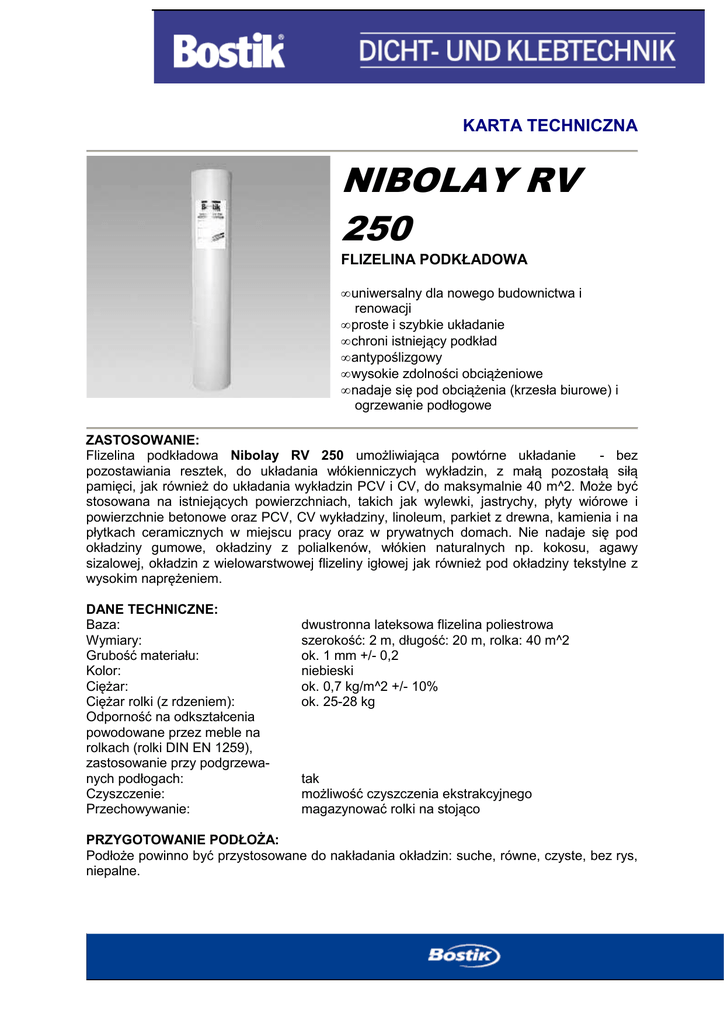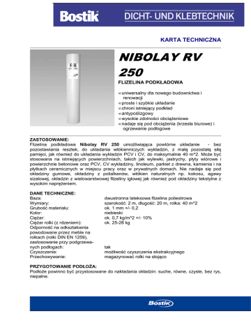 KARTA TECHNICZNA NIBOLAY RV 250 FLIZELINA PODKŁADOWA • uniwersalny dla nowego budownictwa i renowacji • proste i szybkie układanie • chroni istniejący podkład • antypoślizgowy • wysokie zdolności obciążeniowe • nadaje się pod obciążenia (krzesła biurowe) i ogrzewanie podłogowe ZASTOSOWANIE: Flizelina podkładowa Nibolay RV 250 umożliwiająca powtórne układanie - bez pozostawiania resztek, do układania włókienniczych wykładzin, z małą pozostałą siłą pamięci, jak również do układania wykładzin PCV i CV, do maksymalnie 40 m^2. Może być stosowana na istniejących powierzchniach, takich jak wylewki, jastrychy, płyty wiórowe i powierzchnie betonowe oraz PCV, CV wykładziny, linoleum, parkiet z drewna, kamienia i na płytkach ceramicznych w miejscu pracy oraz w prywatnych domach. Nie nadaje się pod okładziny gumowe, okładziny z polialkenów, włókien naturalnych np. kokosu, agawy sizalowej, okładzin z wielowarstwowej flizeliny igłowej jak również pod okładziny tekstylne z wysokim naprężeniem. DANE TECHNICZNE: Baza: Wymiary: Grubość materiału: Kolor: Ciężar: Ciężar rolki (z rdzeniem): Odporność na odkształcenia powodowane przez meble na rolkach (rolki DIN EN 1259), zastosowanie przy podgrzewanych podłogach: Czyszczenie: Przechowywanie: dwustronna lateksowa flizelina poliestrowa szerokość: 2 m, długość: 20 m, rolka: 40 m^2 ok. 1 mm +/- 0,2 niebieski ok. 0,7 kg/m^2 +/- 10% ok. 25-28 kg tak możliwość czyszczenia ekstrakcyjnego magazynować rolki na stojąco PRZYGOTOWANIE PODŁOŻA: Podłoże powinno być przystosowane do nakładania okładzin: suche, równe, czyste, bez rys, niepalne. SPOSÓB UŻYCIA: Przed przyłożeniem podłoża renowacyjnego Nibolay RV 250 na przygotowane uprzednio podłoże należy zgrubnie dopasować okładzinę wierzchnią np. dywanową, można ewentualnie wykonać szwy pomocnicze. Następnie zwinąć wykładzinę do połowy. Uważać, aby nie przesunęły się szwy. Następnie rozwinąć podkład Nibolay RV 250 w poprzek do okładziny wierzchniej (krótką stronę pokoju obrać za kierunek rozwijania maty). Dociąć po wewnętrznej stronie flizelinę podkładową z zachowaniem 3 mm odstępu od ścian, drzwi itp. Nacięcie kantów szwów w pojedynczych przypadkach może okazać się wymagane. Dla uniknięcia zanieczyszczeń z kleju należy dołożyć papierową banderole ochronną. PRZYKLEJANIE OKŁADZIN WIERZCHNICH NA NIBOLAY RV 250: Całopowierzchniowe przyklejanie warstw okładzin wierzchnich możliwe jest przy użyciu odpowiedniego kleju dyspersyjnego np. BOSTIK BEST lub NIBOFLOOR S 800. Po nałożeniu kleju i krótkim czasie odpowietrzenia przyłożyć warstwę wierzchnią i gruntownie trzeć od środka na zewnątrz. Bezpośrednio po przyklejeniu aż do momentu zupełnego związania kleju nie obciążać obszaru pracy. Meblowanie pomieszczeń przeprowadzać po zupełnym wyschnięciu kleju. W innej części pokoju dociąć ostatecznie okładzinę wierzchnią. Również w tym przypadku zachować ok. 1 mm odstępy. W obszarze szwów (spoin) zastosować papierowe banderole. Przy drzwiach oraz innych miejscach przejść przytwierdzić flizelinę podkładową za pomocą taśmy dwustronnej bądź szyny końcowej. Ważniejsze wskazówki: Przy układaniu flizeliny podkładowej na płytkach ceramicznych oraz kamiennych można zastosować cienką okładzinę wierzchnią (PCV, CV) na fugi między płytkami. OPAKOWANIE: rolka 40 m^2 Nr artykułu: 50-12500007 24 rolki na palecie