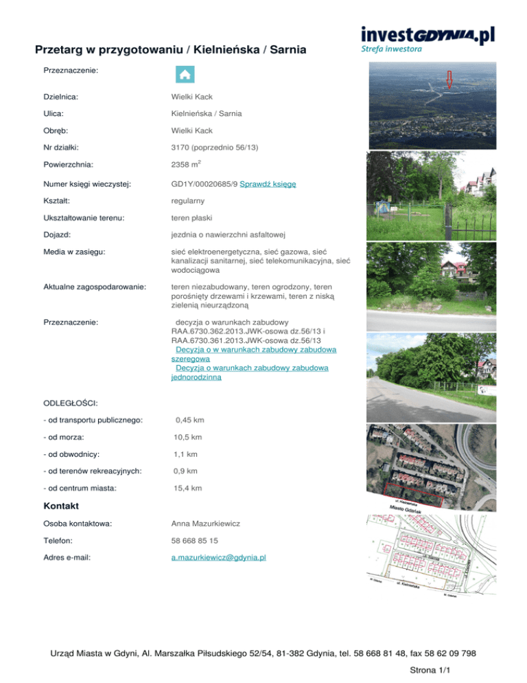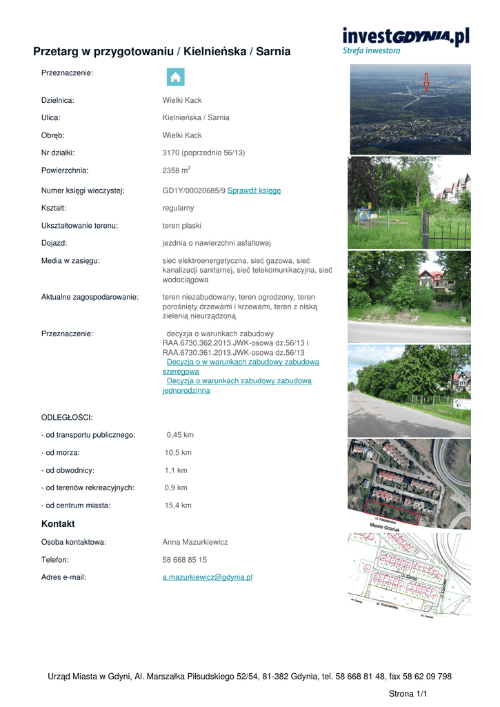 Przetarg w przygotowaniu / Kielnieńska / Sarnia Przeznaczenie: Dzielnica: Wielki Kack Ulica: Kielnieńska / Sarnia Obręb: Wielki Kack Nr działki: 3170 (poprzednio 56/13) Powierzchnia: 2358 m2 Numer księgi wieczystej: GD1Y/00020685/9 Sprawdź księgę Kształt: regularny Ukształtowanie terenu: teren płaski Dojazd: jezdnia o nawierzchni asfaltowej Media w zasięgu: sieć elektroenergetyczna, sieć gazowa, sieć kanalizacji sanitarnej, sieć telekomunikacyjna, sieć wodociągowa Aktualne zagospodarowanie: teren niezabudowany, teren ogrodzony, teren porośnięty drzewami i krzewami, teren z niską zielenią nieurządzoną Przeznaczenie: decyzja o warunkach zabudowy RAA.6730.362.2013.JWK-osowa dz.56/13 i RAA.6730.361.2013.JWK-osowa dz.56/13 Decyzja o w warunkach zabudowy zabudowa szeregowa Decyzja o warunkach zabudowy zabudowa jednorodzinna ODLEGŁOŚCI: - od transportu publicznego: 0,45 km - od morza: 10,5 km - od obwodnicy: 1,1 km - od terenów rekreacyjnych: 0,9 km - od centrum miasta: 15,4 km Kontakt Osoba kontaktowa: Anna Mazurkiewicz Telefon: 58 668 85 15 Adres e-mail: [email protected] Urząd Miasta w Gdyni, Al. Marszałka Piłsudskiego 52/54, 81-382 Gdynia, tel. 58 668 81 48, fax 58 62 09 798 Strona 1/1 Powered by TCPDF (www.tcpdf.org)