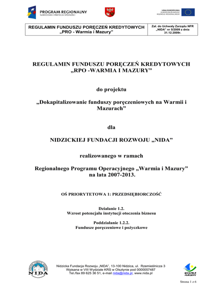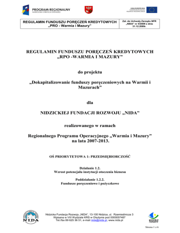 REGULAMIN FUNDUSZU PORĘCZEŃ KREDYTOWYCH „PRO - Warmia i Mazury” Zał. do Uchwały Zarządu NFR „NIDA” nr 5/2009 z dnia 31.12.2009r. REGULAMIN FUNDUSZU PORĘCZEŃ KREDYTOWYCH „RPO -WARMIA I MAZURY” do projektu „Dokapitalizowanie funduszy poręczeniowych na Warmii i Mazurach” dla NIDZICKIEJ FUNDACJI ROZWOJU „NIDA” realizowanego w ramach Regionalnego Programu Operacyjnego „Warmia i Mazury” na lata 2007-2013. OŚ PRIORYTETOWA 1: PRZEDSIĘBIORCZOŚĆ Działanie 1.2. Wzrost potencjału instytucji otoczenia biznesu Poddziałanie 1.2.2. Fundusze poręczeniowe i pożyczkowe Nidzicka Fundacja Rozwoju „NIDA”, 13-100 Nidzica, ul. Rzemieślnicza 3 Wpisana w VIII Wydziale KRS w Olsztynie pod 0000057487 Tel./fax 89 625 36 51, e-mail [email protected], www.nida.pl Strona 1 z 6 §1 PRZEDMIOT REGULAMINU Regulamin określa warunki udzielania poręczeń w ramach RPO „Warmia i Mazury” na lata 2007-2013 przez Fundusz Poręczeń Kredytowych Nidzickiej Fundacji Rozwoju „NIDA” zwany dalej Funduszem. §2 ZAKRES PODMIOTÓW, KTÓRE MOGĄ UZYSKAĆ PORĘCZENIE 1. Poręczenie uzyskać może przedsiębiorca w rozumieniu Ustawy o swobodzie działalności gospodarczej (Dz.U. z 2007 r. Nr 155 poz. 1095, z późn. zm.), spełniający warunki mikro, małego lub średniego przedsiębiorcy określone w ZAŁĄCZNIKU I do ROZPORZĄDZENIA KOMISJI (WE) NR 800/2008 z dnia 6 sierpnia 2008 r. (Dz. Urz. UE L 214 z 9 sierpnia 2008 r. z późn. zm.) uznającego niektóre rodzaje pomocy za zgodne ze wspólnym rynkiem w zastosowaniu art. 87 i 88 Traktatu (ogólnego rozporządzenia w sprawie wyłączeń blokowych), mający siedzibę na terenie województwa warmińskomazurskiego lub inwestujący na terenie województwa warmińsko-mazurskiego ze szczególnym uwzględnieniem przedsiębiorców, których główne miejsce wykonywania działalności mieści się w powiecie nidzickim i w powiatach woj. warmińsko-mazurskiego z nim sąsiadujących. 2. Przedsiębiorcy, o których mowa w ust 1. mogą ubiegać się o poręczenie Funduszu przeznaczone na zabezpieczenie finansowania, udzielanego im przez instytucje finansujące (np. banki, fundusze pożyczkowe, spółdzielcze kasy oszczędnościowokredytowe). 3. Poręczenie otrzymać może także przedsiębiorca, o którym mowa w ust. 1 rozpoczynający działalność gospodarczą. 4. Poręczenia nie są udzielane przedsiębiorcom znajdującym się w trudnej sytuacji, w rozumieniu Wytycznych Wspólnoty dotyczących pomocy państwa w celu ratowania i restrukturyzacji zagrożonych przedsiębiorstw (Dz. Urz. WE C 244/02 z 01.10.2004r.). §3 ZAKRES PRZEDMIOTOWY FINANSOWANIA 1. 2. 3. O poręczenie może ubiegać się każdy przedsiębiorca spełniający wymogi określone § 2. niniejszych zasad. Przedmiotem współfinansowania z udziałem poręczenia mogą być w szczególności przedsięwzięcia podnoszące mobilność i konkurencyjność istniejących przedsiębiorstw, przedsięwzięcia związane z utworzeniem nowego przedsiębiorstwa. Pożyczkobiorca może ubiegać się o poręczenie do kredytu uruchomionego, jeżeli kwota transzy pozostającej do wypłaty nie przekracza kwoty poręczenia. Nidzicka Fundacja Rozwoju „NIDA”, 13-100 Nidzica, ul. Rzemieślnicza 3 Wpisana w VIII Wydziale KRS w Olsztynie pod 0000057487 Tel./fax 89 625 36 51, e-mail [email protected], www.nida.pl Strona 2 z 6 §4 PODSTAWOWE WARUNKI UDZIELANIA PORĘCZEŃ 1. Przedsiębiorca, ubiegający się o poręczenie winien zapoznać się z niniejszym regulaminem i stwierdzić, czy przedsięwzięcie, które ma podlegać zabezpieczeniu spełnia warunki określone w § 3 niniejszego regulaminu. 2. Kierowane do Funduszu wnioski o poręczenia muszą być uzupełnione załącznikami: 1) Dokumentami rejestrowymi, a w szczególności: a) Zaświadczeniem o rejestracji podmiotu gospodarczego w sądzie rejestrowym lub odpowiednim organie ewidencyjnym, datowanym nie później niż na 6 miesięcy przed datą złożenia wniosku. b) NIP i REGON. 2) Kopiami dokumentów obrazującymi sytuację prawną i ekonomiczno-finansową przedsiębiorcy i finansowanego przedsięwzięcia, wymaganymi przez instytucję finansującą do oceny wniosku o finansowanie. 3) Oświadczeniem instytucji finansującej o przeprowadzeniu oceny wniosku o finansowanie oraz gotowości do finansowania w przypadku pozyskania poręczenia Funduszu (np. promesa, umowa kredytowa, oświadczenie). 4) Oświadczenia przedsiębiorcy o uzyskanej w ciągu ostatnich 3 lat pomocy de minimis. 5) Innymi dokumentami i informacjami, ustalonymi przez Fundusz w zależności od specyfiki przedsiębiorcy i planowanego przedsięwzięcia. 3. Na podstawie dokumentów określonych w ust. 2, Fundusz dokonuje oceny wniosku zgodnie ze stosowaną w Funduszu metodyką. 4. Ocena przedsięwzięć jest trzyetapowa i obejmuje: 1) Ocenę formalnoprawną dokumentów i informacji przedstawionych przez przedsiębiorcę, 2) Ocenę wstępną, 3) Ocenę ryzyka finansowego. 5. Po uzyskaniu pozytywnej oceny (na każdym z etapów określonych w ust. 4), wniosek wraz z wynikami oceny podlega zaopiniowaniu przez Komisję Kwalifikacyjną Funduszu (dalej Komisja). Wydając opinię Komisja dodatkowo uwzględnia czynniki ekonomiczne oddziaływania przedsięwzięcia na gospodarkę regionu. 6. Fundusz, jak i Komisja, dokonując oceny przedsięwzięcia, mogą zwrócić się do przedsiębiorcy oraz instytucji finansującej, o dostarczenie dodatkowych dokumentów i informacji na temat sytuacji prawnej i ekonomicznej wnioskodawcy oraz planowanego przedsięwzięcia. 7. Opinie Komisji mogą mieć charakter warunkowy w sytuacji, w której ocenie podlegają wnioski osób rozpoczynających działalność gospodarczą, które nie zawierają dokumentów zaświadczających o zarejestrowaniu / zaewidencjonowaniu działalności gospodarczej. W tym przypadku Fundusz wystawi poręczenie dopiero po uzupełnieniu wszystkich wymaganych dokumentów oraz, o ile stan faktyczny nie ulegnie zmianie. 8. Na podstawie opinii K