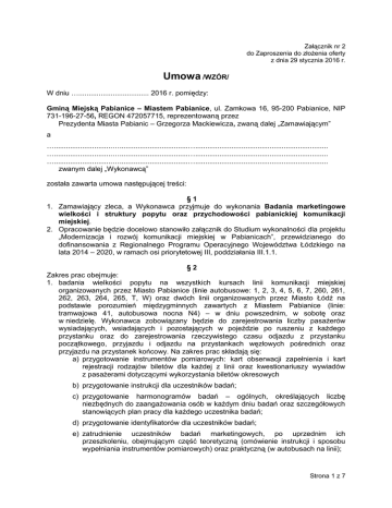 Załącznik nr 2 do Zaproszenia do złożenia oferty z dnia 29 stycznia 2016 r. Umowa /WZÓR/ W dniu …................................... 2016 r. pomiędzy: Gminą Miejską Pabianice – Miastem Pabianice, ul. Zamkowa 16, 95-200 Pabianice, NIP 731-196-27-56, REGON 472057715, reprezentowaną przez Prezydenta Miasta Pabianic – Grzegorza Mackiewicza, zwaną dalej „Zamawiającym” a ….............................…..................................….................................................................. ….............................…..................................….................................................................. ….............................…..................................….................................................................. zwanym dalej „Wykonawcą” została zawarta umowa następującej treści: §1 1. Zamawiający zleca, a Wykonawca przyjmuje do wykonania Badania marketingowe wielkości i struktury popytu oraz przychodowości pabianickiej komunikacji miejskiej. 2. Opracowanie będzie docelowo stanowiło załącznik do Studium wykonalności dla projektu „Modernizacja i rozwój komunikacji miejskiej w Pabianicach”, przewidzianego do dofinansowania z Regionalnego Programu Operacyjnego Województwa Łódzkiego na lata 2014 – 2020, w ramach osi priorytetowej III, poddziałania III.1.1. §2 Zakres prac obejmuje: 1. badania wielkości popytu na wszystkich kursach linii komunikacji miejskiej organizowanych przez Miasto Pabianice (linie autobusowe: 1, 2, 3, 4, 5, 6, 7, 260, 261, 262, 263, 264, 265, T, W) oraz dwóch linii organizowanych przez Miasto Łódź na podstawie porozumień międzygminnych zawartych z Miastem Pabianice (linie: tramwajowa 41, autobusowa nocna N4) – w dniu powszednim, w sobotę oraz w niedzielę. Wykonawca zobowiązany będzie do zarejestrowania liczby pasażerów wysiadających, wsiadających i pozostających w pojeździe po ruszeniu z każdego przystanku oraz do zarejestrowania rzeczywistego czasu odjazdu z przystanku początkowego, przyjazdu i odjazdu na przystankach węzłowych pośrednich oraz przyjazdu na przystanek końcowy. Na zakres prac składają się: a) przygotowanie instrumentów pomiarowych: kart obserwacji zapełnienia i kart rejestracji rodzajów biletów dla każdej z linii oraz kwestionariuszy wywiadów z pasażerami dotyczącymi wykorzystania biletów okresowych b) przygotowanie instrukcji dla uczestników badań; c) przygotowanie harmonogramów badań – ogólnych, określających liczbę niezbędnych do zaangażowania osób w każdym dniu badań oraz szczegółowych stanowiących plan pracy dla każdego uczestnika badań; d) przygotowanie identyfikatorów dla uczestników badań; e) zatrudnienie uczestników badań marketingowych, po uprzednim ich przeszkoleniu, obejmującym część teoretyczną (omówienie instrukcji i sposobu wypełniania instrumentów pomiarowych) oraz praktyczną (w autobusach na linii); Strona 1 z 7 f) nadzór merytoryczny i kontrola prawidłowości pracy uczestników badań marketingowych; g) zapewnienie transportu dla osób prowadzących badania uwzględniającego rozpoczynanie pracy we wczesnych godzinach porannych oraz kończenie pracy w późnych godzinach wieczornych (przy czym możliwe będzie korzystanie przez uczestników z kursów służbowych MZK do i z zajezdni, według harmonogramu ustalanego przez MZK Pabianice Sp. z o.o., po każdorazowym uzgodnieniu z dyspozytorem MZK). 2. liczbę pasażerów wsiadających do pociągów i wysiadających na stacji Pabianice oraz faktyczne czasy przyjazdów i odjazdów pociągów – w dniu powszednim, w sobotę oraz w niedzielę (badania stacjonarne; 3. badania struktury popytu (rodzaju biletu posiadanego przez pasażera oraz ewentualnego tytułu uprawnienia do przejazdu ulgowego lub bezpłatnego) 4. badania relacji przejazdu na liniach przekraczających granice strefy taryfowej (41, 260, 261, 262, 263, 265, N4, T, W); 5. badania wykorzystania biletów okresowych i czasowych, niezbędne do określenia wartości jednego przejazdu na podstawie biletu okresowego i czasowego o określonym nominale; 6. przyjmowanie od pasażerów ewentualnych uwag i sugestii dotyczących komunikacji miejskiej i ich podsumowanie; 7. edycja wielkości badań wielkości popytu do edytowalnych elektronicznych arkuszy kalkulacyjnych; 8. wydruk wyników badań wielkości popytu dla każdego z kursów w formie tabelarycznej; 9. przetworzenie danych z przeprowadzonych badań marketingowych obejmujące: a) sporządzenie zestawień wielkości popytu na usługi pabianickiej komunikacji miejskiej, w postaci tabel z liczbą pasażerów w poszczególnych kursach, parach kursów „tam i z powrotem” oraz w przeliczeniu na kilometr, w przekroju poszczególnych kursów, par kursów „tam” - „z powrotem” i linii, osobno dla dnia powszedniego, soboty i niedzieli oraz w przekrojach czasowych – półtora- i trzygodzinnych porach dnia; b) obliczenie średniomiesięcznej liczby pasażerów dla poszczególnych linii oraz obliczenie średniomiesięcznej liczby pasażerów w przeliczeniu na kilometr dla każdej linii; c) obliczenie przychodowości, kosztochłonności i rentowności każdego z kursów i każdej z linii oraz sporządzenie zestawień rentowności dla całej badanej sieci komunikacyjnej w dniu powszednim, w sobotę, w niedzielę oraz w przeciętnym miesiącu, także osobno dla każdej z obsługiwanych gmin; d) obliczenie struktury pasażerów dla każdej z linii, każdej obsługiwanej gminy i całej badanej sieci komunikacyjnej, e) obliczenie kwot refundacji z tytułu stosowania ulg i zwolnień z opłat, dla każdej z linii i każdej z obsługiwanych gmin oraz całej badanej sieci komunikacyjnej, osobno dla dnia powszedniego, soboty, niedzieli i przeciętnego miesiąca; 10. wykonanie opracowania analitycznego, w którym zostaną omówione następujące treści: a) omówienie wyników badań marketingowych pabianickiej ko