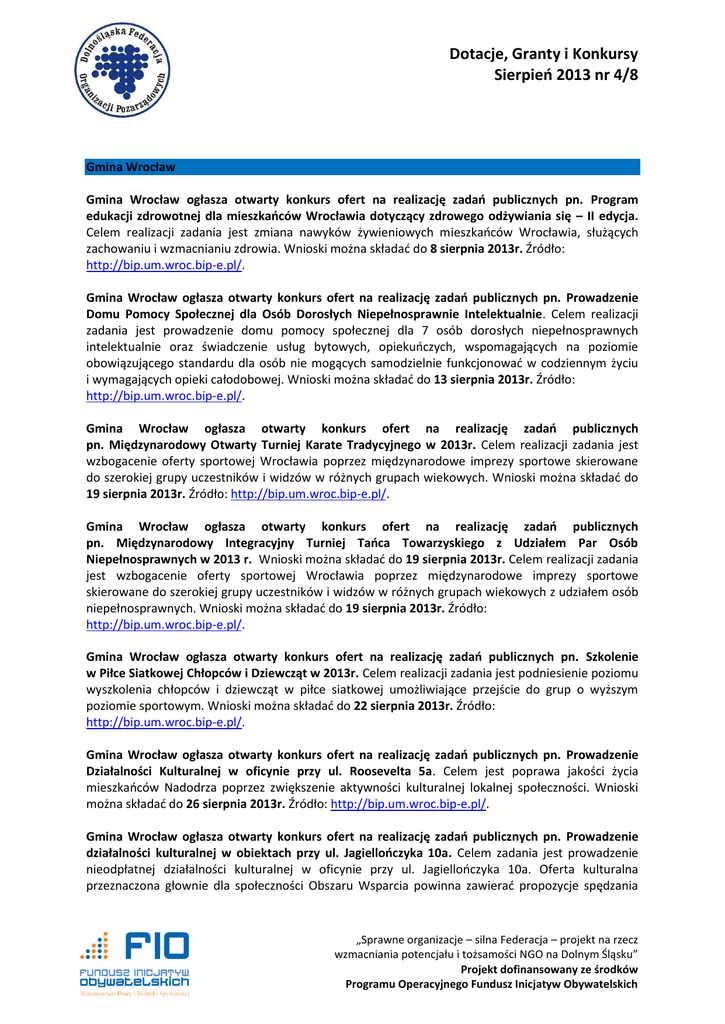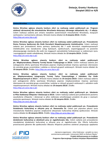 Dotacje, Granty i Konkursy Sierpień 2013 nr 4/8 Gmina Wrocław Gmina Wrocław ogłasza otwarty konkurs ofert na realizację zadań publicznych pn. Program edukacji zdrowotnej dla mieszkańców Wrocławia dotyczący zdrowego odżywiania się – II edycja. Celem realizacji zadania jest zmiana nawyków żywieniowych mieszkańców Wrocławia, służących zachowaniu i wzmacnianiu zdrowia. Wnioski można składać do 8 sierpnia 2013r. Źródło: http://bip.um.wroc.bip-e.pl/. Gmina Wrocław ogłasza otwarty konkurs ofert na realizację zadań publicznych pn. Prowadzenie Domu Pomocy Społecznej dla Osób Dorosłych Niepełnosprawnie Intelektualnie. Celem realizacji zadania jest prowadzenie domu pomocy społecznej dla 7 osób dorosłych niepełnosprawnych intelektualnie oraz świadczenie usług bytowych, opiekuńczych, wspomagających na poziomie obowiązującego standardu dla osób nie mogących samodzielnie funkcjonować w codziennym życiu i wymagających opieki całodobowej. Wnioski można składać do 13 sierpnia 2013r. Źródło: http://bip.um.wroc.bip-e.pl/. Gmina Wrocław ogłasza otwarty konkurs ofert na realizację zadań publicznych pn. Międzynarodowy Otwarty Turniej Karate Tradycyjnego w 2013r. Celem realizacji zadania jest wzbogacenie oferty sportowej Wrocławia poprzez międzynarodowe imprezy sportowe skierowane do szerokiej grupy uczestników i widzów w różnych grupach wiekowych. Wnioski można składać do 19 sierpnia 2013r. Źródło: http://bip.um.wroc.bip-e.pl/. Gmina Wrocław ogłasza otwarty konkurs ofert na realizację zadań publicznych pn. Międzynarodowy Integracyjny Turniej Tańca Towarzyskiego z Udziałem Par Osób Niepełnosprawnych w 2013 r. Wnioski można składać do 19 sierpnia 2013r. Celem realizacji zadania jest wzbogacenie oferty sportowej Wrocławia poprzez międzynarodowe imprezy sportowe skierowane do szerokiej grupy uczestników i widzów w różnych grupach wiekowych z udziałem osób niepełnosprawnych. Wnioski można składać do 19 sierpnia 2013r. Źródło: http://bip.um.wroc.bip-e.pl/. Gmina Wrocław ogłasza otwarty konkurs ofert na realizację zadań publicznych pn. Szkolenie w Piłce Siatkowej Chłopców i Dziewcząt w 2013r. Celem realizacji zadania jest podniesienie poziomu wyszkolenia chłopców i dziewcząt w piłce siatkowej umożliwiające przejście do grup o wyższym poziomie sportowym. Wnioski można składać do 22 sierpnia 2013r. Źródło: http://bip.um.wroc.bip-e.pl/. Gmina Wrocław ogłasza otwarty konkurs ofert na realizację zadań publicznych pn. Prowadzenie Działalności Kulturalnej w oficynie przy ul. Roosevelta 5a. Celem jest poprawa jakości życia mieszkańców Nadodrza poprzez zwiększenie aktywności kulturalnej lokalnej społeczności. Wnioski można składać do 26 sierpnia 2013r. Źródło: http://bip.um.wroc.bip-e.pl/. Gmina Wrocław ogłasza otwarty konkurs ofert na realizację zadań publicznych pn. Prowadzenie działalności kulturalnej w obiektach przy ul. Jagiellończyka 10a. Celem zadania jest prowadzenie nieodpłatnej działalności kulturalnej w oficynie przy ul. Jagiellończyka 10a. Oferta kulturalna przeznaczona głownie dla społeczności Obszaru Wsparcia powinna zawierać propozycje spędzania „Sprawne organizacje – silna Federacja – projekt na rzecz wzmacniania potencjału i tożsamości NGO na Dolnym Śląsku” Projekt dofinansowany ze środków Programu Operacyjnego Fundusz Inicjatyw Obywatelskich Dotacje, Granty i Konkursy Sierpień 2013 nr 4/8 wolnego czasu dla różnych grup wiekowych. Wnioski można składać do 26 sierpnia 2013r. Źródło: http://bip.um.wroc.bip-e.pl/. Urząd Marszałkowski Zarząd Województwa Dolnośląskiego ogłasza otwarty konkurs ofert na realizację zadań publicznych z zakresu turystyki w 2013r. Celem konkursu ofert jest wyłonienie i wsparcie projektów w zakresie turystyki wraz z udzieleniem dotacji na dofinansowanie ich realizacji. Rodzaje zadań objętych konkursem: A. Zadania w zakresie upowszechniania turystyki i promowania walorów turystycznych regionu – imprezy turystyczne, zwłaszcza dla dzieci i młodzieży, konferencje, seminaria dotyczące rozwoju turystyki i promocji regionu, wydawnictwa o charakterze turystycznym (przewodniki, foldery, katalogi, informatory itp.) oraz promowanie lokalnych produktów i atrakcji turystycznych na krajowych lub zagranicznych targach turystycznych. B. Zadania w zakresie tworzenia jednolitego systemu informacji turystycznej na Dolnym Śląsku z wykorzystaniem nowoczesnych technologii, wyznaczanie nowych i renowacja istniejących szlaków turystycznych i tematycznych w województwie dolnośląskim. Oferty należy składać do dnia 14 sierpnia 2013r. Szczegóły: http://bip.umwd.dolnyslask.pl/. Zarząd Województwa Dolnośląskiego ogłasza otwarty konkurs ofert na realizację zadań publicznych z zakresu kultury fizycznej w latach 2013-2015. Celem konkursu jest wyłonienie i dofinansowanie projektu na realizację zadania publicznego z zakresu kultury fizycznej realizowanych na rzecz społeczności Dolnego Śląska wraz z udzieleniem dotacji na dofinansowanie jego realizacji. Celem jest rozwój społeczno-ekonomiczny województwa dolnośląskiego, zaspokojenie potrzeb i poprawa warunków oraz podnoszenie poziomu życia mieszkańców regionu, a w szczególności przeciwdziałanie patologiom społecznym, zapewnienie edukacji zdrowotnej, przede wszystkim dzieci i młodzieży, wyrównywanie szans życiowych osób niepełnosprawnych oraz zagospodarowanie czasu wolnego. Oferty należy składać do dnia 22 sierpnia 2013r. Szczegóły: http://bip.umwd.dolnyslask.pl/. Dotacje udzielane z pominięciem otwartego konkursu ofert. Istnieje możliwość otrzymania dotacji na realizację zadania publicznego w sferze działalności wspomagającej rozwój wspólnot i społeczności lokalnych, promocji i organizacji wolontariatu oraz działalności na rzecz organizacji pozarządowych oraz podmiotów wymienionych w art. 3 ust. 3 ustawy o p