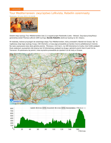 Tour Mediterraneen: zwycięstwo Lofkvista, Rebellin osiemnasty Niedziela, 10 Luty 2013, 22:16:08 Ostatni etap wyścigu Tour Méditerranéen (kat.2.1) wygrał Jurgen Roelandts (Lotto – Belisol). Zwycięzcą klasyfikacji generalnej został Thomas Lofkvist (IAM Cycling), Davide Rebellin ukończył wyścig na 18. miejscu. W niedzielę, kolarze przystąpili do ostatniego etapu Tour Méditerranéen, który prowadził z Bandol do Grasse. Był to najdłuższy etap tego wyścigu liczący 192 kilometry a trasa jego prowadziła po bardzo mocno pofałdowanym terenie. Na rasie usytuowane były dwie górskie premie. Pierwsza z nich kat.1, na 100 kilometrze to trudny choć krótki podjazd. Dużo większym wyzwaniem dla kolarzy był 10 kilometrowy podjazd na drugą z górskich premii (kat.2) pod Col du Tanneron. Po pokonaniu tej premii, trasa wyraźnie prowadziła po zjazdach aż do mety w Grasse. Zaraz po stracie kolarzy w Bandol, wielu „śmiałków” próbowało odjechać od peletonu. Nie było to proste, gdyż ekipy wzajemnie się kontrolowały nie dopuszczając do odjazdu kogokolwiek. Skuteczny atak grupy kolarzy nastąpił około 20 kilometra, kiedy na trasie etapu pojawił się pierwszy podjazd. Wówczas odjechała grupa 17 kolarzy. Współpraca między kolarzami układała się bardzo dobrze co spowodowało, że ucieczka zaczęła szybko powiększać przewagę nad peletonem. Gdy na 100 kilometrze kolarze pokonywali pierwszą górską premie kat.1. przewaga ucieczki wynosiła ponad 3 minuty. Na kolejnej górskiej premii, po pokonaniu dość trudnego podjazdu pod Col du Tanneron, przewaga zmniejszyła się do 2,5 minuty. W ucieczce jechało już tylko 12 kolarzy. Gdy do mety pozostawało coraz mniej kilometrów w peletonie zaczęto organizować pościg w który zaangażowały się szczególnie ekipy AG2R Mondiale i RadioShack. Z uciekającej grupy zaczęli wykruszać się kolejni uciekinierzy a mocno pracujący peleton szybko likwidował przewagę. Niestety, nikomu z kolarzy uciekającej grupy nie udało się dojechać na metę przed peletonem. Rozpędzony peleton zlikwidował ucieczkę i mocno porwany zmierzał do mety w Grasse. Zwycięzcą etapu został Jurgen Roelandts z Lotto-Belisol, który o 4 sekundy wyprzedził Francesco Redę (Androni) i o 14 sek. Mikele Nievea z Euskatelu. Kolejni kolarze przekraczali metę w sekundowych odstępach. Davide Rebellin przekroczył metę na 24. miejscu tracąc do zwycięzcy 41 sekund. Kolejnym kolarzem CCC Polsat Polkowice, który dojechał do mety był Adrian Honkisz. Zajął on 84. miejsce ze stratą około 16 minut. Zwycięzcą klasyfikacji generalnej został Thomas Lofkvist (IAM Cycling). Davide Rebellin (CCC Polsat Polkowice) zajął ostatecznie 18. miejsce ze strata do zwycięzcy 2 min. I 17 sek. Wyniki 5.etapu, Bandol – Grasse, 192 km 1. Jurgen Roelandts (Lotto-Belisol) - 4:54:49 2. Francesco Reda (Androni – Venezuela) 0:04 3. Mikele Nieve (Euskaltel) 0:13 24. Davide Rebellin 0:41 84. Adrian Honkisz 15:47 DNF. Łukasz Owsian DNF. Tomasz KIendyś DNF. Piotr Gawroński DNF. Paweł Charucki Klasyfikacja generalna wyścigu 1. Thomas Lofkvist (IAM Cycling) 12:27:24 2. Jean- Christophe Péraud (AG2R La Mondiale) 3. Francesco Reda (Androni – Venezuela 0:11 18. Davide Rebellin 2:17 98. Adrian Honkisz 34:08 źródło map: velowire.com