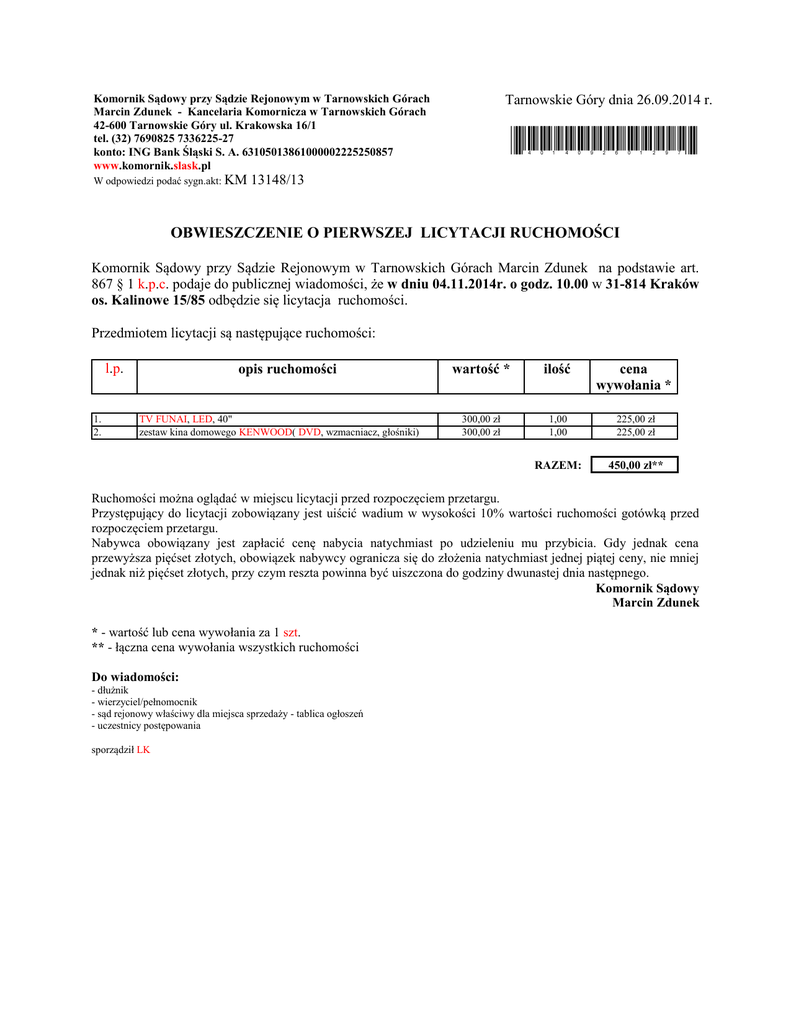 Tarnowskie Góry dnia 26.09.2014 r. Komornik Sądowy przy Sądzie Rejonowym w Tarnowskich Górach Marcin Zdunek - Kancelaria Komornicza w Tarnowskich Górach 42-600 Tarnowskie Góry ul. Krakowska 16/1 tel. (32) 7690825 7336225-27 konto: ING Bank Śląski S. A. 63105013861000002225250857 www.komornik.slask.pl W odpowiedzi podać sygn.akt: KM *4014092601297* 13148/13 OBWIESZCZENIE O PIERWSZEJ LICYTACJI RUCHOMOŚCI Komornik Sądowy przy Sądzie Rejonowym w Tarnowskich Górach Marcin Zdunek na podstawie art. 867 § 1 k.p.c. podaje do publicznej wiadomości, że w dniu 04.11.2014r. o godz. 10.00 w 31-814 Kraków os. Kalinowe 15/85 odbędzie się licytacja ruchomości. Przedmiotem licytacji są następujące ruchomości: opis ruchomości l.p. 1. 2. TV FUNAI, LED, 40" zestaw kina domowego KENWOOD( DVD, wzmacniacz, głośniki) wartość * ilość cena wywołania * 300,00 zł 300,00 zł 1,00 1,00 225,00 zł 225,00 zł RAZEM: 450,00 zł** Ruchomości można oglądać w miejscu licytacji przed rozpoczęciem przetargu. Przystępujący do licytacji zobowiązany jest uiścić wadium w wysokości 10% wartości ruchomości gotówką przed rozpoczęciem przetargu. Nabywca obowiązany jest zapłacić cenę nabycia natychmiast po udzieleniu mu przybicia. Gdy jednak cena przewyższa pięćset złotych, obowiązek nabywcy ogranicza się do złożenia natychmiast jednej piątej ceny, nie mniej jednak niż pięćset złotych, przy czym reszta powinna być uiszczona do godziny dwunastej dnia następnego. Komornik Sądowy Marcin Zdunek * - wartość lub cena wywołania za 1 szt. ** - łączna cena wywołania wszystkich ruchomości Do wiadomości: - dłużnik - wierzyciel/pełnomocnik - sąd rejonowy właściwy dla miejsca sprzedaży - tablica ogłoszeń - uczestnicy postępowania sporządził LK