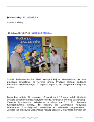 Jesteś tutaj: Aktualności > Szkoła z klasą… 20 listopad 2014 07:46 Szkoła z klasą… Szkoła Podstawowa im. Marii Konopnickiej w Niewieścinie jak inne placówki oświatowe na terenie gminy Pruszcz została poddana badaniom ewaluacyjnym. Z raportu wynika, że otrzymała najwyższą ocenę. Badaniem objęto 36 uczniów, 19 rodziców i 10 nauczycieli. Badanie zostało dokonane przez wizytatorów ds. ewaluacji: Monikę Laskowską i Violettę Tyborowską. Wizytacja ta dotyczyła 3 z 12 obszarów funkcjonowania szkoły. Te obszary to: „uczniowie nabywają wiadomości i umiejętności określone w podstawie programowej”, „szkoła lub placówka wspomaga rozwój uczniów , z uwzględnieniem ich http://www.pruszcz.pl/blog/1_371-szkola_z_klasa_.html Strona 1/3 indywidualnych sytuacji”, „szkoła lub placówka, organizując procesy edukacyjne, uwzględnia wnioski z analizy wyników sprawdzianu, egzaminu gimnazjalnego, maturalnego, potwierdzającego kwalifikacje zawodowe i egzaminu potwierdzającego kwalifikacje w zawodzie oraz innych badan zewnętrznych i wewnętrznych”. Szkoła otrzymała tzw. poziom A, tj. oznaczający bardzo wysoki stopień wypełniania wymagań przez szkołę. –Na wynik ten składa się wiele elementówmówi dyr. Jolanta Waszak.Nauczyciele to wykwalifikowana kadra pedagogiczna, która ciągle się dokształca, wzbogaca swój warsztat pracy. Nasz budynek szkoły jest systematycznie remontowany, odnawiany, jest plac zabaw dla dzieci boiska przyszkolne. Placówka pracuje na jedna zmianę co umożliwia dzieciom uczestniczyć w różnych dodatkowych zajęciach. U nas działa wiele kół zainteresowań, prowadzone są zajęcia dydaktycznowyrównawcze, korekcyjno-kompensacyjne, logopedyczne. Bardzo prężnie działa Rada Rodziców, która wspólnie z nami jest współorganizatorem w ciągu roku wielu wspaniałych imprez i spotkań. Szkoła to także miejsce kultury i integracji lokalnej społecznościdodaje. Wręczenie raportu z ewaluacji problemowej było okazją do miłego spotkania w szkole. Wizytator Violetta Tyborowska wręczyła raport wójtowi gminy Franciszkowi Koszowskiemu oraz dyr. SP Jolancie Waszak. Przy okazji z racji kończącej się kadencji wójta były kwiaty a także życzenia i róże dla ks. Andrzeja Danielskiego, proboszcza parafii w Niewieścinie z racji 10 rocznicy objęcia parafii. Po części oficjalnej dla całej społeczności szkolnej i gości zaśpiewał chór „Biedronki”. Tym razem były to piosenki biesiadne, łatwo wpadające w ucho. Przerywnikiem ich kolejnych występów były wiersze Natalii Paliwoda z jej tomiku wierszy. Jej twórczość przedstawili uczniowie podstawówki. Natalia, była absolwentka tejże placówki również była obecna na tej niecodziennej uroczystości. KP „Czas Świecia”, listopad 2014 r. http://www.pruszcz.pl/blog/1_371-szkola_z_klasa_.html Strona 2/3 FOTORELACJA drukuj Wróć http://www.pruszcz.pl/blog/1_371-szkola_z_klasa_.html Powered by TCPDF (www.tcpdf.org) Strona 3/3