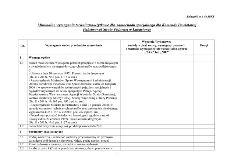 Załącznik nr 1 do SIWZ Minimalne wymagania techniczno-użytkowe dla samochodu specjalnego dla Komendy Powiatowej Państwowej Straży Pożarnej w Lubartowie Lp. Wypełnia Wykonawca (należy wpisać nazwę, wymagany parametr o wartości wymaganej lub wyższej albo wybrać „TAK” lub „NIE” Wymagania wobec przedmiotu zamówienia 1 Wymaga ogólne 1.1 1.2 Pojazd musi spełniać wymagania polskich przepisów o ruchu drogowym z uwzględnieniem wymagań dotyczących pojazdów uprzywilejowanych tj; - Ustawy z dnia 20 czerwca 1997r. Prawo o ruchu drogowym (Dz. U z 2012r. Nr 0 poz. 1137 ze zm.), - Rozporządzenia Ministrów: Spraw Wewnętrznych i administracji, Obrony narodowej, Finansów oraz Sprawiedliwości z dnia 24 listopada 2004 r. w sprawie warunków technicznych pojazdów specjalnych i pojazdów używanych do celów specjalnych Policji, Agencji Bezpieczeństwa Wewnętrznego, Agencji Wywiadu, Straży Granicznej, kontroli skarbowej, Służby Celnej, Służby Więziennej i Straży Pożarnej (Dz. U z 2011r. Nr 165 poz. 992 z późn. zm.) - Rozporządzenia Ministra Infrastruktury z dnia 31 grudnia 2002r. w sprawie warunków technicznych pojazdów oraz zakresu ich niezbędnego wyposażenia (Dz. U Nr 32 z 2003r. poz. 262 z późn. zm.) - Pojazd musi posiadać świadectwo homologacji zgodnie z art. 68 ustawy z dnia 20 czerwca 1997r. Prawo o ruchu drogowym (Dz. U z 2012r. Nr 0 poz. 1137 ze zm.). Samochód fabrycznie nowy, rok produkcji samochodu 2013. 2 Parametry eksploatacyjne 2.1 Rodzaj nadwozia – samochód osobowy przystosowany do przewozu dziewięciu osób łącznie z kierowcą. Należy podać markę i model. Kolor nadwozia czerwony, zderzaki w kolorze nadwozia Liczba drzwi – 4 (2 szt. w przedziale kierowcy, drzwi przesuwane w 2.2 2.3 1 Uwagi 2.9 przestrzeni pasażerskiej z prawej strony, - klapa tylna z oknem ogrzewanym i wycieraczką. Siedzenia – 9 szt. Sposób konfiguracji: przedział kierowcy 1+2, przedział pasażerski – pierwszy rząd 1(odchylane) + 2, drugi rząd – trzyosobowe. Siedzenia w przestrzeni pasażerskiej składane i łatwe w demontażu w celu zwiększenia przestrzeni bagażowej. Podłoga w przestrzeni bagażowej wykonana z materiałów łatwo zmywalnych. Silnik wysokoprężny o pojemności min. 1900 cm3 , umieszczony z przodu pojazdu, produkowany seryjnie bez przeróbek, spełniający wymagania normy czystości spalin Euro5, napęd na oś przednią. Minimalna moc silnika 140kM Średnie zużycie paliwa w cyklu mieszanym wg danych producenta max 8 l/100 km – (należy podać wartość z dokładnością do jednego miejsca po przecinku). Skrzynia biegów manualna o sześciu przełożeniach Wymiary pojazdu: długość – min 5000mm, szerokość bez lusterek max. 2000mm, wysokość bryły pojazdu max. 2000mm, rozstaw osi – min. 3300 mm, Dopuszczalna masa całkowita ciągniętej przyczepki z hamulcem 2,5 t 3 Wyposażenie zwiększające bezpieczeństwo 3.1 - system zapobiegający blokowaniu kół podczas hamowania - ABS, - system zapobiegający utracie przyczepności kół podczas przyspieszania, - elektroniczny system stabilizacji toru jazdy z asystentem hamowania, - elektroniczna blokada mechanizmu różnicowego, - system zapobiegający poślizgowi kół napędzanych podczas hamowania silnikiem, - bezwładnościowe pasy bezpieczeństwa, - min. dwie poduszki powietrzne kierowcy i pasażera - hamulce tarczowe wentylowane na kołach osi przedniej i tylnej, 4 Wyposażenie 4.1 - podłokietnik przy siedzeniu kierowcy - siedzenie podwójne obok kierowcy - możliwość regulacji fotela kierowcy, wszystkie fotele wyposażone w zagłówki 2.4 2.5 2.6 2.7 2.8 2 - klimatyzacja trzystrefowa wyposażona w dwa agregaty (dla przedniej i tylnej części pojazdu) z elektroniczną regulacją, z dodatkowym sterowaniem w przestrzeni pasażerskiej, - wspomaganie układu kierowniczego - regulacja wysokości i kąta kierownicy, - elektrycznie otwierane szyby w drzwiach przednich pojazdu - elektrycznie podgrzewane i sterowane lusterka - centralny zamek sterowany drogą radiową, - immobiliser - alternator i akumulator wzmocniony - kierownica obszyta skórą - zabezpieczenie przed złamaniem blokady kierownicy - komputer pokładowy - pełnowymiarowe koło zapasowe - czujniki parkowania w przednim i tylnym zderzaku - hak holowniczy kulowy - radioodtwarzacz CD/mp3 wraz z instalacją radiową i głośnikami rozmieszczonymi w przestrzeni kierowcy i pasażerskiej - światła przeciwmgielne z przodu zintegrowane ze zderzakiem i z tyłu - wszystkie szyby termoizolacyjne -ogrzewanie przestrzeni pasażerskiej dodatkowy wymiennik ciepła - przyciemniane szyby w przestrzeni pasażerskiej – oklejone folią o przepuszczalności światła 30%. - oświetlenie kabiny kierowcy i minimum 1 lampka do czytania - oświetlenie w przedziale pasażerskim - min. 2 gniazda zapalniczki 12V, jedno w przedziale kierowcy, oraz co najmniej jedno w przedziale pasażersko-bagażowym - wyłożenie boków, sufitu oraz słupków materiałem z tworzywa sztucznego - podłoga wyłożona wykładziną gumową w przedziale kierowcy oraz w przestrzeni pasażersko-ładunkowej - felgi aluminiowe min. 16” z oponami letnimi - dodatkowy komplet kół z felgami stalowymi 16” i oponami zimowymi 5 5.1 Wyposażenie specjalne Oznakowanie: Pojazd oznakowany zgodnie z Załącznikiem Nr 1 do Zarządzenia nr 13 Komendy Głównej Państwowej Straży Pożarnej z dnia 27 grudnia 3 5.2 5.3 5.4 5.5 5.6 6 6.1 7 7.1 8 8.1 2012 r. w sprawie gospodarki transportowej w jednostkach organizacyjnych Państwowej Straży Pożarnej -pas wyróżniający barwy czerwonej sygnałowej z folii odblaskowej magnetycznej po obu stronach pojazdu, na pasie na drzwiach przednich po obu stronach napis straż barwy białej, w dalszym ciągu pasa numery operacyjne barwy białej, Pojazd wyposażony w modulator sygnałów alarmowych Haztec 8-8122PL „lub równoważny” z głośnikiem o mocy min. 100W. Na dachu pojazdu lampa magnetyczna Federal LM400 SL „lub równowa