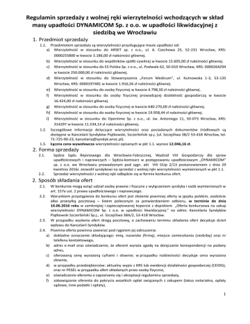 Regulamin sprzedaży z wolnej ręki wierzytelności wchodzących w skład masy upadłości DYNAMICOM Sp. z o.o. w upadłości likwidacyjnej z siedzibą we Wrocławiu 1. Przedmiot sprzedaży 1.1. Przedmiotem sprzedaży są wierzytelności przysługujące masie upadłości od: Wierzytelność w stosunku do ARSET sp. z o.o., ul. A. Czechowa 25, 52-231 Wrocław, KRS: 0000255800 w kwocie 3.186,00 zł należności głównej. b) Wierzytelność w stosunku do wspólników spółki cywilnej w kwocie 15.605,00 zł należności głównej. c) Wierzytelność w stosunku do ES Polska Sp. z o.o., ul. Podwale 62, 50-010 Wrocław, KRS: 0000264294 w kwocie 250.000,00 zł należności głównej. d) Wierzytelność w stosunku do Stowarzyszenia „Forum Medicum”, ul. Kutnowska 1-3, 53-135 Wrocław, KRS: 0000197481 w kwocie 1.916,56 zł należności głównej. a) e) Wierzytelność w stosunku do osoby fizycznej w kwocie 4.798,30 zł należności głównej. f) g) Wierzytelność w stosunku do osoby fizycznej prowadzącej działalność gospodarczą w kwocie 16.424,00 zł należności głównej. Wierzytelność w stosunku do osoby fizycznej w kwocie 640.270,00 zł należności głównej. h) Wierzytelność w stosunku do osoby fizycznej w kwocie 19.958,44 zł należności głównej. i) Wierzytelność w stosunku do Opentime Sp. z o.o., ul. św. Antoniego 11, 50-073 Wrocław, KRS: 1.2. 1.3. 314297 w kwocie 11.534,14 zł należności głównej. Szczegółowe informacje dotyczące wierzytelności oraz posiadanych dokumentów źródłowych są dostępne w Kancelarii Syndyków Piątkowski, Szczerbiński sp.j. (ul. Szczęśliwa 38/2 53-418 Wrocław, tel. 71-725-90-23, [email protected]). Łączna cena wywoławcza wierzytelności opisanych w pkt 1.1. wynosi 12.046,16 zł. 2. Forma sprzedaży 2.1. 2.2. Sędzia Sądu Rejonowego dla Wrocławia-Fabrycznej, Wydział VIII Gospodarczy dla spraw upadłościowych i naprawczych – Sędzia-komisarz w postępowaniu upadłościowym „DYNAMICOM” sp. z o.o. we Wrocławiu prowadzonym pod sygn. akt VIII GUp 2/13 postanowieniem z dnia 29 kwietnia 2016r. zezwolił syndykowi na sprzedaż z wolnej ręki wierzytelności wymienionych w pkt 1.1. Sprzedaż wierzytelności z wolnej ręki odbędzie się w formie konkursu ofert. 2. Sposób składania ofert 2.1. W konkursie mogą wziąć udział osoby prawne i fizyczne z wyłączeniem syndyka i osób wymienionych w art. 157a ust. 2 prawa upadłościowego i naprawczego. 2.2. Warunkiem przystąpienia do konkursu ofert jest złożenie pisemnej oferty w języku polskim, osobiście albo przesyłką pocztową – listem poleconym za potwierdzeniem odbioru, w terminie do dnia 10.06.2016 roku w zamkniętej i zapieczętowanej kopercie z dopiskiem „Oferta konkursowa na zakup wierzytelności DYNAMICOM Sp. z o.o. w upadłości likwidacyjnej.” na adres: Kancelaria Syndyków Piątkowski Szczerbiński Sp.j., ul. Szczęśliwa 38A/2, 53-418 Wrocław. 2.3. W przypadku wysłania ofert drogą pocztową, o zachowaniu terminu składania ofert decyduje dzień wpływu do Kancelarii Syndyków. 2.4. Pisemna oferta powinna zawierać pod rygorem jej odrzucenia: a) dokładne oznaczenie składającego: imię, nazwisko (firmę), miejsce zamieszkania (siedzibę) oraz nr telefonu kontaktowego, b) adres e-mail oraz oświadczenie, że oferent wyraża zgodę na doręczanie korespondencji na podany adres, c) oferowaną cenę wyrażoną cyframi i słownie; w przypadku rozbieżności decyduje cena wyrażona słownie, d) w przypadku przedsiębiorców: aktualny wypis z KRS lub ewidencji działalności gospodarczej (CEIDG), oraz nr PESEL w przypadku ofert składanych przez osoby fizyczne, e) oświadczenie oferenta o zapoznaniu się i akceptacji regulaminu sprzedaży, f) zobowiązanie oferenta do pokrycia wszelkich opłat związanych z zakupem (taksa notarialna, opłaty sądowe, inne podatki i opłaty), 1 g) oświadczenie o zapoznaniu się ze stanem prawnym i faktycznym oferowanych przez Syndyka wierzytelności, h) numer rachunku bankowego dla ewentualnego zwrotu wadium w przypadku niewygrania konkursu, i) dowód wpłaty wadium. 2.5. Uczestnicy konkursu są związani złożoną ofertą do terminu wyłonienia nabywcy, a oferent, którego oferta została wybrana do upływu terminu zawarcia umowy sprzedaży. 3. Wadium 3.1. 3.2. 3.3. 3.4. Warunkiem uczestnictwa w procesie sprzedaży jest wpłacenie przez oferenta wadium w wysokości 5.000,00 zł /pięć tysięcy złotych/ na rachunek bankowy DYNAMICOM Sp. z o.o. w upadłości likwidacyjnej prowadzony w Deutsche Bank Polska S.A. o numerze 86 1910 1048 2785 2940 4008 0001 z dopiskiem „Wadium VIII GUp 2/13”. Termin wpłaty wadium upływa w dniu 10.06.2016 roku. Za datę wpływu wadium uważa się dzień wpływu całej kwoty wadium na wskazany wyżej rachunek bankowy. Wadium uczestników których oferty nie zostaną przyjęte, zostanie zwrócone, na wskazany przez oferenta rachunek bankowy w wysokości nominalnej w terminie siedmiu dni licząc od dnia rozpatrzenia ofert. 4. Wybór ofert 4.1. Otwarcie i rozpatrzenie ofert nastąpi w Kancelarii Syndyków Piątkowski Szczerbiński Sp.j. we Wrocławiu przy ul. Szczęśliwej 38A/2 w dniu 13.06.2016 roku o godzinie 10:00. 4.2. Jeżeli zostanie stwierdzone, że na zakup wierzytelności wpłynęły przynajmniej dwie prawidłowe oferty, Syndyk może przeprowadzić dodatkową licytację ustną. W tym celu oferenci na podane przez nich adresy e-mail zostaną zaproszeni do licytacji ustnej, która odbędzie się w Kancelarii Syndyków w dniu 15.06.2016r. o godzinie 10:00 na następujących warunkach: a) cenę wywoławczą stanowić będzie najwyższa cena zaproponowana przez oferentów dopuszczonych do licytacji, b) licytacja odbywać się będzie przez podniesienie ręki osoby biorącej udział w licytacji ustnej oraz głośne podanie oferowanej ceny, c) oferta złożona w trakcie licytacji jest wiążąca do momentu złożenia oferty wyższej, d) minimalna kwota postąpienia wynosi 100 złotyc