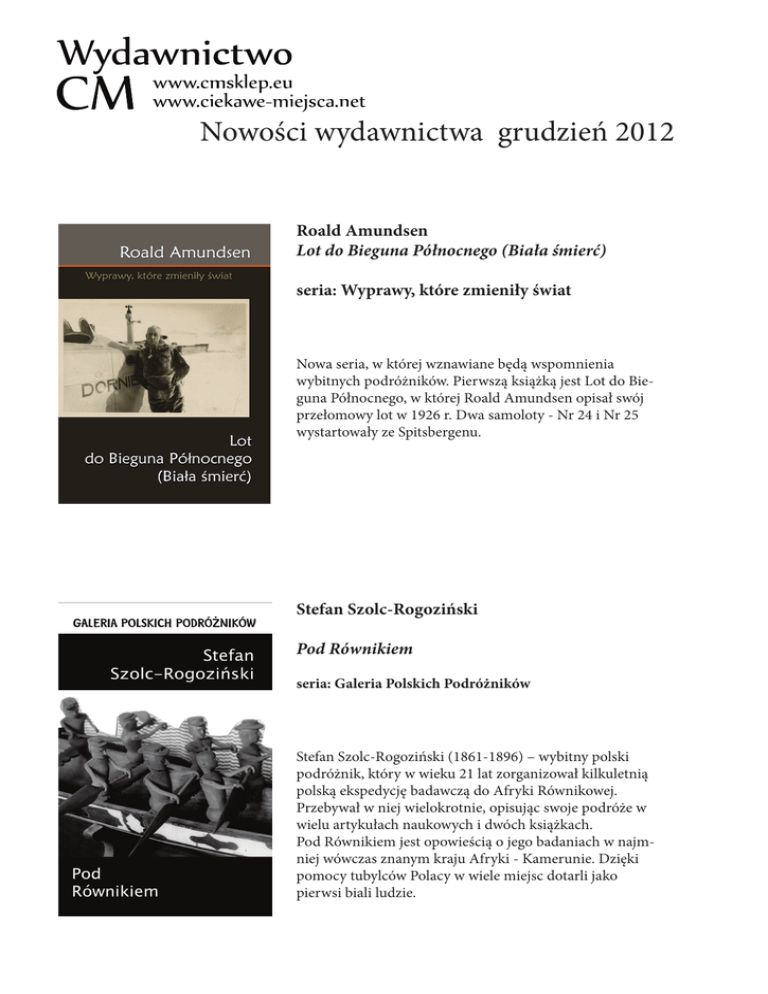 Nowości wydawnictwa grudzień 2012 Roald Amundsen Lot do Bieguna Północnego (Biała śmierć) seria: Wyprawy, które zmieniły świat Nowa seria, w której wznawiane będą wspomnienia wybitnych podróżników. Pierwszą książką jest Lot do Bieguna Północnego, w której Roald Amundsen opisał swój przełomowy lot w 1926 r. Dwa samoloty - Nr 24 i Nr 25 wystartowały ze Spitsbergenu. Stefan Szolc-Rogoziński Pod Równikiem seria: Galeria Polskich Podróżników Stefan Szolc-Rogoziński (1861-1896) – wybitny polski podróżnik, który w wieku 21 lat zorganizował kilkuletnią polską ekspedycję badawczą do Afryki Równikowej. Przebywał w niej wielokrotnie, opisując swoje podróże w wielu artykułach naukowych i dwóch książkach. Pod Równikiem jest opowieścią o jego badaniach w najmniej wówczas znanym kraju Afryki - Kamerunie. Dzięki pomocy tubylców Polacy w wiele miejsc dotarli jako pierwsi biali ludzie. Wiktor Czajewski Ilustrowany przewodnik po Wilanowie, Morysinie, Czerniakowie, Natolinie i Gucinie Przewodnik retro Reprint bardzo dokładnego przewodnika po Wilanowie z 1893 r. Dokładny opis pałac ze wszystkimi salami i tysiącem obrazów ze słynnej galerii. Przewodnik zawiera ponad 30 grafik przedstawiających wnętrza pałacu, zbiory oraz niektórych historycznych właścicieli. W stałej ofercie dotychczasowe publikacje wydawnictwa: Przewodniki: 1. J. Jagiełło, S. Kulczyk, M. Mazur, Kajakiem w okolicach Warszawy, 2010 Pierwszy i jedyny jak dotychczas przewodnik kajakowy po Mazowszu. Ponad 17 rzek i 1600 km szlaków. 2. J. Jagiełło, E. Perlińska, T. Szwagrzak, Zapomniane miejsca Łodzi i okolic, 2011 Druga odsłona cyklu Zapomniane Miejsca. Ponad 130 wartych zobaczenia miejsc w Łodzi i okolicach. 3. J. Jagiełło, Zapomniane miejsca Dolnego Śląska. Sudety Zachodnie, 2012 Trzecia część słynnego cyklu przewodników po „miejscach, których się nie zwiedza”. 4. Ilustrowany przewodnik po Warszawie (z grafikami Andriollego) - przewodnik retro, 2012 Wznowienie najlepszego XIX-wiecznego przewodnika po Warszawie, zawierającego opis aż 8 dzielnic. Książki podróżnicze: 1. M. Isaakowa, Polka w puszczach Parany, 2011 Pierwsza polska książka podróżnicza napisana przez kobietę (1936 r.) 2. S. Szolc-Rogoziński, Żegluga wzdłuż zachodnich wybrzeży Afryki, 2012 Opis jednej z najsłynniejszych polskich wypraw badawczych na Czarny Ląd Powieści kryminalne: 1. A. Błażejowski, Czerwony Błazen, 2012 Najstarszy polski kryminał. Jeszcze przed wojną wydany 3 razy i ekranizowany, po 1945 r. zapomniany. 2. S. Wotowski, Człowiek, który zapomniał swego nazwiska, 2012 Polska przedwojenna „Tożsamość Bourne’a”. Książki naukowe programu SCIENTIA 1. Między formą a ideologią. Architektura XX w. w Polsce, 2012 Zbiór tekstów na temat architektury XX w. w Polsce – dawniejsze zagadnienia i współczesne dylematy architektoniczne. W przygotowaniu: Przewodniki: 1. Zapomniane miejsca Mazowsza 2 edycja wiosna 2013 Druga edycja cieszącego się zainteresowaniem czytelników przewodnika. 2. Przewodnik po Płocku – reprint z 1924 r. Przewodniki retro 3. Przewodnik kajakowy po Mazowszu Południowym 4. Bzura i jej dorzecza – publikacja popularnonaukowa 5. 2x Warszawa, kompilacja przewodnika z 1893 r. z obecnym – z 2013 r. Powieści kryminalne: 1. H. Nagiel, Tajemnice Nalewek, cz. 1 i cz. 2 2012/13 Unikalna powieść sensacyjno-kryminalna, napisana jeszcze w... 1889 r. (z czasów Conan-Doyle’a). Akcja rozgrywa się na Nalewkach w Warszawie, w środowisku żydowskich bankierów i kupców. 2. M. Romański, Człowiek z Tytanica, 2013 3. M. Romański, Ostatni występ Turwida, 2013 Publikacje zagranicznych wydawnictw: Czarnogóra - mapy (bardzo trudno dostępne): 1. Bjelasica & Komovi Mapa Czarnogóra 1:60 000 2. Durmitor i kanion Tary mapa Czarnogóra 1:25 000 3. Durmitor mapa Czarnogóra 1:22 000 4. Lovcen mapa Czarnogóra 1:25 000 Przewodniki górskie (jęz angielski): 1. R. Abraham, The Mountains of Montenegro, Cicerone 2. R. Abraham, Walking in Croatia, Cicerone 3. S. Ashton Ridges of Snowdonia, Cicerone 4. J. Carey, R. Clark, The Julian Alps of Slovenia, Cicerone 5. J. Baxter, Scandinavian Mountains and Peaks Over 2000 Metres in the Hurrungane 6. A. Dyer, Walks and Scrambles in Norway 7. 100 Greatest Walks in Britain więcej informacji o książkach: www.cmsklep.eu