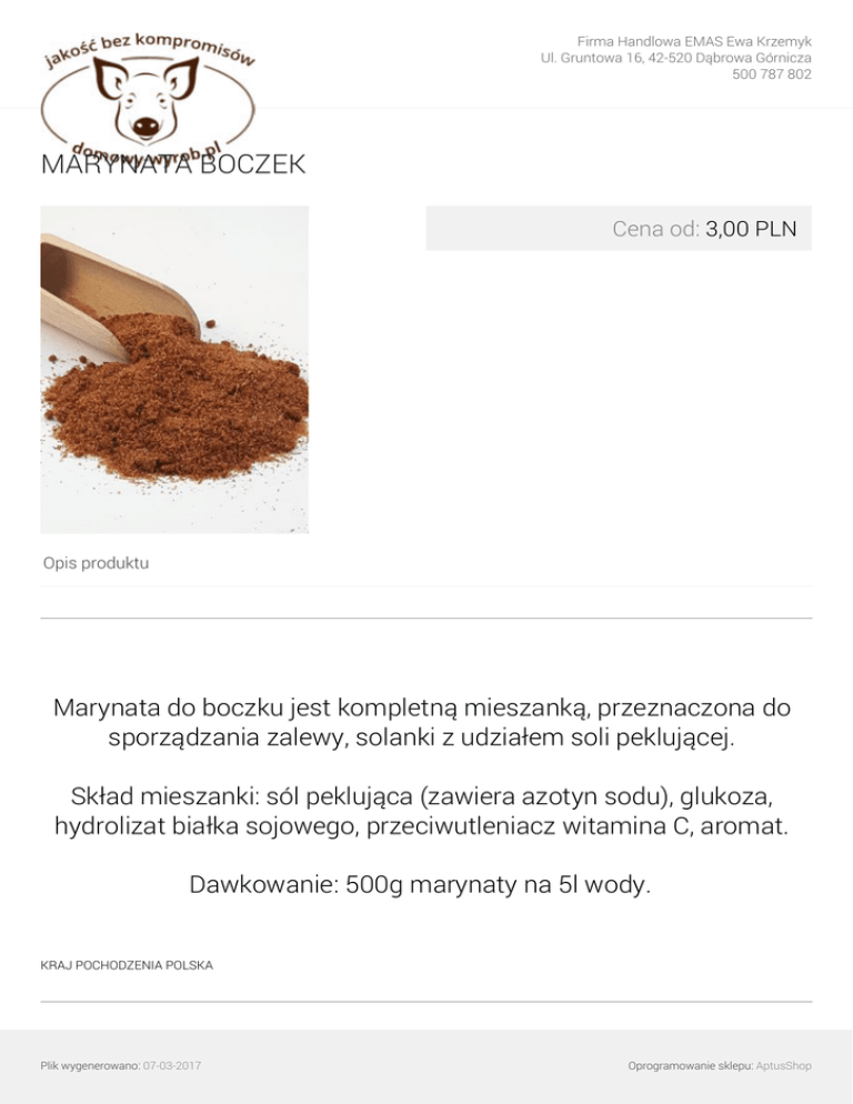 Firma Handlowa EMAS Ewa Krzemyk Ul. Gruntowa 16, 42-520 Dąbrowa Górnicza 500 787 802 MARYNATA BOCZEK Cena od: 3,00 PLN Opis produktu Marynata do boczku jest kompletną mieszanką, przeznaczona do sporządzania zalewy, solanki z udziałem soli peklującej. Skład mieszanki: sól peklująca (zawiera azotyn sodu), glukoza, hydrolizat białka sojowego, przeciwutleniacz witamina C, aromat. Dawkowanie: 500g marynaty na 5l wody. KRAJ POCHODZENIA POLSKA Plik wygenerowano: 07-03-2017 Oprogramowanie sklepu: AptusShop Firma Handlowa EMAS Ewa Krzemyk Ul. Gruntowa 16, 42-520 Dąbrowa Górnicza 500 787 802 Warianty produktu 250g 3,00 PLN CENA 12,00 PLN/1KG 500g 5,00 PLN CENA 10,00 PLN/1KG Plik wygenerowano: 07-03-2017 Powered by TCPDF (www.tcpdf.org) Oprogramowanie sklepu: AptusShop