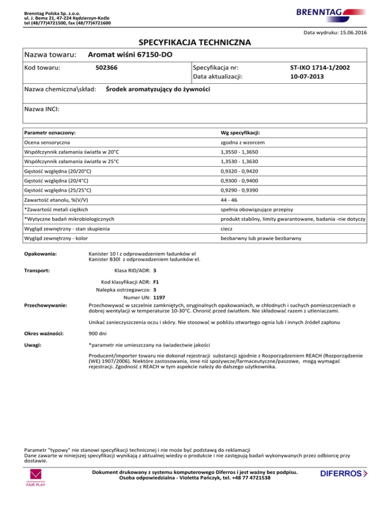 Brenntag Polska Sp. z.o.o. ul. J. Bema 21, 47-224 Kędzierzyn-Koźle tel (48/77)4721500, fax (48/77)4721600 Data wydruku: 15.06.2016 SPECYFIKACJA TECHNICZNA Nazwa towaru: Aromat wiśni 67150-DO Kod towaru: 502366 Nazwa chemiczna\skład: Specyfikacja nr: Data aktualizacji: ST-IXO 1714-1/2002 10-07-2013 Środek aromatyzujący do żywności Nazwa INCI: Parametr oznaczony: Wg specyfikacji: Ocena sensoryczna zgodna z wzorcem Współczynnik załamania światła w 20°C 1,3550 - 1,3650 Współczynnik załamania światła w 25°C 1,3530 - 1,3630 Gęstość względna (20/20°C) 0,9320 - 0,9420 Gęstość względna (20/4°C) 0,9300 - 0,9400 Gęstość względna (25/25°C) 0,9290 - 0,9390 Zawartość etanolu, %(V/V) 44 - 46 *Zawartość metali ciężkich spełnia obowiązujące przepisy *Wytyczne badań mikrobiologicznych produkt stabilny, limity gwarantowane, badania -nie dotyczy Wygląd zewnętrzny - stan skupienia ciecz Wygląd zewnętrzny - kolor bezbarwny lub prawie bezbarwny Opakowania: Kanister 10 l z odprowadzeniem ładunków el Kanister B30l z odprowadzeniem ładunków el. Transport: Przechowywanie: Klasa RID/ADR: 3 Kod klasyfikacji ADR: F1 Nalepka ostrzegawcza: 3 Numer UN: 1197 Przechowywać w szczelnie zamkniętych, oryginalnych opakowaniach, w chłodnych i suchych pomieszczeniach o dobrej wentylacji w temperaturze 10-30°C. Chronić przed światłem. Nie składować razem z utleniaczami. Unikać zanieczyszczenia oczu i skóry. Nie stosować w pobliżu otwartego ognia lub i innych źródeł zapłonu Okres ważności: 900 dni Uwagi: *parametr nie umieszczany na świadectwie jakości Producent/importer towaru nie dokonał rejestracji substancji zgodnie z Rozporządzeniem REACH (Rozporządzenie (WE) 1907/2006). Niektóre zastosowania, inne niż spożywcze/farmaceutyczne/paszowe, mogą wymagać rejestracji. Zgodność z REACH w tym aspekcie należy do dalszego użytkownika. Parametr "typowy" nie stanowi specyfikacji technicznej i nie może być podstawą do reklamacji Dane zawarte w niniejszej specyfikacji wynikają z aktualnej wiedzy o produkcie i nie zastępują badań wykonywanych przez odbiorcę przy dostawie. Dokument drukowany z systemu komputerowego Diferros i jest ważny bez podpisu. Osoba odpowiedzialna - Violetta Pańczyk, tel. +48 77 4721538