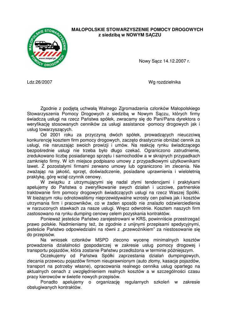 MAŁOPOLSKIE STOWARZYSZENIE POMOCY DROGOWYCH z siedzibą w NOWYM SĄCZU Nowy Sącz 14.12.2007 r. Ldz.26/2007 Wg rozdzielnika Zgodnie z podjętą uchwałą Walnego Zgromadzenia członków Małopolskiego Stowarzyszenia Pomocy Drogowych z siedzibą w Nowym Sączu, których firmy świadczą usługi na rzecz Państwa spółek, zwracamy się do Pani/Pana dyrektora o weryfikację stosowanych cenników za usługi assistance -pomocy drogowych jak i usług towarzyszących. Od 2001 roku za przyczyną dwóch spółek, prowadzących nieuczciwą konkurencję kosztem firm pomocy drogowych, zaczęto drastycznie obniżać cennik za usługi, nie naruszając swoich prowizji i umów. Na reakcję rynku świadczącego bezpośrednie usługi nie trzeba było długo czekać. Ograniczono zatrudnienie, zredukowano liczbę posiadanego sprzętu i samochodów a w skrajnych przypadkach zamknięto firmy. W ich miejsce podpisano umowy z przypadkowymi użytkownikami lawet. Z pozostałymi firmami zerwano umowy lub ograniczono im zlecenia. Nie zważając na jakość, sprzęt, doświadczenie, posiadane uprawnienia i wieloletnią praktykę, górę wziął czynnik cenowy. W związku z utrzymującymi się nadal złymi tendencjami i praktykami apelujemy do Państwa o zweryfikowanie swych działań i uczciwe, partnerskie traktowanie firm pomocy drogowych świadczących usługi na rzecz Waszej Spółki. W bieżącym roku odnotowaliśmy nieprzewidywalne wzrosty cen paliwa jak i kosztów utrzymania firm i pracowników, co w żaden sposób nie znalazło odzwierciedlenia w narzuconych stawkach za nasze usługi. Wręcz odwrotnie. Kosztem naszych firm zastosowano na rynku dumping cenowy celem pozyskania kontraktów. Ponieważ jesteście Państwo zarejestrowani w KRS, powinniście przestrzegać prawo polskie. Nadmieniamy też, że zgodnie z unijnymi przepisami spedycyjnymi, jesteście Państwo odpowiedzialni na równi z „przewoźnikiem” za niestosowanie się do przepisów. Na wniosek członków MSPD zlecono wycenę minimalnych kosztów prowadzenia działalności gospodarczej w zakresie usług pomocy drogowej i transportu pojazdów, która zostanie Państwu przedłożona w terminie późniejszym. Oczekujemy od Państwa Spółki zaprzestania działań dumpingowych, zlecania przewozu pojazdów firmom nieuprawnionym (auto złomy, kasacje pojazdów, transport na potrzeby własne), opracowania realnego cennika usług opartego na aktualnych cenach z uwzględnieniem realnych kosztów a w szczególności czasu pracy kierowców w świetle nowych przepisów. Ponadto apelujemy o organizację regularnych szkoleń w zakresie obsługiwanych kontraktów. Rejon województwa małopolskiego oprócz najwyższych cen paliw w Polsce jest szczególny pod względem ukształtowania terenu, śnieżnych i mroźnych zim, upalnych miesięcy letnich a co za tym idzie natłoku ruchu turystycznego przez większość miesięcy w roku. Odzwierciedlenie tych warunków uwzględnione jest w cennikach Starostów i Komendy Małopolskiej Policji. Apelujemy do Państwa o uwzględnienie podniesionych tematów w świetle deklaracji niektórych firm, na spotkaniu w dniu 28 listopada br. w Nowym Sączu, o ograniczeniu świadczenia usług ze względu na koszty i braki na rynku pracy osób odpowiednich do zatrudnienia na stanowisku kierowca - mechanik pomocy drogowej. Mamy nadzieję, że zdecydowane działania w tym zakresie przyczynią się do poprawienia wizerunku Państwa Spółki jak i osób ją reprezentujących na rynku polskim. Oczekujemy na jednoznaczne pisemne stanowisko w poruszonych sprawach. Otrzymują: 1. PZM „AUTOTOUR” 2. INTERPARTNER 3. STARTER 4. CORIS 5. MONDIAL ASSISTANCE 6. POL-ASSISTANCE 7. EUROP ASSISTANCE 8. a/a Z poważaniem Za zarząd MSPD Wacław Serafin ----------------------------------------------------------------------------------------------------------------Zarejestrowane w KRS pod nr 0000261727 przez Sąd Rejonowy dla Kraków-Śródmieścia w Krakowie XII Wydział Gospodarczy KRS