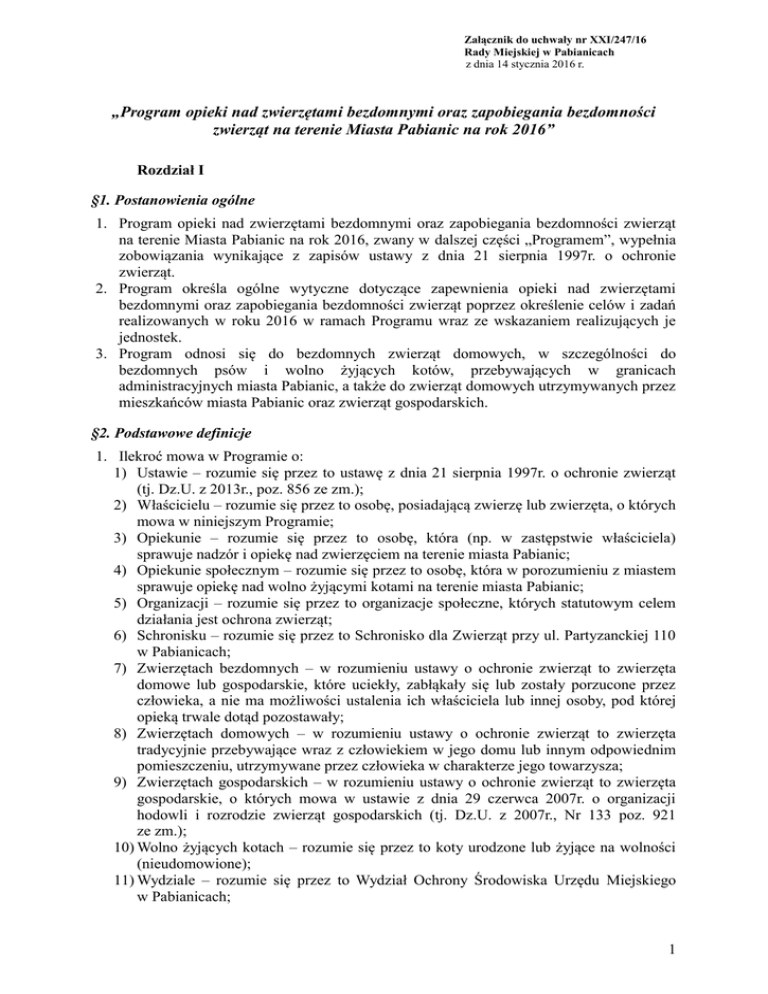 Załącznik do uchwały nr XXI/247/16 Rady Miejskiej w Pabianicach z dnia 14 stycznia 2016 r. „Program opieki nad zwierzętami bezdomnymi oraz zapobiegania bezdomności zwierząt na terenie Miasta Pabianic na rok 2016” Rozdział I §1. Postanowienia ogólne 1. Program opieki nad zwierzętami bezdomnymi oraz zapobiegania bezdomności zwierząt na terenie Miasta Pabianic na rok 2016, zwany w dalszej części „Programem”, wypełnia zobowiązania wynikające z zapisów ustawy z dnia 21 sierpnia 1997r. o ochronie zwierząt. 2. Program określa ogólne wytyczne dotyczące zapewnienia opieki nad zwierzętami bezdomnymi oraz zapobiegania bezdomności zwierząt poprzez określenie celów i zadań realizowanych w roku 2016 w ramach Programu wraz ze wskazaniem realizujących je jednostek. 3. Program odnosi się do bezdomnych zwierząt domowych, w szczególności do bezdomnych psów i wolno żyjących kotów, przebywających w granicach administracyjnych miasta Pabianic, a także do zwierząt domowych utrzymywanych przez mieszkańców miasta Pabianic oraz zwierząt gospodarskich. §2. Podstawowe definicje 1. Ilekroć mowa w Programie o: 1) Ustawie – rozumie się przez to ustawę z dnia 21 sierpnia 1997r. o ochronie zwierząt (tj. Dz.U. z 2013r., poz. 856 ze zm.); 2) Właścicielu – rozumie się przez to osobę, posiadającą zwierzę lub zwierzęta, o których mowa w niniejszym Programie; 3) Opiekunie – rozumie się przez to osobę, która (np. w zastępstwie właściciela) sprawuje nadzór i opiekę nad zwierzęciem na terenie miasta Pabianic; 4) Opiekunie społecznym – rozumie się przez to osobę, która w porozumieniu z miastem sprawuje opiekę nad wolno żyjącymi kotami na terenie miasta Pabianic; 5) Organizacji – rozumie się przez to organizacje społeczne, których statutowym celem działania jest ochrona zwierząt; 6) Schronisku – rozumie się przez to Schronisko dla Zwierząt przy ul. Partyzanckiej 110 w Pabianicach; 7) Zwierzętach bezdomnych – w rozumieniu ustawy o ochronie zwierząt to zwierzęta domowe lub gospodarskie, które uciekły, zabłąkały się lub zostały porzucone przez człowieka, a nie ma możliwości ustalenia ich właściciela lub innej osoby, pod której opieką trwale dotąd pozostawały; 8) Zwierzętach domowych – w rozumieniu ustawy o ochronie zwierząt to zwierzęta tradycyjnie przebywające wraz z człowiekiem w jego domu lub innym odpowiednim pomieszczeniu, utrzymywane przez człowieka w charakterze jego towarzysza; 9) Zwierzętach gospodarskich – w rozumieniu ustawy o ochronie zwierząt to zwierzęta gospodarskie, o których mowa w ustawie z dnia 29 czerwca 2007r. o organizacji hodowli i rozrodzie zwierząt gospodarskich (tj. Dz.U. z 2007r., Nr 133 poz. 921 ze zm.); 10) Wolno żyjących kotach – rozumie się przez to koty urodzone lub żyjące na wolności (nieudomowione); 11) Wydziale – rozumie się przez to Wydział Ochrony Środowiska Urzędu Miejskiego w Pabianicach; 1 12) Lecznicy – rozumie się przez to Zakład leczniczy dla zwierząt o którym mowa w ustawie z dnia 18 grudnia 2003r. o zakładach leczniczych dla zwierząt (tj. Dz.U. z 2004r., Nr 11 poz. 95 ze zm.), z którym miasto zawarło umowę w sprawie wspólnej realizacji niniejszego Programu; 13) Znakowanie – rozumie się przez to trwałe znakowanie zwierząt za pomocą elektronicznego mikroprocesora („czipa”); 14) Przedsiębiorcy – rozumie się przez to osobę zajmującą się odłowem zwierząt bezdomnych, posiadającą zezwolenie Prezydenta Miasta Pabianic na prowadzenie działalności w zakresie ochrony przed bezdomnymi zwierzętami na terenie Gminy Miejskiej Pabianice oraz podpisaną z miastem stosowną umowę. §3. Cele Programu 1. Zapewnienie opieki bezdomnym zwierzętom z terenu miasta. 2. Zapobieganie bezdomności zwierząt i zmniejszanie populacji zwierząt bezdomnych i wolno żyjących. 3. Zwiększenie liczby przeprowadzanych zabiegów sterylizacji/kastracji u psów oraz ich znakowania, poprzez wprowadzenie mechanizmów finansowych polegających na zwolnieniu z opłaty od posiadania psów, które podjęte zostały uchwałą Nr XXXV/428/12 Rady Miejskiej w Pabianicach z dnia 3 grudnia 2012r. w sprawie opłaty od posiadania psów. 4. Zapewnienie mieszkańcom miasta ochrony przed bezdomnymi i wolno żyjącymi zwierzętami. 5. Egzekwowanie przestrzegania obowiązków i przepisów prawa przez właścicieli zwierząt min. wynikających z uchwały Nr VI/45/15 Rady Miejskiej w Pabianicach z dnia 29 stycznia 2015r. w sprawie wprowadzenia Regulaminu utrzymania czystości i porządku na terenie Miasta Pabianic. 6. Edukacja mieszkańców miasta w zakresie humanitarnego traktowania zwierząt, odpowiedzialnej i właściwej opieki nad zwierzętami, konieczności sterylizacji albo kastracji psów i kotów, adopcji zwierząt domowych, zakazu handlu zwierzętami domowymi, rejestracji psów w Miejskim Rejestrze Psów. §4. Zadania prowadzone w ramach Programu 1. Zapewnienie bezdomnym psom miejsca w schronisku. 2. Opieka nad wolno żyjącymi kotami w tym ich dokarmianie. 3. Zmniejszenie populacji zwierząt bezdomnych i wolno żyjących (psów i kotów) oraz ograniczenie rozmnażania psów i kotów poza miejscami ich chowu lub hodowli poprzez sterylizację/kastrację. 4. Stałe odławianie zwierząt bezdomnych, zagubionych, wałęsających się, pozostających bez opieki właściciela lub opiekuna. 5. Poszukiwanie właścicieli dla bezdomnych zwierząt min. poprzez prowadzenie strony internetowej www.um.pabianice.pl/contents/200 prezentującej zwierzęta przeznaczone do adopcji. 6. Usypianie ślepych miotów – jedynie w uzasadnionych przypadkach. 7. Zapewnienie całodobowej opieki weterynaryjnej w przypadkach zdarzeń drogowych z udziałem zwierząt. 8. Zapewnienie miejsca w gospodarstwie rolnym dla zwierząt gospodarskich, które ucierpiały, zabłąkały się lub zostały porzucone przez człowieka. 9. Znakowanie psów poprzez czipowanie. 2 Rozdział II - Postanow