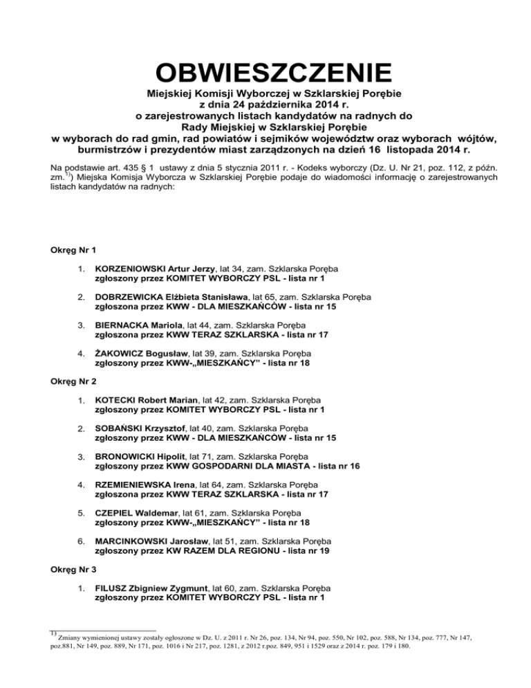 OBWIESZCZENIE Miejskiej Komisji Wyborczej w Szklarskiej Porębie z dnia 24 października 2014 r. o zarejestrowanych listach kandydatów na radnych do Rady Miejskiej w Szklarskiej Porębie w wyborach do rad gmin, rad powiatów i sejmików województw oraz wyborach wójtów, burmistrzów i prezydentów miast zarządzonych na dzień 16 listopada 2014 r. Na podstawie art. 435 § 1 ustawy z dnia 5 stycznia 2011 r. - Kodeks wyborczy (Dz. U. Nr 21, poz. 112, z późn. zm.1)) Miejska Komisja Wyborcza w Szklarskiej Porębie podaje do wiadomości informację o zarejestrowanych listach kandydatów na radnych: Okręg Nr 1 1. KORZENIOWSKI Artur Jerzy, lat 34, zam. Szklarska Poręba zgłoszony przez KOMITET WYBORCZY PSL - lista nr 1 2. DOBRZEWICKA Elżbieta Stanisława, lat 65, zam. Szklarska Poręba zgłoszona przez KWW - DLA MIESZKAŃCÓW - lista nr 15 3. BIERNACKA Mariola, lat 44, zam. Szklarska Poręba zgłoszona przez KWW TERAZ SZKLARSKA - lista nr 17 4. ŻAKOWICZ Bogusław, lat 39, zam. Szklarska Poręba zgłoszony przez KWW-„MIESZKAŃCY” - lista nr 18 Okręg Nr 2 1. KOTECKI Robert Marian, lat 42, zam. Szklarska Poręba zgłoszony przez KOMITET WYBORCZY PSL - lista nr 1 2. SOBAŃSKI Krzysztof, lat 40, zam. Szklarska Poręba zgłoszony przez KWW - DLA MIESZKAŃCÓW - lista nr 15 3. BRONOWICKI Hipolit, lat 71, zam. Szklarska Poręba zgłoszony przez KWW GOSPODARNI DLA MIASTA - lista nr 16 4. RZEMIENIEWSKA Irena, lat 64, zam. Szklarska Poręba zgłoszona przez KWW TERAZ SZKLARSKA - lista nr 17 5. CZEPIEL Waldemar, lat 61, zam. Szklarska Poręba zgłoszony przez KWW-„MIESZKAŃCY” - lista nr 18 6. MARCINKOWSKI Jarosław, lat 51, zam. Szklarska Poręba zgłoszony przez KW RAZEM DLA REGIONU - lista nr 19 Okręg Nr 3 1. 1) FILUSZ Zbigniew Zygmunt, lat 60, zam. Szklarska Poręba zgłoszony przez KOMITET WYBORCZY PSL - lista nr 1 Zmiany wymienionej ustawy zostały ogłoszone w Dz. U. z 2011 r. Nr 26, poz. 134, Nr 94, poz. 550, Nr 102, poz. 588, Nr 134, poz. 777, Nr 147, poz.881, Nr 149, poz. 889, Nr 171, poz. 1016 i Nr 217, poz. 1281, z 2012 r.poz. 849, 951 i 1529 oraz z 2014 r. poz. 179 i 180. 2. PŁOSKONKA Waldemar, lat 43, zam. Szklarska Poręba zgłoszony przez KWW - DLA MIESZKAŃCÓW - lista nr 15 3. PAWŁOWSKA Iwona Alicja, lat 44, zam. Szklarska Poręba zgłoszona przez KWW GOSPODARNI DLA MIASTA - lista nr 16 4. WIATER Przemysław Piotr, lat 55, zam. Szklarska Poręba zgłoszony przez KWW TERAZ SZKLARSKA - lista nr 17 5. ŻAK Piotr Krzysztof, lat 41, zam. Szklarska Poręba zgłoszony przez KWW-„MIESZKAŃCY” - lista nr 18 Okręg Nr 4 1. FEDOROWICZ Jan Michał, lat 28, zam. Szklarska Poręba zgłoszony przez KWW - DLA MIESZKAŃCÓW - lista nr 15 2. PAWLUK Grzegorz Robert, lat 40, zam. Szklarska Poręba zgłoszony przez KWW GOSPODARNI DLA MIASTA - lista nr 16 3. HOCHÓŁ Mirosław Andrzej, lat 50, zam. Szklarska Poręba zgłoszony przez KWW TERAZ SZKLARSKA - lista nr 17 4. MOTACZYŃSKI Miłosz Jan, lat 55, zam. Szklarska Poręba zgłoszony przez KW RAZEM DLA REGIONU - lista nr 19 Okręg Nr 5 1. KUSZTAL Jan Zbigniew, lat 65, zam. Szklarska Poręba zgłoszony przez KOMITET WYBORCZY PSL - lista nr 1 2. BOGACZYK Zbigniew Zygmunt, lat 65, zam. Szklarska Poręba zgłoszony przez KWW - DLA MIESZKAŃCÓW - lista nr 15 3. SAPIELA Szymon Daniel, lat 28, zam. Szklarska Poręba zgłoszony przez KWW GOSPODARNI DLA MIASTA - lista nr 16 4. POPŁOŃSKI Paweł Krzysztof, lat 37, zam. Szklarska Poręba zgłoszony przez KWW TERAZ SZKLARSKA - lista nr 17 5. PRZYBYLSKI Radosław Jerzy, lat 36, zam. Szklarska Poręba zgłoszony przez KWW-„MIESZKAŃCY” - lista nr 18 Okręg Nr 6 1. ZAPIÓRKOWSKI Mariusz, lat 51, zam. Szklarska Poręba zgłoszony przez KOMITET WYBORCZY PSL - lista nr 1 2. KŁYŻ Lesław Janusz, lat 50, zam. Szklarska Poręba zgłoszony przez KWW - DLA MIESZKAŃCÓW - lista nr 15 3. LANGE Łukasz Julian, lat 27, zam. Szklarska Poręba zgłoszony przez KWW GOSPODARNI DLA MIASTA - lista nr 16 4. KUPIS Mirosław, lat 55, zam. Szklarska Poręba zgłoszony przez KWW TERAZ SZKLARSKA - lista nr 17 5. NAUMOWICZ Kamila Magdalena, lat 26, zam. Szklarska Poręba zgłoszona przez KWW-„MIESZKAŃCY” - lista nr 18 Okręg Nr 7 1. TOMCZYK Andrzej Marek, lat 56, zam. Szklarska Poręba zgłoszony przez KOMITET WYBORCZY PSL - lista nr 1 2. BARBAROWICZ Marcin, lat 39, zam. Szklarska Poręba zgłoszony przez KWW - DLA MIESZKAŃCÓW - lista nr 15 3. DZIERGWA Ewa, lat 45, zam. Szklarska Poręba zgłoszona przez KWW GOSPODARNI DLA MIASTA - lista nr 16 4. GINTER Bohdan Wojciech, lat 64, zam. Szklarska Poręba zgłoszony przez KWW TERAZ SZKLARSKA - lista nr 17 Okręg Nr 8 1. SZTUR Dariusz Damian, lat 32, zam. Szklarska Poręba zgłoszony przez KOMITET WYBORCZY PSL - lista nr 1 2. SOBCZAK Jolanta Danuta, lat 47, zam. Szklarska Poręba zgłoszona przez KWW - DLA MIESZKAŃCÓW - lista nr 15 3. JAHN Krzysztof, lat 44, zam. Szklarska Poręba zgłoszony przez KWW GOSPODARNI DLA MIASTA - lista nr 16 4. GRAB Michał Franciszek, lat 62, zam. Szklarska Poręba zgłoszony przez KWW TERAZ SZKLARSKA - lista nr 17 5. NAUMOWICZ Beata Helena, lat 48, zam. Szklarska Poręba zgłoszona przez KWW-„MIESZKAŃCY” - lista nr 18 Okręg Nr 9 1. SŁOMIAN Eugeniusz, lat 74, zam. Szklarska Poręba zgłoszony przez KOMITET WYBORCZY PSL - lista nr 1 2. FORNAL Zygmunt, lat 60, zam. Szklarska Poręba zgłoszony przez KWW - DLA MIESZKAŃCÓW - lista nr 15 3. MALEC Jarosław, lat 34, zam. Szklarska Poręba zgłoszony przez KWW GOSPODARNI DLA MIASTA - lista nr 16 4. HAMMER-ŚLAZYK Joanna, lat 64, zam. Szklarska Poręba zgłoszona przez KWW TERAZ SZKLARSKA - lista nr 17 5. KASPEROWICZ Kamil Dominik, lat 31, zam. Szklarska Poręba zgłoszony przez KWW-„MIESZKAŃCY” - lista nr 18 Okręg Nr 10 1. GŁODEK Ryszard, lat 60, zam. Szklarska Poręba zgłoszony przez KOMITET WYBORCZY PSL - lista nr 1 2. CYBULSKA-PYCZAK Sylwia, lat 36, zam. Szklarska Poręba zgłoszona przez KWW - DLA MIESZKAŃCÓW - lista nr 15 3. DAHRENDORF Dorota Maria, lat 47, zam. Sz