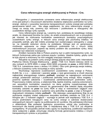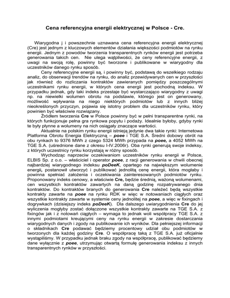 Cena referencyjna energii elektrycznej w Polsce - Cre. Wiarygodna j i powszechnie uznawana cena referencyjna energii elektrycznej (Cre) jest jednym z kluczowych elementów działania większości podmiotów na rynku energii. Jednym z powodów tworzenia transparentnych rynków energii jest potrzeba generowania takich cen. Nie ulega wątpliwości, że ceny referencyjne energii, z uwagi na swoją rolę, powinny być tworzone i publikowane w wiarygodny dla uczestników danego rynku sposób. Ceny referencyjne energii są, i powinny być, podstawą do wszelkiego rodzaju analiz, do obserwacji trendów na rynku, do analiz przewidywanych cen w przyszłości jak również do rozliczania kontraktów zawieranych pomiędzy poszczególnymi uczestnikami rynku energii, w których cena energii jest pochodną indeksu. W przypadku jednak, gdy taki indeks przestaje być wystarczająco wiarygodny z uwagi np. na niewielki wolumen obrotu na podstawie, którego jest on generowany, możliwość wpływania na niego niektórych podmiotów lub z innych bliżej nieokreślonych przyczyn, pojawia się istotny problem dla uczestników rynku, który powinien być właściwie rozwiązany. Źródłem tworzenia Cre w Polsce powinny być w pełni transparentne rynki, na których funkcjonuje pełna gra rynkowa popytu i podaży. Idealnie byłoby, gdyby rynki te były płynne a wolumeny na nich osiągały znaczące wartości. Aktualnie na polskim rynku energii istnieją jedynie dwa takie rynki: Internetowa Platforma Obrotu Energia Elektryczną – poee i TGE S.A. Średni dobowy obrót na obu rynkach to 9376 MWh z czego 5324 MWh przypada na poee, a 4052 MWh na TGE S.A. (uśrednione dane z okresu I-IV.2006r). Oba rynki generują swoje indeksy, z których uczestnicy rynku korzystają w różny sposób. Wychodząc naprzeciw oczekiwaniom uczestników rynku energii w Polsce, ELBIS Sp. z o.o. – właściciel i operator poee, z racji generowania w chwili obecnej najbardziej wiarygodnego indeksu poDeeK, opartego na największym wolumenie energii, postanowił utworzyć i publikować jednolitą cenę energii, która mogłaby i powinna spełniać założenia i oczekiwania zainteresowanych podmiotów rynku. Proponowany indeks cenowy, a właściwie Cre, będzie średnią, ważoną wolumenami, cen wszystkich kontraktów zawartych na daną godzinę rozpatrywanego dnia kontraktów. Do kontraktów branych do generowania Cre należeć będą wszystkie kontrakty zawarte na poee na rynku RDK w więc w notowaniach ciągłych oraz wszystkie kontrakty zawarte w systemie ceny jednolitej na poee, a więc w fixingach i dogrywkach (dzisiejszy indeks poDeeK). Dla dalszego uwiarygodnienia Cre do jej wyliczenia mogłyby zostać dołączone wszystkie kontrakty zawarte na TGE S.A. z fixingów jak i z notowań ciągłych – wymaga to jednak woli współpracy TGE S.A. z innymi podmiotami kreującymi ceny na rynku energii w zakresie dostarczania wiarygodnych danych i zgody na publikowanie ich wyników. Dla pełniejszej informacji o składnikach Cre podawać będziemy procentowy udział obu podmiotów w tworzonych dla każdej godziny Cre. O współpracę taką z TGE S.A. już oficjalnie wystąpiliśmy. W przypadku jednak braku zgody na współpracę, publikować będziemy dane wyłącznie z poee, utrzymując otwartą formułę generowania indeksu z innych transparentnych rynków w przyszłości.