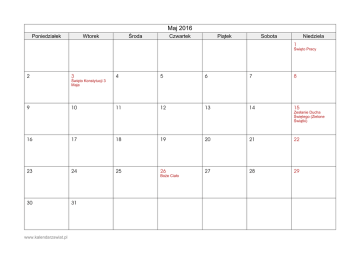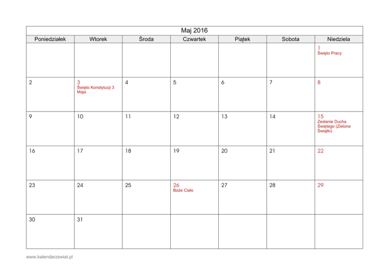 Maj 2016 Poniedziałek Wtorek Środa Czwartek Piątek Sobota Niedziela 1 Święto Pracy 2 3 4 5 6 7 8 11 12 13 14 15 Święto Konstytucji 3 Maja 9 10 Zesłanie Ducha Świętego (Zielone Świątki) 16 17 18 19 20 21 22 23 24 25 26 27 28 29 Boże Ciało 30 www.kalendarzswiat.pl 31