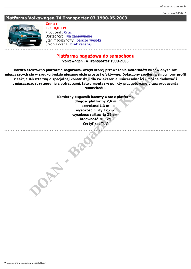 Informacje o produkcie Utworzono 07-03-2017 Platforma Volkswagen T4 Transporter 07.1990-05.2003 Cena : 1.330,00 zł Producent : Cruz Dostępność : Na zamówienie Stan magazynowy : bardzo wysoki Średnia ocena : brak recenzji Platforma bagażowa do samochodu Volkswagen T4 Transporter 1990-2003 ra kó w Bardzo efektowna platforma bagażowa, dzięki której przewożenie materiałów budowlanych nie mieszczących się w środku będzie niesamowicie proste i efektywne. Dołączony spoiler, wzmocniony profil z sekcją U-kształtną o specjalnej konstrukcji dla zwiększenia uniwersalności - można dodawać i umieszczeać rury zgodnie z potrzebami, łatwy montaż w punkty przygotowane przez producenta samochodu. D O AN -B ag aż n ik i K Komletny bagażnik bazowy wraz z platformą długość platformy 2,6 m szerokość 1,3 m wysokość burty 12 cm wysokość całkowita 22 cm ładowność 200 kg Certyfikat TUV Wygenerowano w programie www.oscGold.com