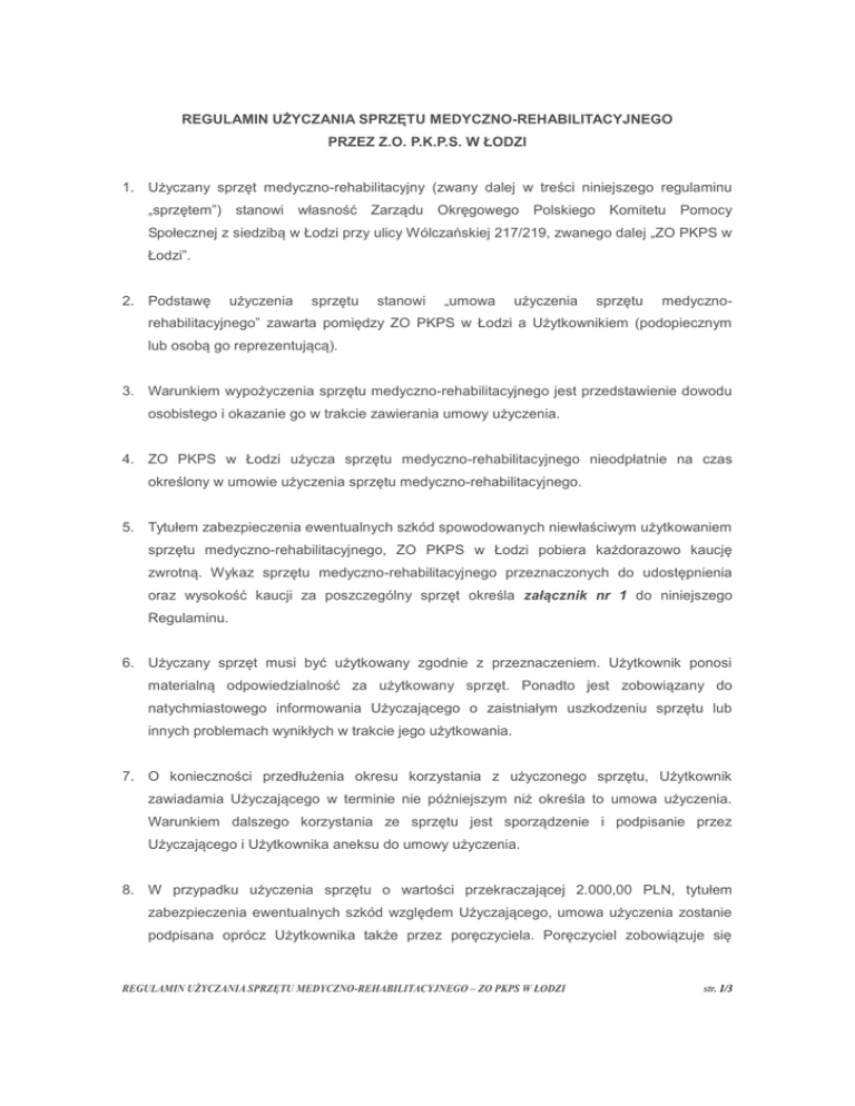 REGULAMIN UŻYCZANIA SPRZĘTU MEDYCZNO-REHABILITACYJNEGO PRZEZ Z.O. P.K.P.S. W ŁODZI 1. Użyczany sprzęt medyczno-rehabilitacyjny (zwany dalej w treści niniejszego regulaminu „sprzętem”) stanowi własność Zarządu Okręgowego Polskiego Komitetu Pomocy Społecznej z siedzibą w Łodzi przy ulicy Wólczańskiej 217/219, zwanego dalej „ZO PKPS w Łodzi”. 2. Podstawę użyczenia sprzętu stanowi „umowa użyczenia sprzętu medyczno- rehabilitacyjnego” zawarta pomiędzy ZO PKPS w Łodzi a Użytkownikiem (podopiecznym lub osobą go reprezentującą). 3. Warunkiem wypożyczenia sprzętu medyczno-rehabilitacyjnego jest przedstawienie dowodu osobistego i okazanie go w trakcie zawierania umowy użyczenia. 4. ZO PKPS w Łodzi użycza sprzętu medyczno-rehabilitacyjnego nieodpłatnie na czas określony w umowie użyczenia sprzętu medyczno-rehabilitacyjnego. 5. Tytułem zabezpieczenia ewentualnych szkód spowodowanych niewłaściwym użytkowaniem sprzętu medyczno-rehabilitacyjnego, ZO PKPS w Łodzi pobiera każdorazowo kaucję zwrotną. Wykaz sprzętu medyczno-rehabilitacyjnego przeznaczonych do udostępnienia oraz wysokość kaucji za poszczególny sprzęt określa załącznik nr 1 do niniejszego Regulaminu. 6. Użyczany sprzęt musi być użytkowany zgodnie z przeznaczeniem. Użytkownik ponosi materialną odpowiedzialność za użytkowany sprzęt. Ponadto jest zobowiązany do natychmiastowego informowania Użyczającego o zaistniałym uszkodzeniu sprzętu lub innych problemach wynikłych w trakcie jego użytkowania. 7. O konieczności przedłużenia okresu korzystania z użyczonego sprzętu, Użytkownik zawiadamia Użyczającego w terminie nie późniejszym niż określa to umowa użyczenia. Warunkiem dalszego korzystania ze sprzętu jest sporządzenie i podpisanie przez Użyczającego i Użytkownika aneksu do umowy użyczenia. 8. W przypadku użyczenia sprzętu o wartości przekraczającej 2.000,00 PLN, tytułem zabezpieczenia ewentualnych szkód względem Użyczającego, umowa użyczenia zostanie podpisana oprócz Użytkownika także przez poręczyciela. Poręczyciel zobowiązuje się REGULAMIN UŻYCZANIA SPRZĘTU MEDYCZNO-REHABILITACYJNEGO – ZO PKPS W ŁODZI str. 1/3 względem Użyczającego wykonać zobowiązanie wynikające z umowy użyczenia na wypadek, gdyby Użytkownik go nie spełnił. Poręczenie obejmuje zobowiązania Użytkownika, istniejące w chwili udzielenia poręczenia (zawarcia umowy użyczenia) oraz mogące powstać w przyszłości z tytułu niewykonania lub nienależytego wykonania umowy użyczenia. Jeżeli Użytkownik opóźni się ze spełnieniem świadczenia na rzecz Użyczającego, Użytkownik zawiadomi o tym niezwłocznie Poręczyciela. Poręczyciel jest odpowiedzialny za wykonanie umowy użyczenia jak Użytkownik. Poręczyciel zobowiązuje się do spełnienia zobowiązania ciążącego na Użytkowniku w terminie 14 dni po zawiadomieniu go przez Użyczającego o opóźnieniu lub zwłoce Użytkownika w wykonaniu umowy użyczenia. 9. W przypadku szkody poniesionej przez Użyczającego, za którą odpowiedzialność ponosi Użytkownik (np. uszkodzenie, zniszczenie, zagubienie sprzętu), Użytkownik zobowiązany jest do zwrotu kosztów równoważnych stracie finansowej wyrządzonej szkody. Wysokość straty określa Użyczający. Koszty te mogą być pokryte z kaucji. 10. Przed wydaniem Użytkownikowi sprzętu Użyczający zobowiązany jest do przekazaniu mu podstawowych informacji o montażu, demontażu i prawidłowej eksploatacji oraz transporcie sprzętu. Użytkownik w formie pisemnej potwierdza zapoznanie się z tymi informacjami. 11. Obsługę, montaż, demontaż oraz transport, odbiór i zwrot użyczanego sprzętu Użytkownik zapewnia sobie we własnym zakresie. 12. Zwrot sprzętu następuje nie później niż do trzech dni od daty wygaśnięcia umowy użyczenia. Brak zwrotu użyczonego sprzętu do 30 dni od daty wygaśnięcia umowy wypożyczenia spowoduje powstanie zobowiązania Użytkownika wobec Użyczającego w wysokości wartości wypożyczonego sprzętu. 13. Zwrot kaucji następuje po podpisaniu przez Użyczającego protokołu zdawczo-odbiorczego . 14. Użyczającemu przysługuje prawo sprawdzenia danych osobowych przedstawionych przez Użytkownika oraz kontroli sposobu użytkowania sprzętu. 15. W przypadku stwierdzenia wykorzystywania użytkowanego sprzętu niezgodnie z jego przeznaczeniem lub w przypadku jego zniszczenia, Użyczający ma prawo odstąpić od umowy w trybie natychmiastowym i obciążyć Użytkownika kosztami ewentualnej naprawy, zaś Użytkownik zobowiązany jest do niezwłocznego zwrotu sprzętu. REGULAMIN UŻYCZANIA SPRZĘTU MEDYCZNO-REHABILITACYJNEGO – ZO PKPS W ŁODZI str. 2/3 16. Nieprzestrzeganie przez Użytkownika niniejszego regulaminu stanowi podstawę do natychmiastowego rozwiązania umowy użyczenia i do odebrania użyczonego sprzętu. 17. Użyczający ma prawo gromadzić i przetwarzać dane osobowe Użytkowników, którzy wyrażają na to pisemną zgodę, celem prowadzenia ewidencji sprzętu medycznorehabilitacyjnego. 18. W sprawach nieuregulowanych w niniejszym regulaminie, wszelkie decyzje wiążące podejmuje Sekretarz ZO PKPS w Łodzi. 19. Regulamin wchodzi w życie z dniem 1 marca 2011 r. REGULAMIN UŻYCZANIA SPRZĘTU MEDYCZNO-REHABILITACYJNEGO – ZO PKPS W ŁODZI str. 3/3