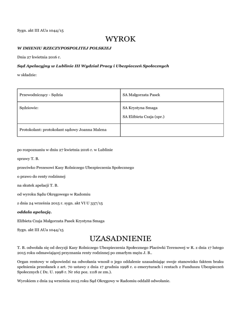 Sygn. akt III AUa 1044/15 WYROK W IMIENIU RZECZYPOSPOLITEJ POLSKIEJ Dnia 27 kwietnia 2016 r. Sąd Apelacyjny w Lublinie III Wydział Pracy i Ubezpieczeń Społecznych w składzie: Przewodniczący - Sędzia SA Małgorzata Pasek Sędziowie: SA Krystyna Smaga SA Elżbieta Czaja (spr.) Protokolant: protokolant sądowy Joanna Malena po rozpoznaniu w dniu 27 kwietnia 2016 r. w Lublinie sprawy T. B. przeciwko Prezesowi Kasy Rolniczego Ubezpieczenia Społecznego o prawo do renty rodzinnej na skutek apelacji T. B. od wyroku Sądu Okręgowego w Radomiu z dnia 24 września 2015 r. sygn. akt VI U 337/15 oddala apelację. Elżbieta Czaja Małgorzata Pasek Krystyna Smaga Sygn. akt III AUa 1044/15 UZASADNIENIE T. B. odwołała się od decyzji Kasy Rolniczego Ubezpieczenia Społecznego Placówki Terenowej w R. z dnia 17 lutego 2015 roku odmawiającej przyznania renty rodzinnej po zmarłym mężu J. B.. Organ rentowy w odpowiedzi na odwołania wnosił o jego oddalenie uzasadniając swoje stanowisko faktem braku spełnienia przesłanek z art. 70 ustawy z dnia 17 grudnia 1998 r. o emeryturach i rentach z Funduszu Ubezpieczeń Społecznych ( Dz. U. 1998 r. Nr 162 poz. 1118 ze zm.). Wyrokiem z dnia 24 września 2015 roku Sąd Okręgowy w Radomiu oddalił odwołanie. Podstawą wyroku były następujące ustalenia: Mąż wnioskodawczyni J. B. zmarł w dniu(...)w wieku 38 lat. Wnioskodawczyni decyzją z dnia 31 stycznia 2003 r. miała wraz z synem A. B. przyznane prawo do renty rodzinnej po zmarłym w dniu(...)mężu i ojcu J. B.. Wnioskodawczyni urodziła się w dniu (...) i w dniu śmierci męża miała 24 lata wychowywała syna A. B. ur. (...) Prawo do renty rodzinnej na siebie nabyła na podstawie art. 70 ust. 1 pkt 2 ustawy z dnia 17 grudnia 1998 r. o emeryturach i rentach z Funduszu Ubezpieczeń Społecznych (Dz. U. 1998 r. Nr 162 poz. 1118 ze zm.). Syn wnioskodawczyni nabył takie prawo w oparciu o art. 68 powołanej wyżej ustawy. Po zakończeniu nauki w szkole renta rodzinna na rzecz wnioskodawczyni została wstrzymana. Zgodnie bowiem z art. 70 ust. 1 pkt 2 ustawy o emeryturach i rentach z FUS wdowa ma prawo do renty rodzinnej, jeżeli wychowuje co najmniej jedno z dzieci, wnuków lub rodzeństwa uprawnione do renty rodzinnej po zmarłym mężu, które nie osiągnęło 16 lat, a jeżeli kształci się w szkole 18 lat życia, lub jeżeli sprawuje pieczę nad dzieckiem całkowicie niezdolnym do pracy oraz do samodzielnej egzystencji lub całkowicie niezdolnym do pracy, uprawnionym do renty rodzinnej. Renta rodzinna dla wnioskodawczyni nie przysługuje również w oparciu o art. 70 ust. 1 pkt 1 ustawy emerytalnej z uwagi na to, że w chwili śmierci męża nie osiągnęła wieku 50 lat. Wieku tego nie osiągnęła również w okresie 5 lat od jego śmierci, ani też sama ani jej syn A. nie są osobami niezdolnymi do pracy. Wnioskodawczyni nie osiągnęła również wieku 50 lat od zaprzestania wychowywania syna A.. Wiek 18 lat ukończył on bowiem z dniem (...) a uprawnień do renty rodzinnej pozbawiony został od dnia 1września 2006 r. decyzją z dnia 19 sierpnia 2006 r. Zaprzestanie wychowywania syna w rozumieniu art. 70 ust 1 pkt 2 ustawy emerytalnej nastąpiło z chwilą ukończenia 18 roku życia a nie z chwilą wstrzymania wypłaty renty rodzinnej dla niego. Prawa do renty rodzinnej dla dziecka wnioskodawczyni zabezpieczone są przez art. 68 ustawy emerytalnej nawet do 25 roku życia o ile kontynuuje naukę w szkole. Przesunięcie okresu wychowywania do 25 lat w sytuacji kontynuowania nauki pozostawałoby w sprzeczności z treścią art. 70 ust. 1 pkt 2 ustawy emerytalnej i czyniło górną granicę wychowywania płynną. W odniesieniu do realiów niniejszej sprawy wskazać należy iż syn wnioskodawczyni nie jest osobą niezdolną do pracy. Z akt ubezpieczeniowych KRUS wynika, że naukę podjął w Zespole Szkół (...) w W. /k. 4 akt KRUS/ a więc z uwagi na odległość ponad 80 kilometrów zamieszkiwał na stancji lub w internacie. Drugim miejscem nauki było Liceum Ogólnokształcące dla Dorosłych w C. a więc jeszcze dalej, bo w odległości ponad 170 km od miejsca zamieszkania. Także tam musiał korzystać z internatu bądź stancji. Nie zamieszkiwał więc z matką a zatem kontynuowała wychowania syna w wieku powyżej 18 lat w rozumieniu art. 70 ust. 1 pkt 2 i ust. 2 powołanej wyżej ustawy emerytalnej. Z tych przyczyn Sąd Okręgowy na mocy art. 477 14 § 2 kpc w związku z art. 65, 68 ust. 1 i 70 ust. 1 i 2 ustawy z dnia 17 grudnia 1998 r. o emeryturach i rentach z Funduszu Ubezpieczeń Społecznych (tekst jednolity - Dz. U. z 2004 r., Nr 39, poz. 353, z późn. zm.) oddalił odwołanie. Powyższy wyrok został zaskarżony apelacją w całości przez wnioskodawczynię. Apelacja nie zawiera skonkretyzowanych zarzutów, skarżąca podnosi, że przy wydawaniu wyroku Sąd oparł się o opinii przedstawiciela KRUS, opinie te były fałszywe i jednostronne, renta rodzinna została wstrzymana po zakończeniu nauki przez syna. Wnioskodawczyni powołuje się na trudną sytuację materialną (brak majątku i zdrowotną - przebyty nowotwór piersi i planowaną operację ). Skarżąca wnosiła o uchylenie wyroku Sądu Okręgowego. Sąd Apelacyjny zważył. Apelacja jest niezasadna. Ustalenia Sądu I instancji i wyprowadzone na ich podstawie wnioski Sąd Apelacyjny podziela i przyjmuje za własne. Sprawia to, że nie zachodzi potrzeba powtarzania szczegółowych ustaleń faktycznych oraz dokonanej w uzasadnieniu zaskarżonego wyroku interpretacji przepisów prawa mających zastosowanie w sprawie niniejszej. Zgodnie z art 70 ustawy z dnia 17 grudnia 1998 r. o emeryturach i rentach z Funduszu Ubezpieczeń Społecznych (Dz. U. 1998 r. Nr 162 poz. 1118 ze zm.). wdowa ma prawo do renty rodzinnej, jeżeli: 1) w chwili śmierci męża osiągnęła wiek 50 lat lub była niezdolna do pracy albo 2) wychowuje co najmniej jedno z dzieci, wnuków lub rodzeństwa uprawnione do renty rodzinnej po zmarłym męż