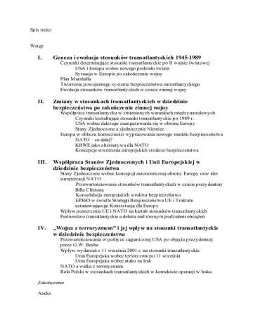 Spis treści Wstęp I. Geneza i ewolucja stosunków transatlantyckich 1945-1989 Czynniki determinujące stosunki transatlantyckie po II wojnie światowej USA i Europa wobec nowego podziału świata Sytuacja w Europie po zakończeniu wojny Plan M arshalla Tworzenie powojennego systemu bezpieczeństwa euroatlantyckiego Ewolucja stosunków transatlantyckich w czasie zimnej wojny II. Zmiany w stosunkach transatlantyckich w dziedzinie bezpieczeństwa po zakończeniu zimnej wojny Współpraca transatlantycka w zmienionych warunkach międzynarodowych Czynniki kształtujące stosunki transatlantyckie po 1989 r. USA wobec dalszego zaangaŜowania się w obronę Europy Stany Zjednoczone a zjednoczenie Niemiec Europa w obliczu konieczności wypracowania nowego modelu bezpieczeństwa NATO – co dalej? KBWE jako alternatywa dla NATO Koncepcje stworzenia europejskich struktur bezpieczeństwa III. Współpraca Stanów Zjednoczonych i Unii Europejskiej w dziedzinie bezpieczeństwa Stany Zjednoczone wobec koncepcji autonomicznej obrony Europy oraz idei europeizacji NATO Przewartościowania stosunków transatlantyckich w czasie prezydentury Billa Clintona Konsolidacja europejskich struktur bezpieczeństwa EPBiO w świetle Strategii Bezpieczeństwa UE i Traktatu ustanawiającego Konstytucję dla Europy Wpływ poszerzenia UE i NATO na kształt stosunków transatlantyckich Partnerstwo transatlantyckie a debata nad równym podziałem obciąŜeń IV. „Wojna z terroryzmem” i jej wpływ na stosunki transatlantyckie w dziedzinie bezpieczeństwa Przewartościowania w polityce zagranicznej USA po objęciu prezydentury przez G.W. Busha Wpływ wydarzeń z 11 września 2001 r. na stosunki transatlantyckie Unia Europejska wobec terroryzmu po 11 września Unia Europejska wobec ataku na Irak NATO a walka z terroryzmem Rola Polski w stosunkach transatlantyckich w kontekście operacji w Iraku Zakończenie Aneks Bibliografia I. Dokumenty II. Druki zwarte III. Artykuły naukowe IV. Prasa V. Strony internetowe
