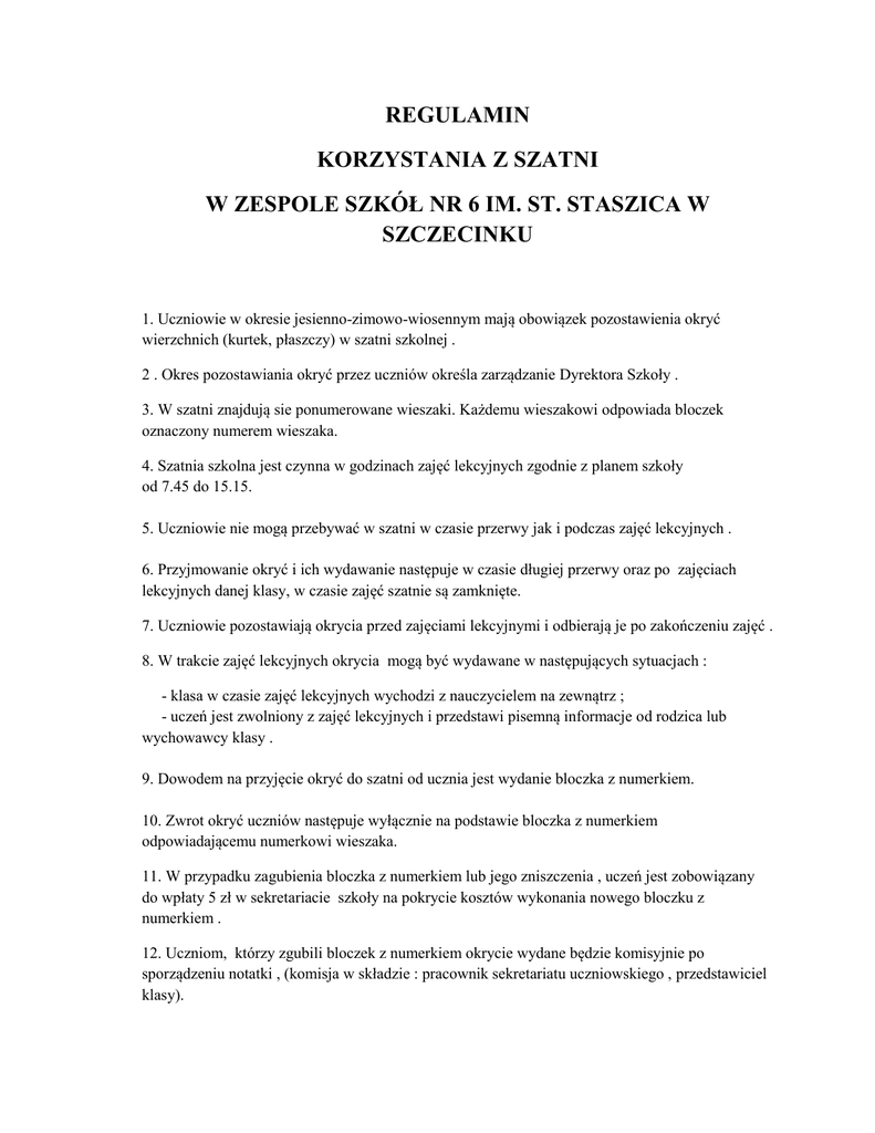 REGULAMIN KORZYSTANIA Z SZATNI W ZESPOLE SZKÓŁ NR 6 IM. ST. STASZICA W SZCZECINKU 1. Uczniowie w okresie jesienno-zimowo-wiosennym mają obowiązek pozostawienia okryć wierzchnich (kurtek, płaszczy) w szatni szkolnej . 2 . Okres pozostawiania okryć przez uczniów określa zarządzanie Dyrektora Szkoły . 3. W szatni znajdują sie ponumerowane wieszaki. Każdemu wieszakowi odpowiada bloczek oznaczony numerem wieszaka. 4. Szatnia szkolna jest czynna w godzinach zajęć lekcyjnych zgodnie z planem szkoły od 7.45 do 15.15. 5. Uczniowie nie mogą przebywać w szatni w czasie przerwy jak i podczas zajęć lekcyjnych . 6. Przyjmowanie okryć i ich wydawanie następuje w czasie długiej przerwy oraz po zajęciach lekcyjnych danej klasy, w czasie zajęć szatnie są zamknięte. 7. Uczniowie pozostawiają okrycia przed zajęciami lekcyjnymi i odbierają je po zakończeniu zajęć . 8. W trakcie zajęć lekcyjnych okrycia mogą być wydawane w następujących sytuacjach : - klasa w czasie zajęć lekcyjnych wychodzi z nauczycielem na zewnątrz ; - uczeń jest zwolniony z zajęć lekcyjnych i przedstawi pisemną informacje od rodzica lub wychowawcy klasy . 9. Dowodem na przyjęcie okryć do szatni od ucznia jest wydanie bloczka z numerkiem. 10. Zwrot okryć uczniów następuje wyłącznie na podstawie bloczka z numerkiem odpowiadającemu numerkowi wieszaka. 11. W przypadku zagubienia bloczka z numerkiem lub jego zniszczenia , uczeń jest zobowiązany do wpłaty 5 zł w sekretariacie szkoły na pokrycie kosztów wykonania nowego bloczku z numerkiem . 12. Uczniom, którzy zgubili bloczek z numerkiem okrycie wydane będzie komisyjnie po sporządzeniu notatki , (komisja w składzie : pracownik sekretariatu uczniowskiego , przedstawiciel klasy). 15. W szatni nie wolno pozostawiać wartościowych przedmiotów tj. dokumentów , portfeli, telefonów komórkowych, kluczy oraz drobnych rzeczy np. apaszek ,rękawiczek, czapek (uczeń przechowuje je w swojej teczce). 16. Wszelkie występujące nieprawidłowości zaistniałe w szatni uczeń zgłasza niezwłocznie pracownikowi.