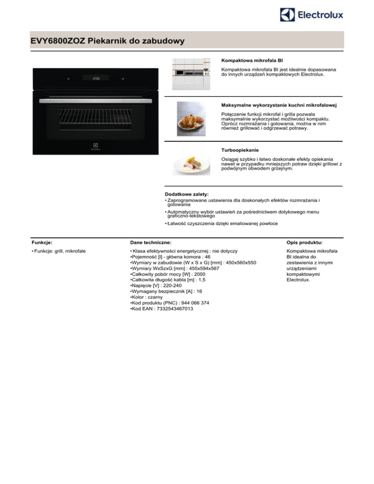 EVY6800ZOZ Piekarnik do zabudowy Kompaktowa mikrofala BI Kompaktowa mikrofala BI jest idealnie dopasowana do innych urządzeń kompaktowych Electrolux. Maksymalne wykorzystanie kuchni mikrofalowej Połączenie funkcji mikrofal i grilla pozwala maksymalnie wykorzystać możliwości kompaktu. Oprócz rozmrażania i gotowania, można w nim również grillować i odgrzewać potrawy. Turboopiekanie Osiągaj szybko i łatwo doskonałe efekty opiekania nawet w przypadku mniejszych potraw dzięki grillowi z podwójnym obwodem grzejnym. Dodatkowe zalety: • Zaprogramowane ustawienia dla doskonałych efektów rozmrażania i gotowania • Automatyczny wybór ustawień za pośrednictwem dotykowego menu graficzno-tekstowego • Łatwość czyszczenia dzięki emaliowanej powłoce Funkcje: Dane techniczne: Opis produktu: • Funkcje: grill, mikrofale • Klasa efektywności energetycznej : nie dotyczy •Pojemność [l] - główna komora : 46 •Wymiary w zabudowie (W x S x G) [mm] : 450x560x550 •Wymiary WxSzxG [mm] : 455x594x567 •Całkowity pobór mocy [W] : 2000 •Całkowita długość kabla [m] : 1,5 •Napięcie [V] : 220-240 •Wymagany bezpiecznik [A] : 16 •Kolor : czarny •Kod produktu (PNC) : 944 066 374 •Kod EAN : 7332543467013 Kompaktowa mikrofala BI idealna do zestawienia z innymi urządzeniami kompaktowymi Electrolux. EVY6800ZOZ Piekarnik do zabudowy