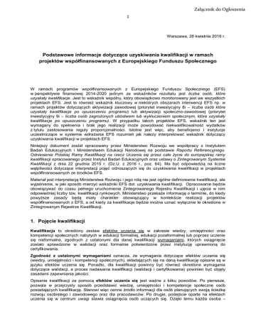 Załącznik do Ogłoszenia 1 Warszawa, 26 kwietnia 2016 r. Podstawowe informacje dotyczące uzyskiwania kwalifikacji w ramach projektów współfinansowanych z Europejskiego Funduszu Społecznego W ramach programów współfinansowanych z Europejskiego Funduszu Społecznego (EFS) w perspektywie finansowej 2014-2020 jednym ze wskaźników rezultatu jest liczba osób, które uzyskały kwalifikacje. Jest to wskaźnik wspólny, który obowiązkowo monitorowany jest we wszystkich projektach EFS. Jest to również wskaźnik kluczowy w niektórych obszarach interwencji EFS np. w ramach projektów dotyczących aktywizacji zawodowej (priorytet inwestycyjny 8i – liczba osób które uzyskały kwalifikacje po opuszczeniu programu) lub aktywizacji społeczno-zawodowej (priorytet inwestycyjny 9i – liczba osób zagrożonych ubóstwem lub wykluczeniem społecznym, które uzyskały kwalifikacje po opuszczeniu programu). W przypadku takich projektów EFS, wskaźnik ten jest wymagany do spełnienia i brak jego realizacji może powodować niekwalifikowalność wydatków z tytułu zastosowania reguły proporcjonalności. Istotne jest więc, aby beneficjenci i instytucje uczestniczące w systemie wdrażania EFS rozumieli jak należy interpretować wskaźnik dotyczący uzyskiwania kwalifikacji w projektach EFS. Niniejszy dokument został opracowany przez Ministerstwo Rozwoju we współpracy z Instytutem Badań Edukacyjnych i Ministerstwem Edukacji Narodowej na podstawie Raportu Referencyjnego. Odniesienie Polskiej Ramy Kwalifikacji na rzecz Uczenia się przez całe życie do europejskiej ramy kwalifikacji opracowanego przez Instytut Badań Edukacyjnych oraz ustawy o Zintegrowanym Systemie Kwalifikacji z dnia 22 grudnia 2015 r. (Dz.U. z 2016 r., poz. 64). Ma być odpowiedzią na liczne wątpliwości dotyczące interpretacji pojęć odnoszących się do uzyskiwania kwalifikacji w projektach współfinansowanych ze środków EFS. Materiał jest interpretacją Ministerstwa Rozwoju i jego rolą nie jest ogólne definiowanie kwalifikacji, ale wyjaśnienie, w jaki sposób mierzyć wskaźniki EFS dot. uzyskiwania kwalifikacji. Opracowanie będzie obowiązywać do czasu pełnego uruchomienia Zintegrowanego Rejestru Kwalifikacji i ujęcia w nim odpowiedniej liczby tzw. kwalifikacji rynkowych. Ministerstwo przekaże informację o terminie, do kiedy powyższe zasady będą miały charakter obowiązujący w kontekście realizacji projektów współfinansowanych z EFS, a od kiedy za kwalifikacje będzie można uznać wyłącznie te określone w Zintegrowanym Rejestrze Kwalifikacji. 1. Pojęcie kwalifikacji Kwalifikacja to określony zestaw efektów uczenia się w zakresie wiedzy, umiejętności oraz kompetencji społecznych nabytych w edukacji formalnej, edukacji pozaformalnej lub poprzez uczenie się nieformalne, zgodnych z ustalonymi dla danej kwalifikacji wymaganiami, których osiągnięcie zostało sprawdzone w walidacji oraz formalnie potwierdzone przez instytucję uprawnioną do certyfikowania. Zgodność z ustalonymi wymaganiami oznacza, że wymagania dotyczące efektów uczenia się (wiedzy, umiejętności i kompetencji społecznych), składających się na daną kwalifikację opisane są w języku efektów uczenia się. Ponadto, dla kwalifikacji powinny być również określone wymagania dotyczące walidacji, a proces nadawania kwalifikacji (walidacji i certyfikowania) powinien być objęty zasadami zapewniania jakości. Opisanie kwalifikacji za pomocą efektów uczenia się jest ważne z kilku powodów. Po pierwsze, pozwala w przejrzysty sposób przedstawić wiedzę, umiejętności i kompetencje społeczne osób posiadających kwalifikację. Stanowi więc cenne źródło informacji dla osób planujących swoją ścieżkę rozwoju osobistego i zawodowego oraz dla pracodawców. Po drugie, podejście oparte na efektach uczenia się w centrum uwagi stawia osiągnięcia osób uczących się. Dzięki temu każda osoba – 2 niezależnie od miejsca uczenia się i czasu poświęconego na uczenie się – może formalnie potwierdzić swoją wiedzę, umiejętności i kompetencje społeczne oraz przygotowanie do podejmowania określonych zadań. Po trzecie, rozwiązanie to umożliwia odniesienie kwalifikacji do jednego z ośmiu 1 poziomów Polskiej Ramy Kwalifikacji , a za jej pośrednictwem do Europejskiej Ramy Kwalifikacji. Ułatwi w ten sposób porównywanie ze sobą kwalifikacji funkcjonujących na krajowym i międzynarodowym rynku pracy. Efekty uczenia się dla danej kwalifikacji powinny zostać opisane w sposób zrozumiały dla osób rozpoczynających naukę, powinny być konkretne i jednoznaczne oraz możliwe do osiągnięcia. Ponadto muszą być mierzalne i możliwe do zaobserwowania oraz do zweryfikowania. Podczas formułowania wyrażeń opisujących efekty uczenia się pomocne jest korzystanie z czasowników opisujących czynności, działania, które potrafi wykonać osoba posiadająca daną kwalifikację. Przykłady efektów uczenia się: Kwalifikacja Lekarz weterynarii Źródło informacji nt. kwalifikacji i efektów uczenia się Wybrane efekty uczenia się dla danej kwalifikacji Program kształcenia na studiach jednolitych magisterskich na kierunku Weterynaria Osoba ucząca się: opisuje zasady żywienia zwierząt, układa i analizuje dawki pokarmowe opisuje i wyjaśnia procesy metaboliczne na poziomie molekularnym, komórkowym wykonuje badania przed- i poubojowe oraz ocenia jakość produktów pochodzenia zwierzęcego Program kształcenia na studiach jednolitych magisterskich na kierunku Farmacja Świadectwo ukończenia szkoły podstawowej Podstawa programowa edukacji wczesnoszkolnej w zakresie matematyki (klasy I-III) liczy w przód i w tył od danej liczby po 1 waży przedmioty używając kilogram, dekagram, gram Świadectwo dojrzałości (matura) Nowa podstawa programowa wyjaśnia na czym polegają zmiany na rynku pracy w skali globalnej, regionalnej i wynikające z rozwoju technologii informacyjno-kom