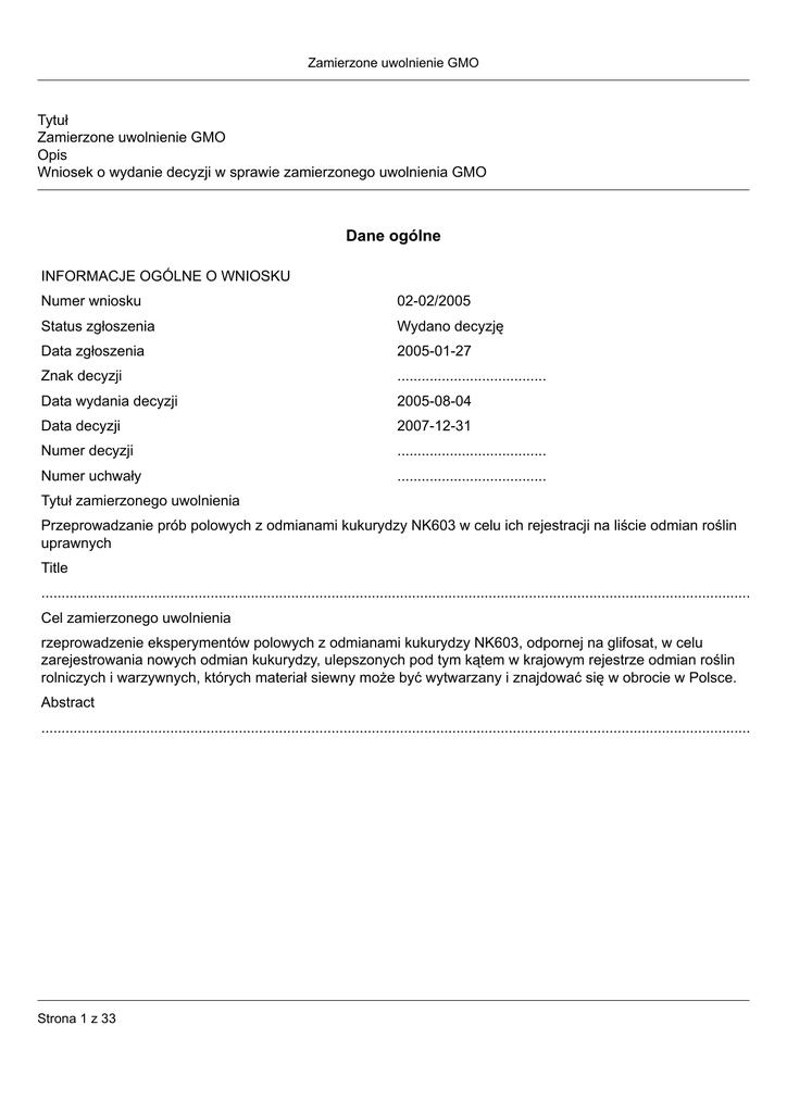 Zamierzone uwolnienie GMO Tytuł Zamierzone uwolnienie GMO Opis Wniosek o wydanie decyzji w sprawie zamierzonego uwolnienia GMO Dane ogólne INFORMACJE OGÓLNE O WNIOSKU Numer wniosku 02-02/2005 Status zgłoszenia Wydano decyzję Data zgłoszenia 2005-01-27 Znak decyzji ..................................... Data wydania decyzji 2005-08-04 Data decyzji 2007-12-31 Numer decyzji ..................................... Numer uchwały ..................................... Tytuł zamierzonego uwolnienia Przeprowadzanie prób polowych z odmianami kukurydzy NK603 w celu ich rejestracji na liście odmian roślin uprawnych Title ................................................................................................................................................................................ Cel zamierzonego uwolnienia rzeprowadzenie eksperymentów polowych z odmianami kukurydzy NK603, odpornej na glifosat, w celu zarejestrowania nowych odmian kukurydzy, ulepszonych pod tym kątem w krajowym rejestrze odmian roślin rolniczych i warzywnych, których materiał siewny może być wytwarzany i znajdować się w obrocie w Polsce. Abstract ................................................................................................................................................................................ Strona 1 z 33 Zamierzone uwolnienie GMO Użytkownik 1.INFORMACJE O UŻYTKWONIKU GMO I OSOBACH ODPOWIEDZIALNYCH ZA PRZYGOTOWANIE I PRZEPROWADZENIE ZAMIERZONEGO UWOLNIENIA 1.1. Nazwa i siedziba lub nazwisko i adres użytkownika GMO Dane osoby prawnej Nazwa użytkownika Pioneer Hi-Bred Services GmbH Przedstawicielstwo w Polsce Kod pocztowy 62-080 Miejscowość Swadzim Ulica ul. Poznańska Numer budynku 16 Numer lokalu ..................................... Adres e-mail [email protected] Telefon (61) 8162068 Faks (61) 8162068 Dane osoby fizycznej Imię ..................................... Nazwisko ..................................... Kod pocztowy ..................................... Miejscowość ..................................... Ulica ..................................... Numer budynku ..................................... Numer lokalu ..................................... Adres e-mail ..................................... Telefon ..................................... Faks ..................................... 1.2. Imię i nazwisko oraz informacja o kwalifikacjach fachowych osoby (osób) odpowiedzialnej za przygotowanie i przeprowadzenie zamierzonego uwolnienia GMO do środowiska Dane osoby odpowiedzialnej Tytuł naukowy Imię pracownika Tomasz Nazwisko pracownika Sulewski Telefon 8162068, Faks 8162068, Strona 2 z 33 Zamierzone uwolnienie GMO Adres e-mail [email protected] Kwalifikacje zawodowe pracownika Dyrektor Przedstawicielstwa Tytuł naukowy Imię pracownika Zdzisław Nazwisko pracownika Stępień Telefon 071/3126280 Faks 071/3125383 Adres e-mail ..................................... Kwalifikacje zawodowe pracownika personel stacji doświadczalnych Centralnego Ośrodka badania Odmian Roślin Uprawnych (COBORU) w Słupi Wielkiej Tytuł naukowy Imię pracownika Norbert Nazwisko pracownika Styrc Telefon 032/2334187 Faks 032/2334187 Adres e-mail ..................................... Kwalifikacje zawodowe pracownika personel stacji doświadczalnych Centralnego Ośrodka badania Odmian Roślin Uprawnych (COBORU) w Słupi Wielkiej Tytuł naukowy Imię pracownika Wiesław Nazwisko pracownika Makowski Telefon 061/2834591 Faks 061/2834591 Adres e-mail ..................................... Kwalifikacje zawodowe pracownika personel stacji doświadczalnych Centralnego Ośrodka badania Odmian Roślin Uprawnych (COBORU) w Słupi Wielkiej Tytuł naukowy Imię pracownika Strona 3 z 33 Maria Zamierzone uwolnienie GMO Nazwisko pracownika Kozioł Telefon 017/5813194 Faks 017/5813194 Adres e-mail ..................................... Kwalifikacje zawodowe pracownika personel stacji doświadczalnych Centralnego Ośrodka badania Odmian Roślin Uprawnych (COBORU) w Słupi Wielkiej Tytuł naukowy Imię pracownika Julia Nazwisko pracownika Tokarczyk Telefon 012/2858881 Faks 012/2858781 Adres e-mail ..................................... Kwalifikacje zawodowe pracownika personel stacji doświadczalnych Centralnego Ośrodka badania Odmian Roślin Uprawnych (COBORU) w Słupi Wielkiej Strona 4 z 33 Zamierzone uwolnienie GMO Uwolnienie 2. INFORMACJE O ZAMIERZONYM UWOLNIENIU GMO DO ŚRODOWISKA a) Tytuł zamierzonego uwolnienia GMO do środowiska Przeprowadzanie prób polowych z odmianami kukurydzy NK603 w celu ich rejestracji na liście odmian roślin uprawnych Title ................................................................................................................................................................................ b) Cel zamierzonego uwolnienia GMO do środowiska i krótkie streszczenie rzeprowadzenie eksperymentów polowych z odmianami kukurydzy NK603, odpornej na glifosat, w celu zarejestrowania nowych odmian kukurydzy, ulepszonych pod tym kątem w krajowym rejestrze odmian roślin rolniczych i warzywnych, których materiał siewny może być wytwarzany i znajdować się w obrocie w Polsce. Abstract ................................................................................................................................................................................ Strona 5 z 33 Zamierzone uwolnienie GMO Biorca 3. INFORMACJE O GMO a) Charakterystyka biorcy; organizmu rodzicielskiego (o ile występuje) 3.1. Nazwa taksonomiczna Zea mays L. Jeżeli w powyższym słowniku wybrana została wartość "Żadne z powyższych" należy wypełnić pole: ..................................... 3.2. Taksonomia a) Królestwo: jądrowe (Eucariota) b) Podkrólestwo: rośliny (Phytobionta) c) Dział : ogranowce (Cormophyta) d) Typ (d. gromada): okrytozalążkowe (Magnoliophyta = Angiospermae) e) Klasa: jednoliścienne (Liliopsida = Monocotyledones) f) Rząd: wiechlinowce (trawowce) (Poales) g)