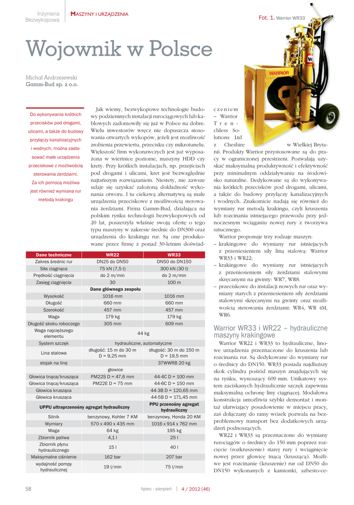 Inżynieria Bezwykopowa MASZYNY I URZĄDZENIA Fot. 1. Warrior WR33 Wojownik w Polsce Michał Andrzejewski Gamm-Bud sp. z o.o. Do wykonywania krótkich przecisków pod drogami, ulicami, a także do budowy przyłączy kanalizacyjnych i wodnych, można zastosować małe urządzenia przeciskowe z możliwością sterowania żerdziami. Za ich pomocą możliwa jest również wymiana rur metodą krakingu Dane techniczne Zakres średnic rur Siła ciągnąca Prędkość ciągnięcia Zasięg ciągnięcia Wysokość Długość Szerokość Waga Długość skoku roboczego Waga najcięższego elementu System szczęk Jak wiemy, bezwykopowe technologie budowy podziemnych instalacji rurociągowych lub kablowych zadomowiły się już w Polsce na dobre. Wielu inwestorów wręcz nie dopuszcza stosowania otwartych wykopów, jeżeli jest możliwość zrobienia przewiertu, przecisku czy mikrotunelu. Większość firm wykonawczych jest już wyposażona w wiertnice poziome, maszyny HDD czy krety. Przy krótkich instalacjach, np. przejściach pod drogami i ulicami, kret jest bezwzględnie najtańszym rozwiązaniem. Niestety, nie zawsze udaje się uzyskać założoną dokładność wykonania otworu. I tu ciekawą alternatywą są małe urządzenia przeciskowe z możliwością sterowania żerdziami. Firma Gamm-Bud, działająca na polskim rynku technologii bezwykopowych od 20 lat, poszerzyła właśnie swoją ofertę o tego typu maszyny w zakresie średnic do DN300 oraz urządzenia do krakingu rur. Są one produkowane przez firmę z ponad 30-letnim doświadWR22 DN25 do DN50 75 kN (7,5 t) do 2 m/min 30 Dane głównego zespołu 1016 mm 660 mm 457 mm 179 kg 305 mm WR33 DN50 do DN150 300 kN (30 t) do 2 m/min 100 m 1016 mm 660 mm 457 mm 179 kg 609 mm 44 kg hydrauliczne, automatyczne długość: 15 m do 30 m długość: 30 m do 150 m Lina stalowa D = 9,25 mm D = 19,5 mm stojak na linę 37WWRB 20 kg głowice Głowica tnąca/krusząca PM22S D = 47,6 mm 44-4C D = 100 mm Głowica tnąca/krusząca PM22E D = 75 mm 44-6C D = 150 mm Głowica krusząca 44-3B D = 120,65 mm Głowica krusząca 44-5B D = 171,45 mm PPU przenośny agregat UPPU ultraprzenośny agregat hydrauliczny hydrauliczny Silnik benzynowy, Kohler 7 KM benzynowy, Honda 20 KM Wymiary 570 x 490 x 435 mm 1016 x 914 x 762 mm Waga 64 kg 195 kg Zbiornik paliwa 4,1 l 25 l Zbiornik płynu 15 l 40 l hydraulicznego Maksymalne ciśnienie 162 bar 207 bar wydajność pompy 19 l/min 75 l/min hydraulicznej 58 lipiec - sierpień 4 / 2012 [46] czeniem – Warrior T r e n chless Solutions Ltd z Cheshire w Wielkiej Brytanii. Produkty Warrior przystosowane są do pracy w ograniczonej przestrzeni. Pozwalają uzyskać maksymalną produktywność i efektywność przy minimalnym oddziaływaniu na środowisko naturalne. Dedykowane są do wykonywania krótkich przecisków pod drogami, ulicami, a także do budowy przyłączy kanalizacyjnych i wodnych. Znakomicie nadają się również do wymiany rur metodą krakingu, czyli kruszenia lub rozcinania istniejącego przewodu przy jednoczesnym wciąganiu nowej rury z tworzywa sztucznego. Warrior proponuje trzy rodzaje maszyn: – krakingowe do wymiany rur istniejących z przeniesieniem siły liną stalową: Warrior WR33 i WR22; – krakingowe do wymiany rur istniejących z przeniesieniem siły żerdziami stalowymi skręcanymi na gwinty: WR7, WR8. – przeciskowe do instalacji nowych rur oraz wymiany starych z przeniesieniem siły żerdziami stalowymi skręcanymi na gwinty oraz możliwością sterowania żerdziami: WR4, WR 4M, WR6. Warrior WR33 i WR22 – hydrauliczne maszyny krakingowe Warrior WR22 i WR33 to hydrauliczne, linowe urządzenia przeznaczone do kruszenia lub rozcinania rur. Są dedykowane do wymiany rur o średnicy do DN150. WR33 posiada najdłuższy skok cylindra pośród maszyn znajdujących się na rynku, wynoszący 609 mm. Unikatowy system zaciskanych hydraulicznie szczęk zapewnia maksymalną ochronę liny ciągnącej. Modułowa konstrukcja umożliwia szybki demontaż i montaż ułatwiający posadowienie w miejscu pracy, zaś dołączany do ramy wózek pozwala na bezproblemowy transport bez dodatkowych urządzeń podnoszących. WR22 i WR33 są przeznaczone do wymiany rurociągów o średnicy do 150 mm poprzez rozcięcie (rozkruszenie) starej rury i wciągnięcie nowej przez głowicę tnącą (kruszącą). Możliwe jest rozcinanie (kruszenie) rur od DN50 do DN150 wykonanych z kamionki, azbesto-ce- MASZYNY I URZĄDZENIA Inżynieria Bezwykopowa Dane techniczne Średnice rur Siła ciągnąca/wpychająca Prędkość ciągnięcia/wpychania Zasięg WR4 WR6 DN25 do DN100 DN45 do DN200 200 kN (20 t) 400 kN (40 t) do 2,75 m/min do 2 m/s 50 do 100 m zależnie od warunków gruntowych 50 do 100 m zależnie od warunków gruntowych Dane głównego zespołu Wysokość 381 mm 431 mm Długość 1168,9 mm 1371,6 mm Szerokość 457 mm 546 mm Waga 170 kg 326,5 kg Długość skoku roboczego 254 mm 254 mm Średnica cylindra hydraulicznego 101,6 mm 152,4 mm System szczęk hydrauliczne, automatyczne hydrauliczne, automatyczne Głowice pilotujące Głowica pilotująca 39D1 przesunięcie 6,35 mm D = 57,3 mm 39D4 przesunięcie 6,35 mm D = 63,5 mm Głowica pilotująca 39D2 przesunięcie 9,5 mm D = 57,3 mm 39D5 przesunięcie 9,5 mm D = 63,5mm Głowica pilotująca 39D3 przesunięcie 12,7mm D = 57,3 mm 39D6 przesunięcie 12,7mm D = 63,5 mm Głowica pilotująca (Push Cap) 39A z płaską powierzchnią czołową D = 57,3 mm 39B z płaską powierzchnią czołową D = 57,3 mm 39RD-2 D=57,3 mm dedykowana do dużych zmian 39RD-B D=63,5 mm dedykowana do dużych zmian Głowica pilotująca (Redirect push Cap) kierunku kierunku Głowica pilotująca (Push Point) 40 bez przesunięcia D = 57,3 40B-1 bez przesunięcia D = 57,3 Głowice poszerzające Głowica poszerzająca/krusząca 44-2 D = 88,9 mm 44B 4 D = 88,9 mm Głowica poszerzająca/krusząca 44-3 D = 120,65 mm 44B 5 D = 120,65 mm Głowica poszerzająca/krusząca Dostępne inne wymiary 44B 6 D = 146,5 mm Żerdzie gwintowan